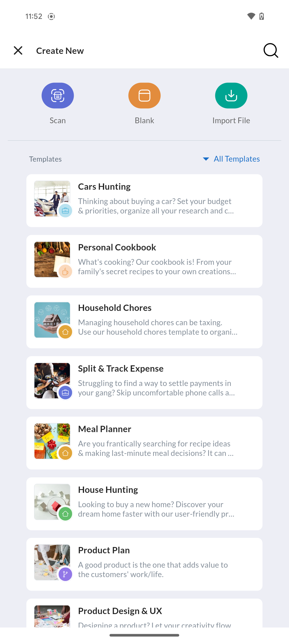 Scan: Scan documents or receipts directly from your camera, or upload an image from your gallery.