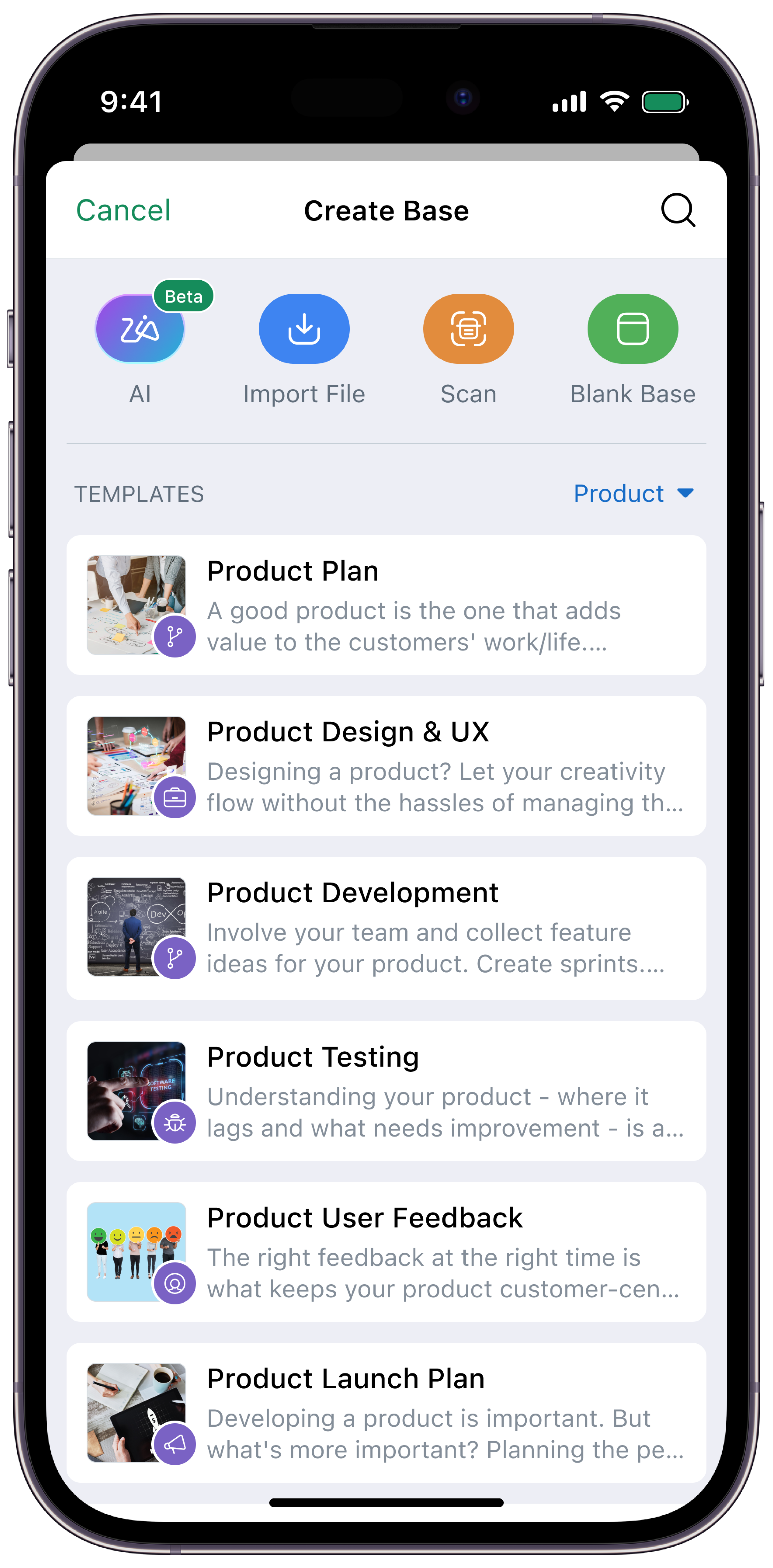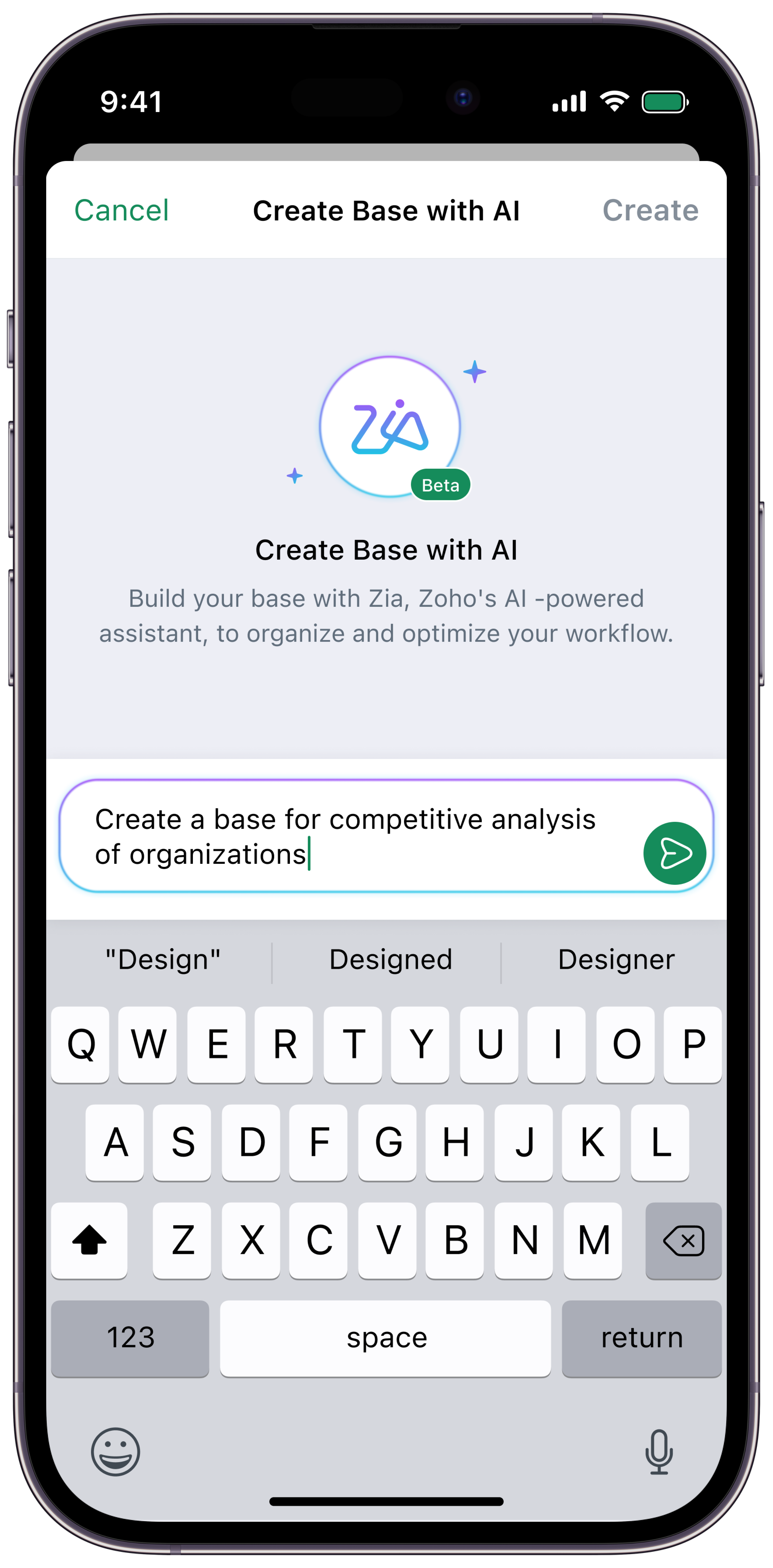 You can create customized bases that suit your workflow with just a simple prompt using Zoho's AI-powered assistant, Zia.