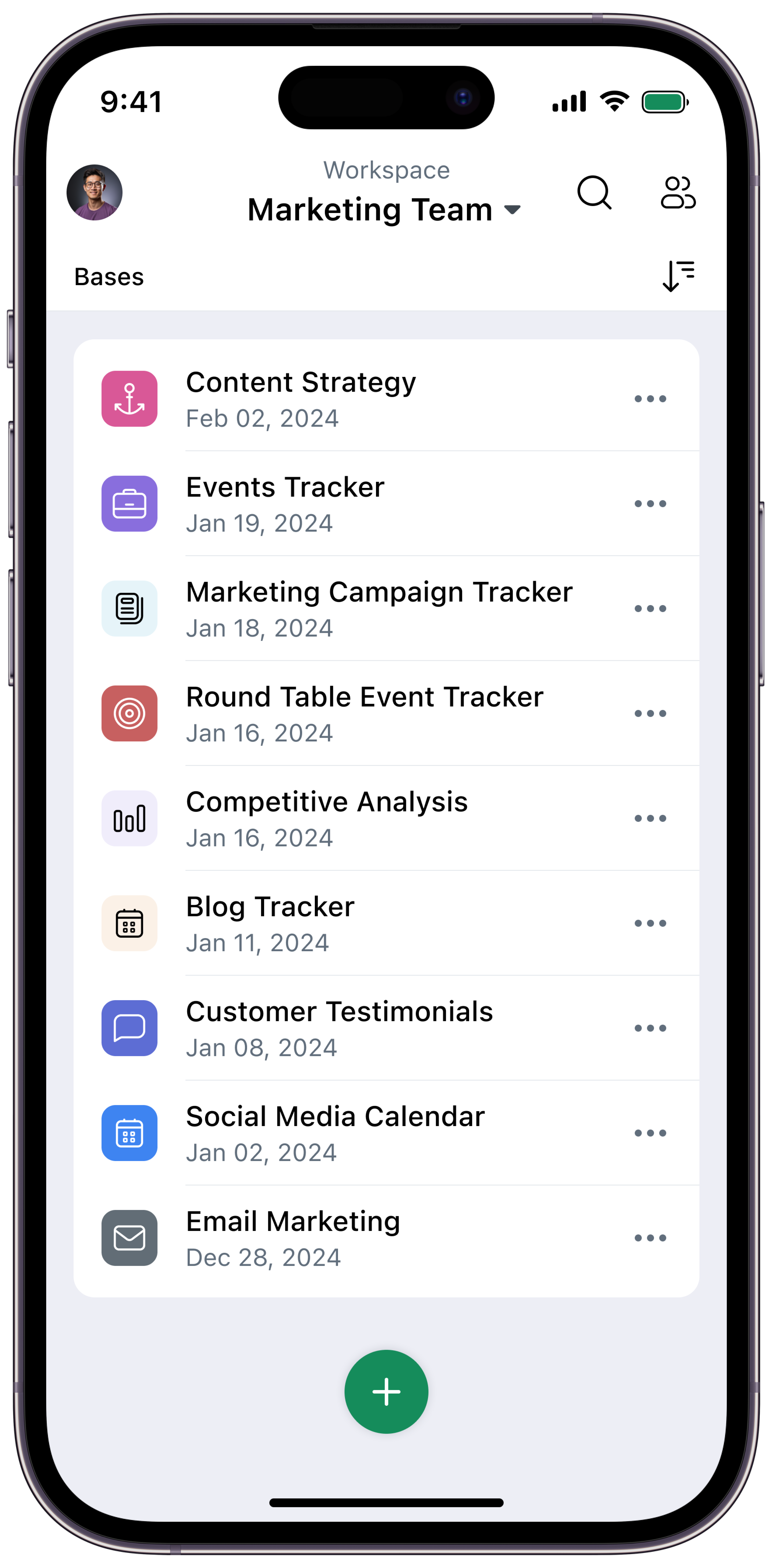 Navigate to the workspace where you want to create a base and click the + button to create a new base.