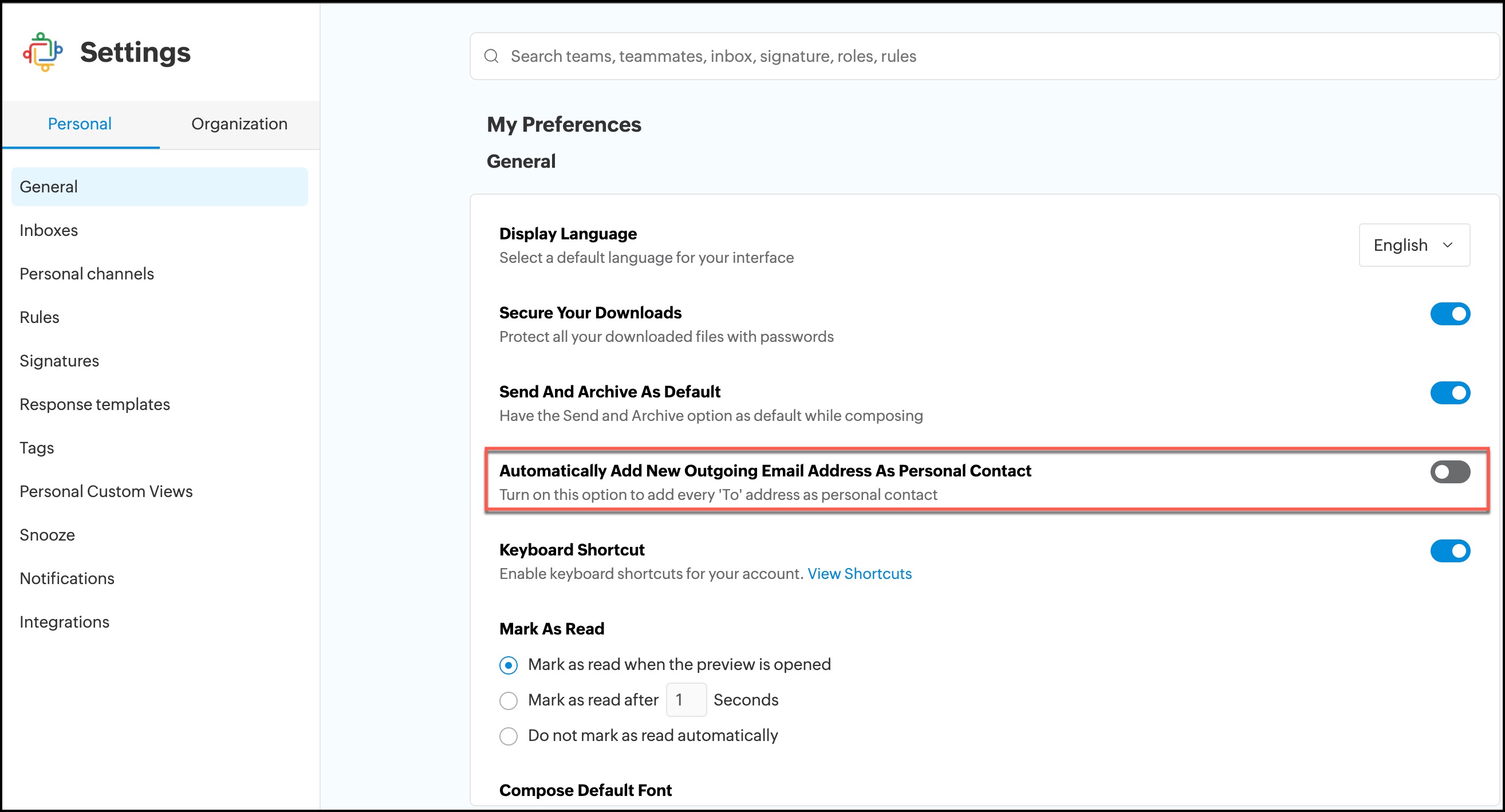 4. Turn on the option to automatically add new outgoing email address as a personal contact.