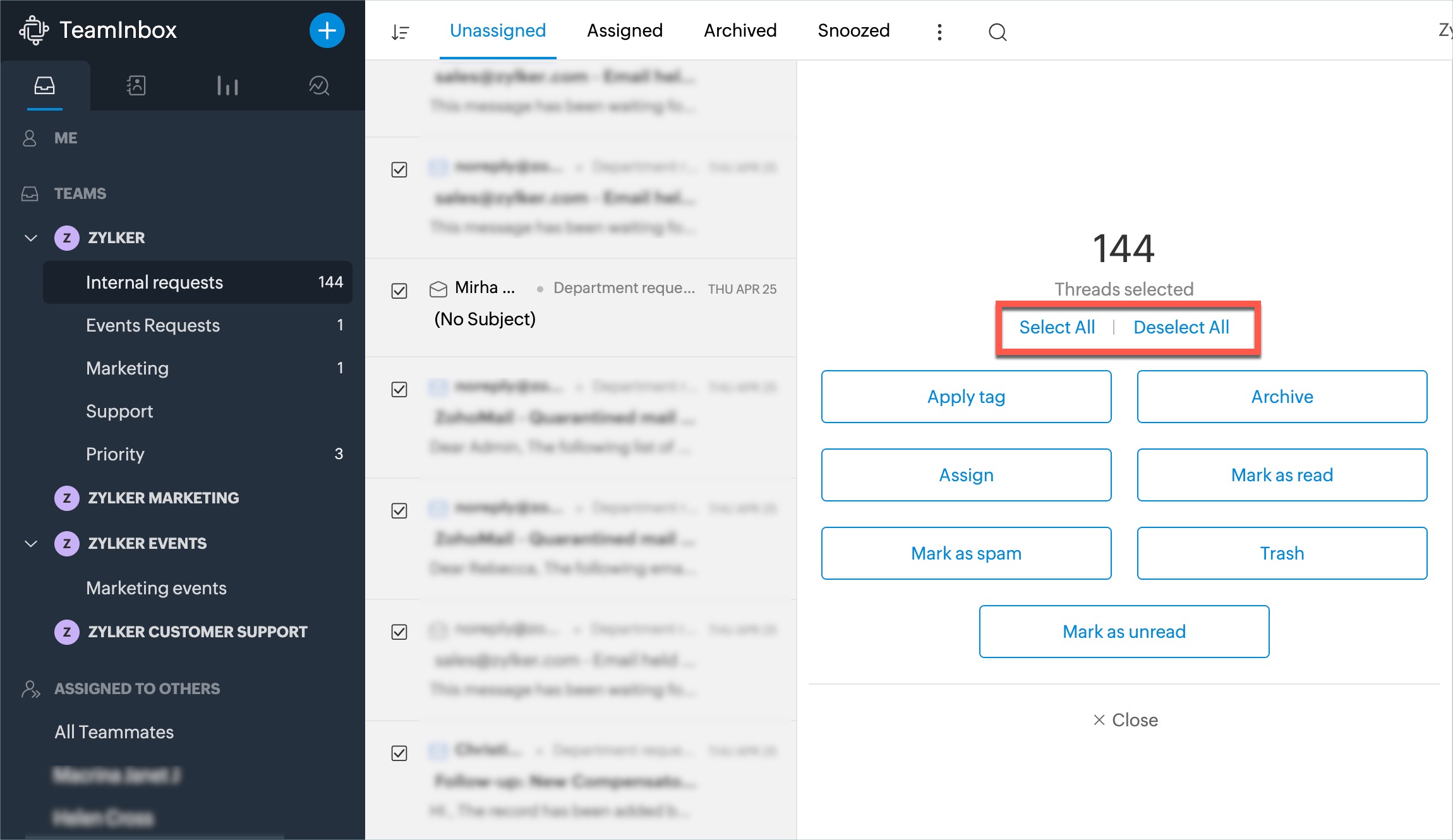 Can I I mark multiple threads as read/unread in Zoho TeamInbox?