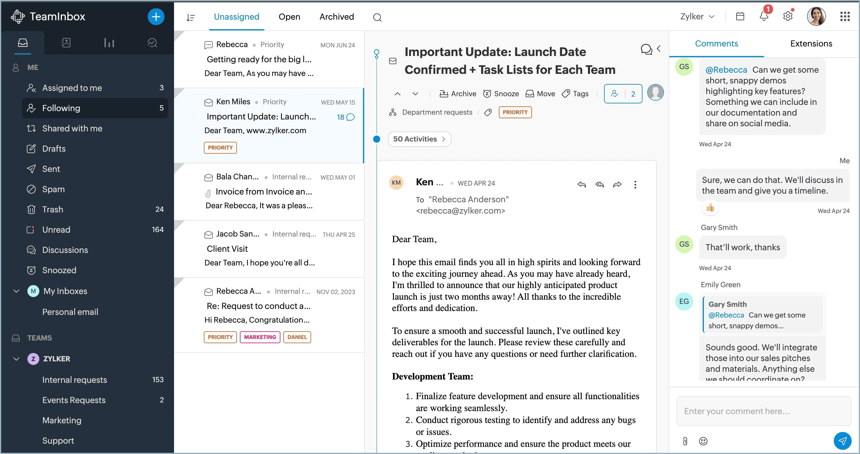 Zoho TeamInbox is a shared inbox tool that helps teams have better collaboration. Direct your group emails and other communication channels to Zoho TeamInbox and make it accessible to the entire team in one collaborative space. Connect with your team right from your inbox and conduct behind-the-screen discussions to always send out appropriate replies. Optimize work distribution efficiently and always stay in the same page with your teammates.