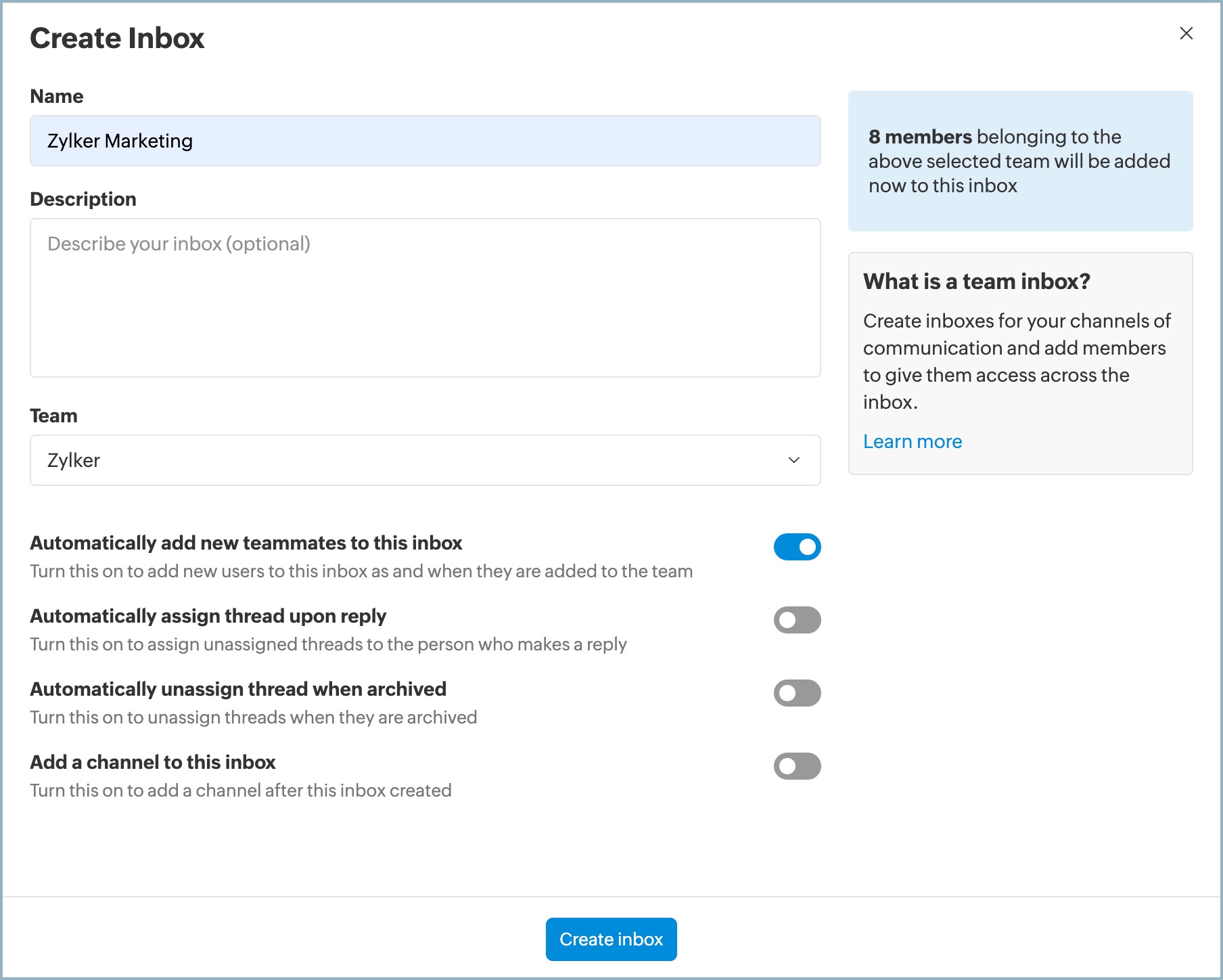 Learn more about creating shared inboxes in Zoho TeamInbox.
