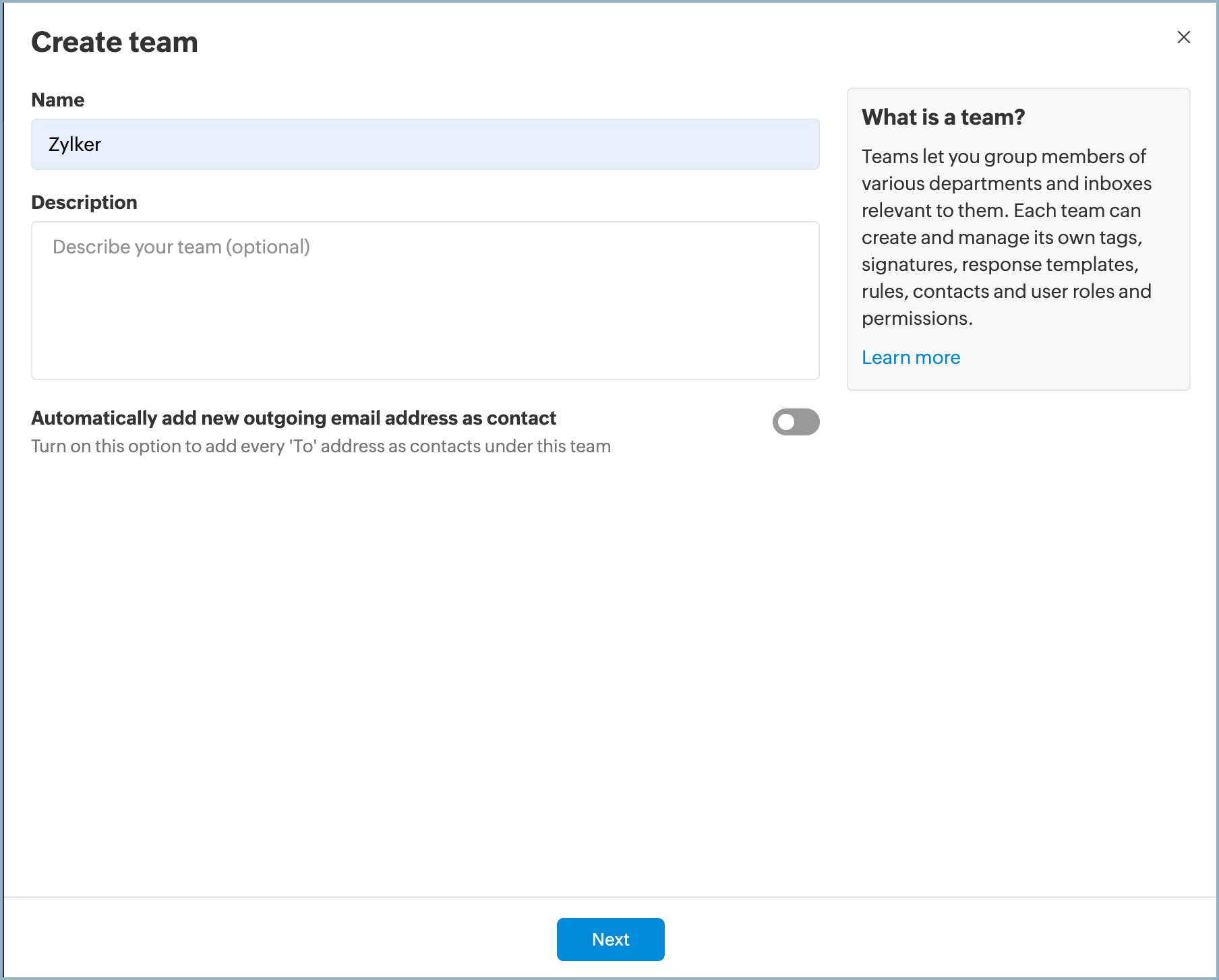 Zoho TeamInbox lets you create and manage multiple teams within one organization. Group people under teams and create inboxes specific to the team. Users can belong and work in multiple teams with different roles in each team. Create team in Zoho ...