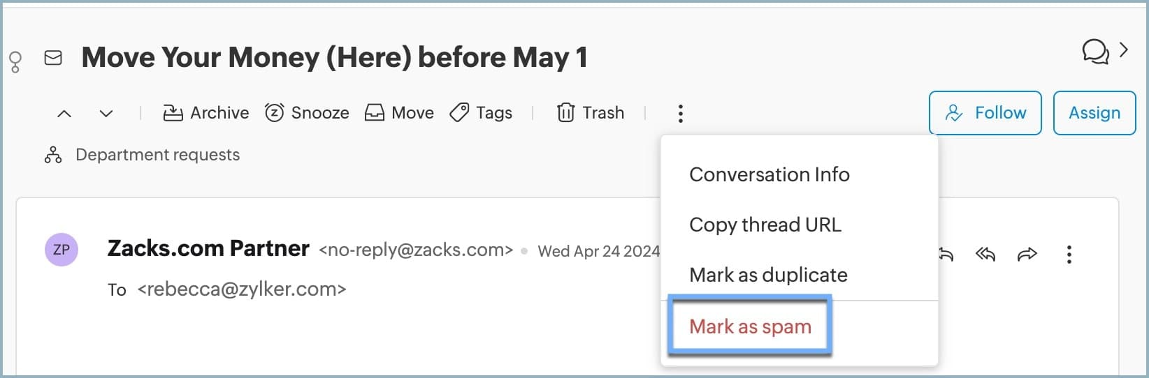 If you still notice Spam emails in your Inbox, use the mark as spam option to send the mail to the spam folder.