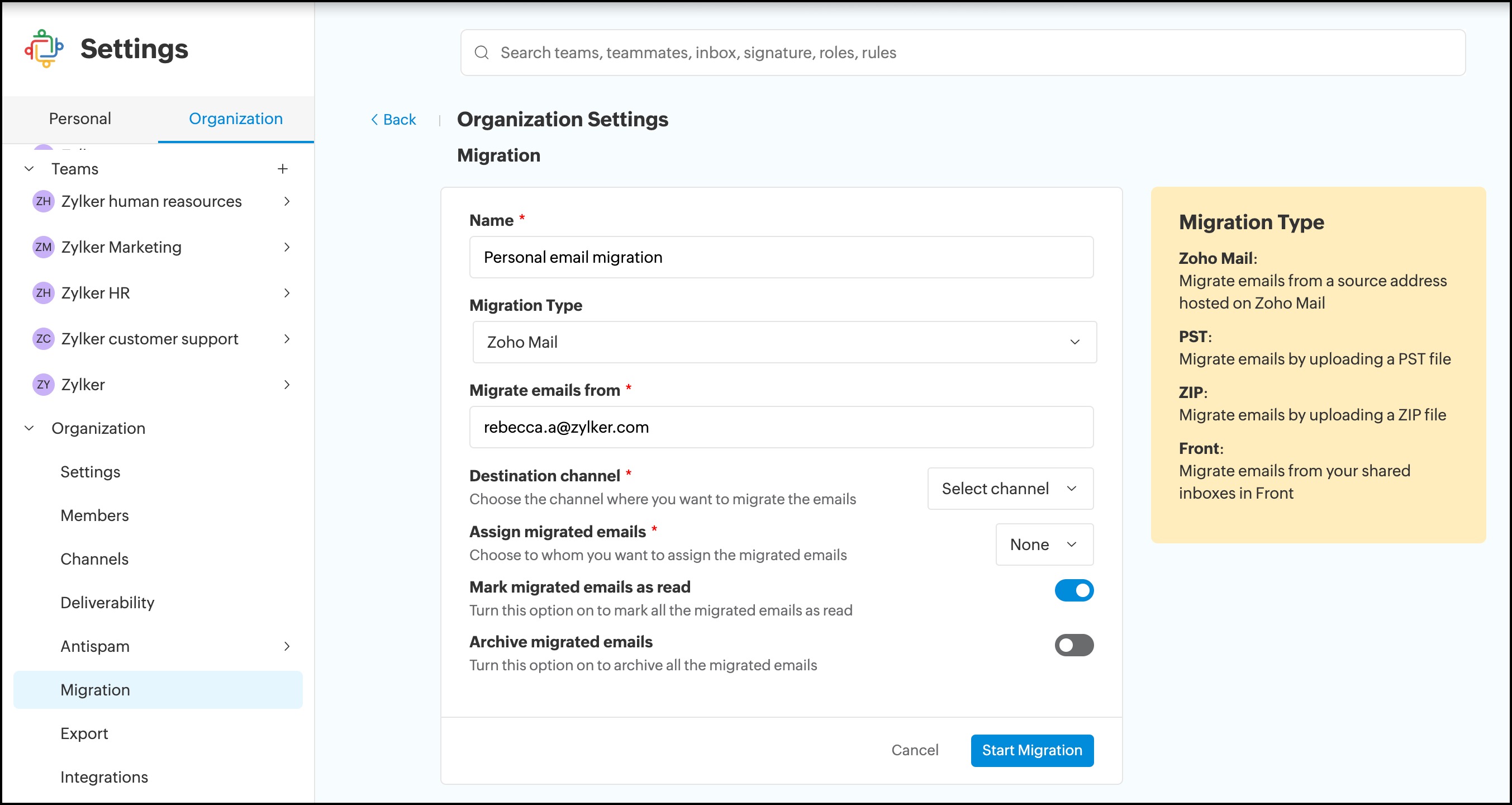 Migrate your emails to your shared inboxes or personal inbox in Zoho TeamInbox. Only the admin can migrate emails. Migrating emails from Zoho Mail Login to teaminbox.zoho.com. Click the Settings icon in the top right corner and select the ...