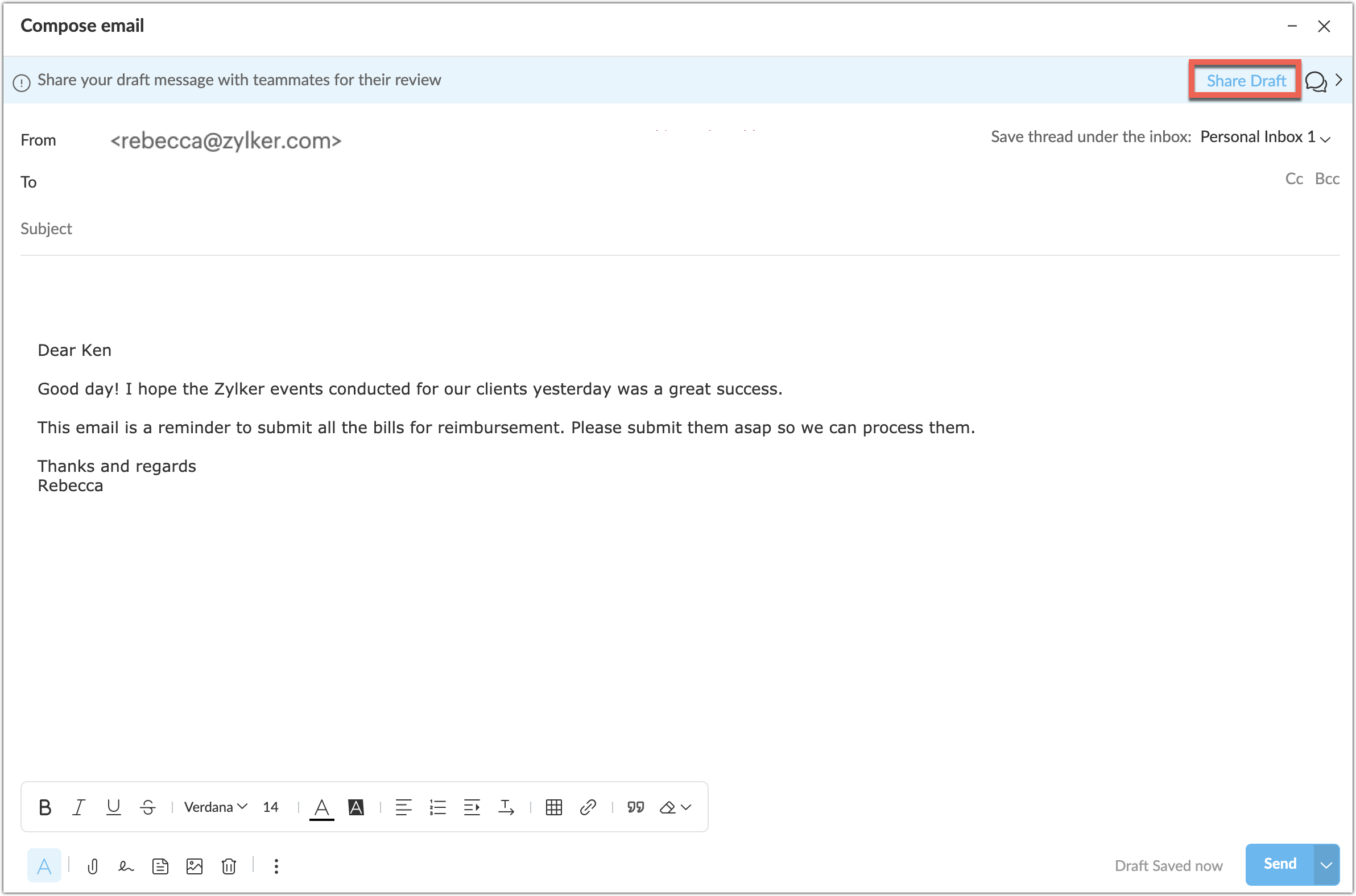Zoho TeamInbox lets you to compose an email and send it from your personal inbox. This way you don't have to go to another application every time to send out personal emails, you can manage them right from Zoho TeamInbox.
