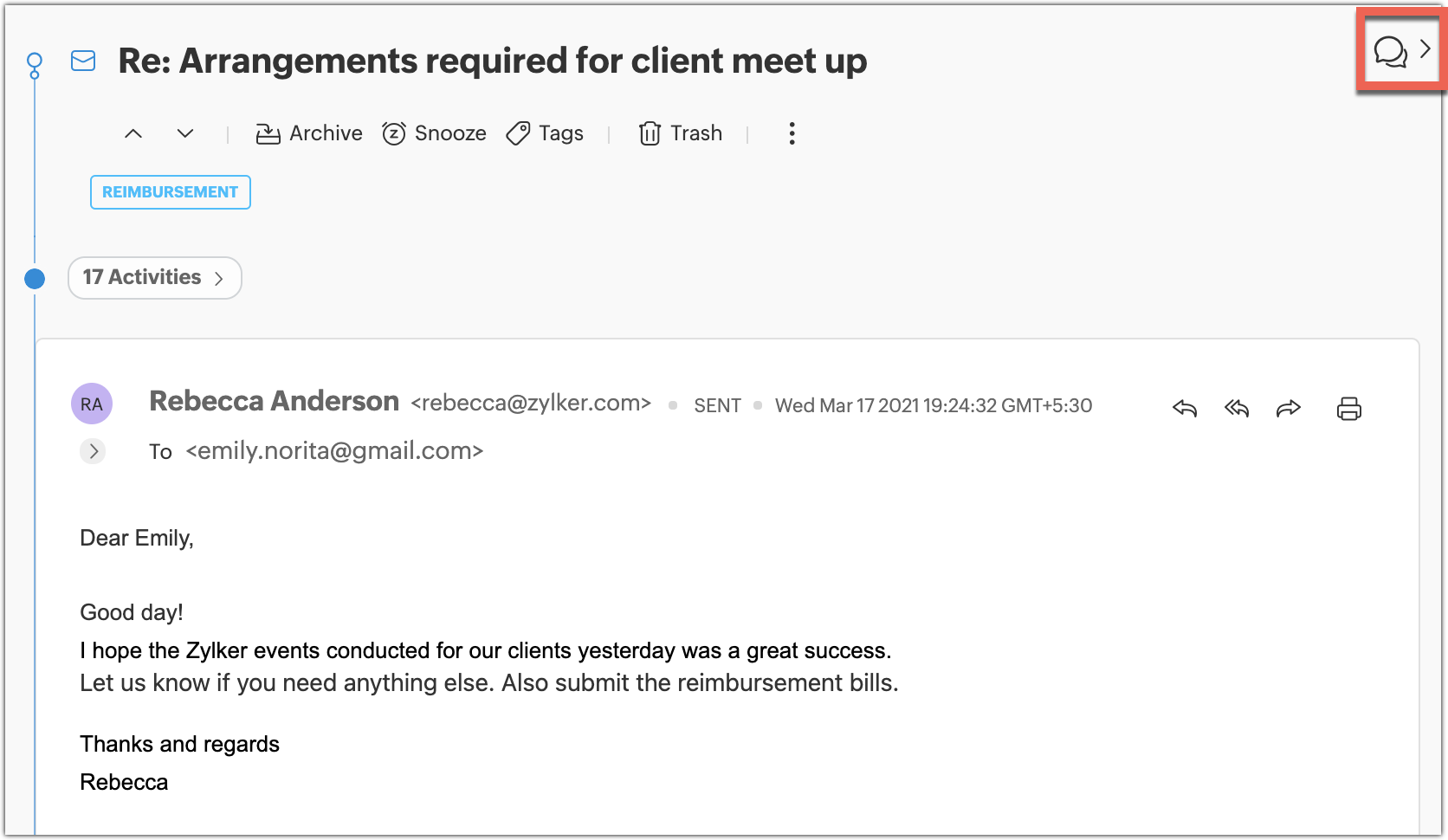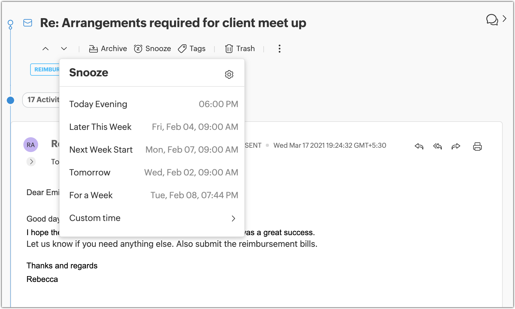 Click Snooze on a particular thread if the task in the thread is of less priority and can wait for a longer time, but you want to be reminded of it later. To snooze, navigate to the thread and click Snooze from the top bar. Select the time after which you want the thread to reappear in your inbox. The thread will be hidden from your inbox and be visible under your Snoozed view until the set time period.