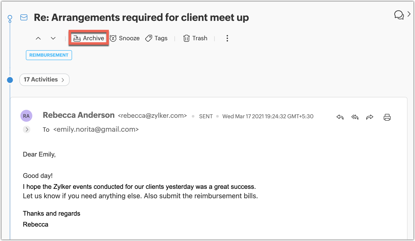 After you finish a particular task associated with an email or if the email does not need any work to be done, click Archive to archive the thread. This helps in moving one step closer towards achieving the goal of 'Inbox Zero'. To archive, navigate to the thread and click Archive from the top bar. You can also archive a thread while sending a reply by clicking Send and archive. When you archive a thread, it will be removed from the Open view of your inbox. If you want to reopen an archived thread, find the thread in your inbox under Archived view and click Unarchive from the top bar.
