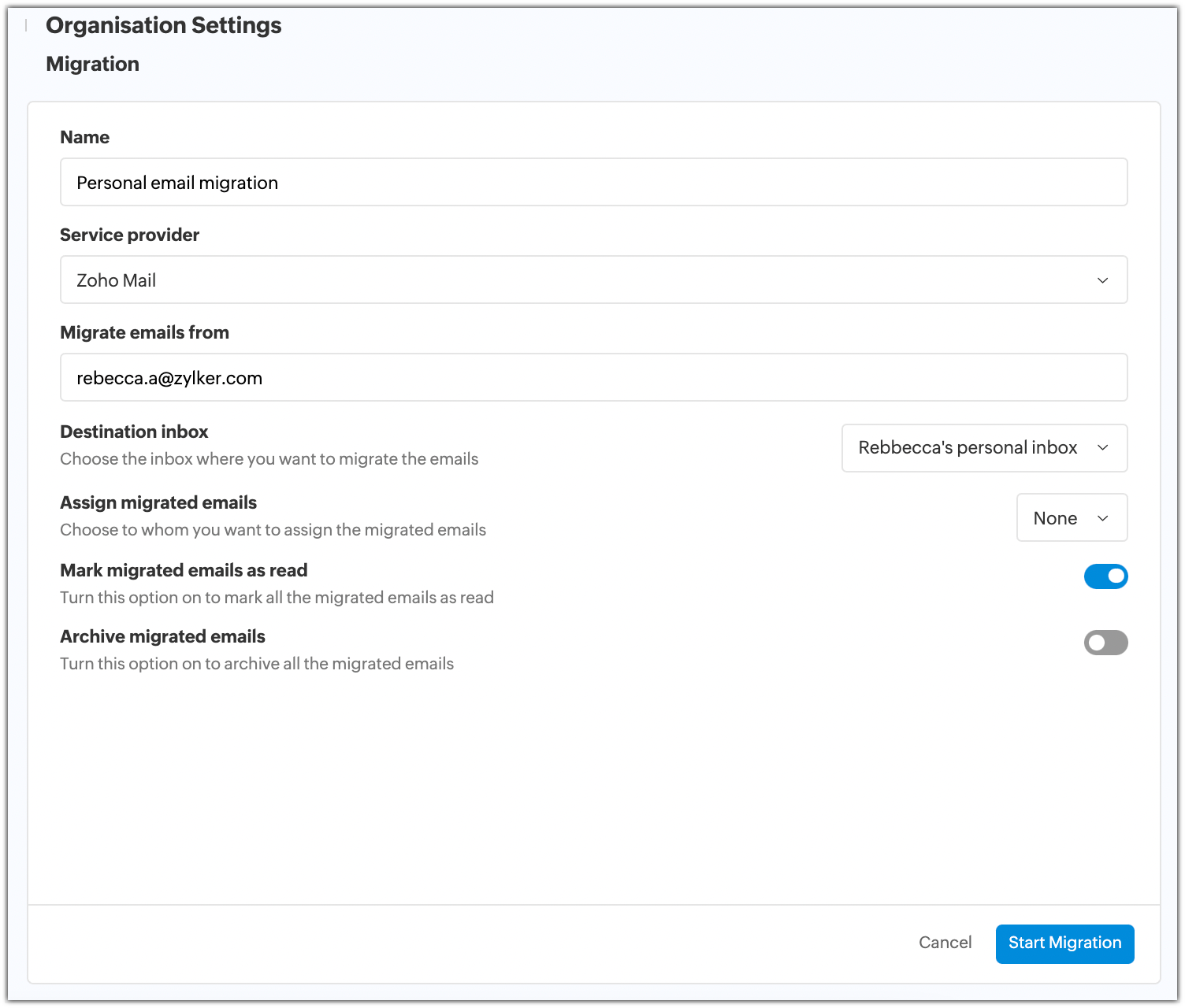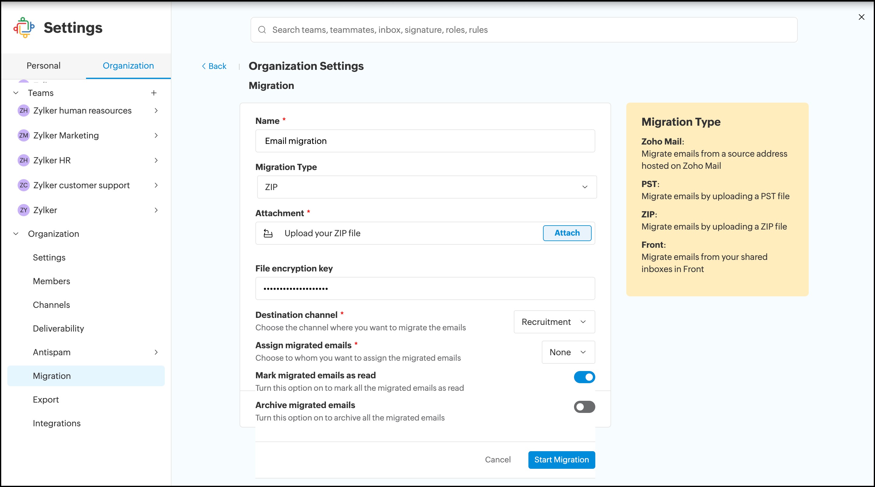 To migrate emails from Zoho Mail to Zoho TeamInbox Login to Zoho TeamInbox. Click the Settings icon in the top right corner and select the Organization tab. Navigate to the Migration section in the left menu. Click Create Migration. Enter a name for ...