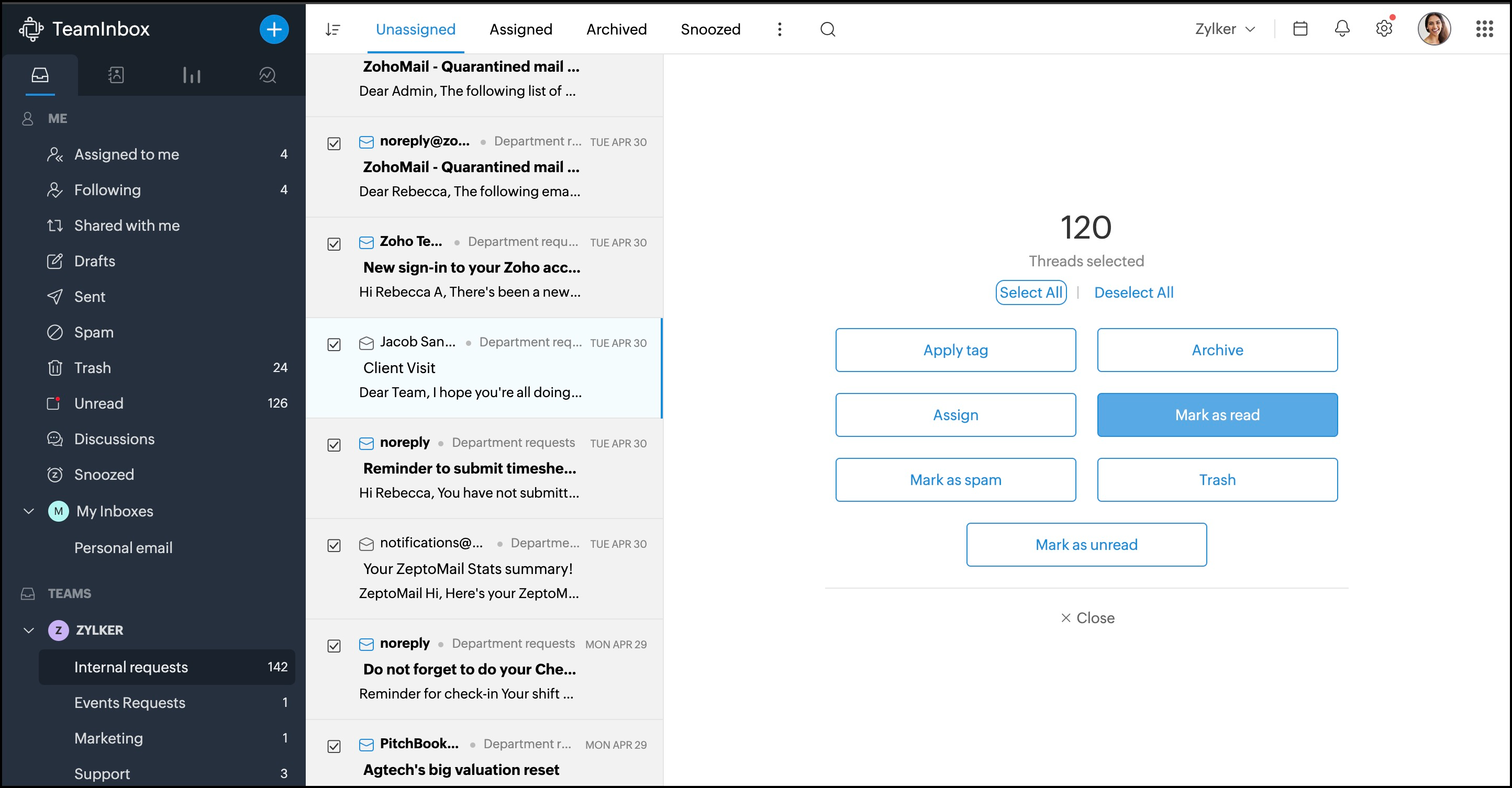 • Can I I mark multiple threads as read/unread in Zoho TeamInbox?
