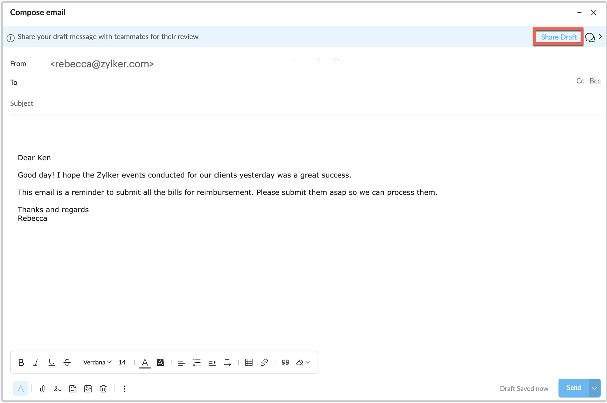 As you write your email, it will be automatically saved as draft until you send it. You can share this draft with your teammates for their review. Click Share Draft and the draft will be shared with your entire team. They can now make requests to edit your content. They can also share their suggestions using the comments section.
