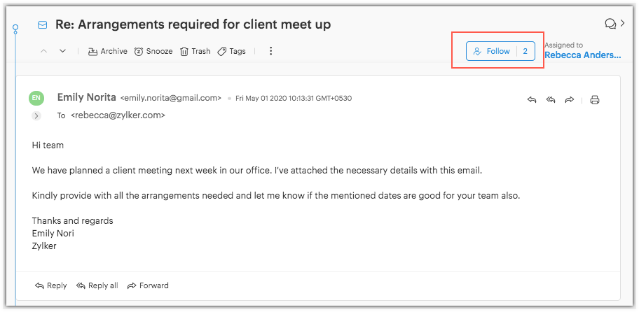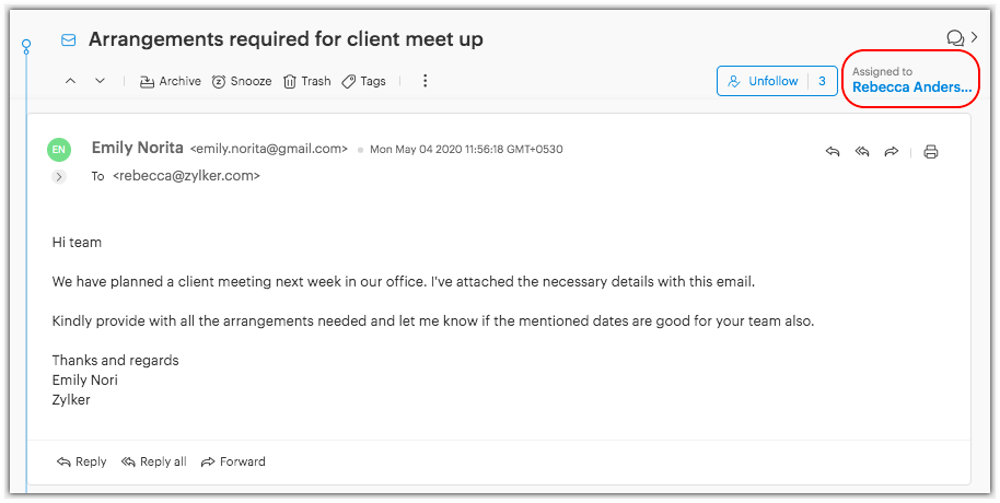 As and when a new conversation starts, you can assign the thread to the person responsible for it. This ensures that no message is ignored and will also help everyone in the team know who is working on what.