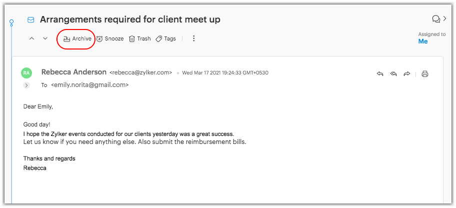 To assign, navigate to the thread and click Assign on the top-right corner and enter the name of the assignee in the search bar and select them to assign the thread. You can assign the thread to yourself by clicking Assign to me . This thread will now be visible under the assignee's Assigned to me view.