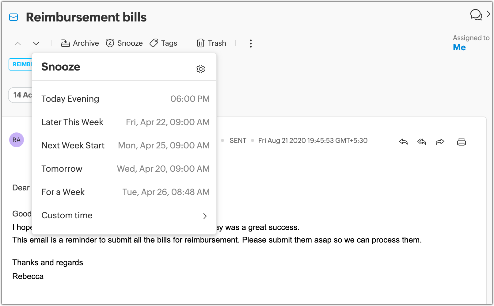 If you want to hide a specific thread from your inbox for a certain time period, you can snooze it and set a time for when you want it to reappear in your inbox. Snooze less important conversations so to concentrate on the most important ones at hand or snooze a thread to be reminded to follow up later.