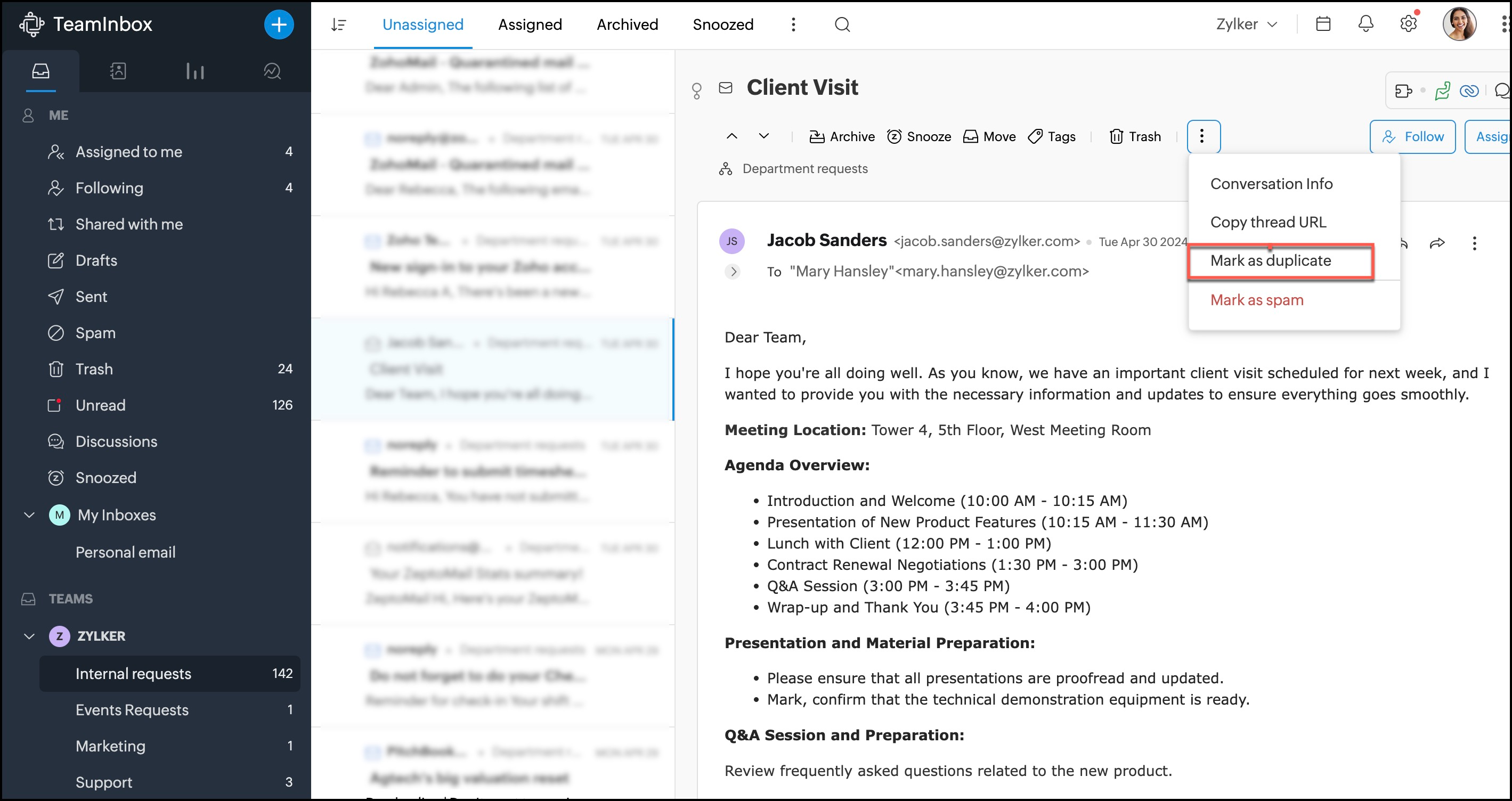 If you want to remove a thread from the open view of your inbox for a certain time period, you can snooze it and set a time for when you want it to reappear in your inbox. The thread will only be snoozed for you. 1. Login to Zoho TeamInbox and select ...