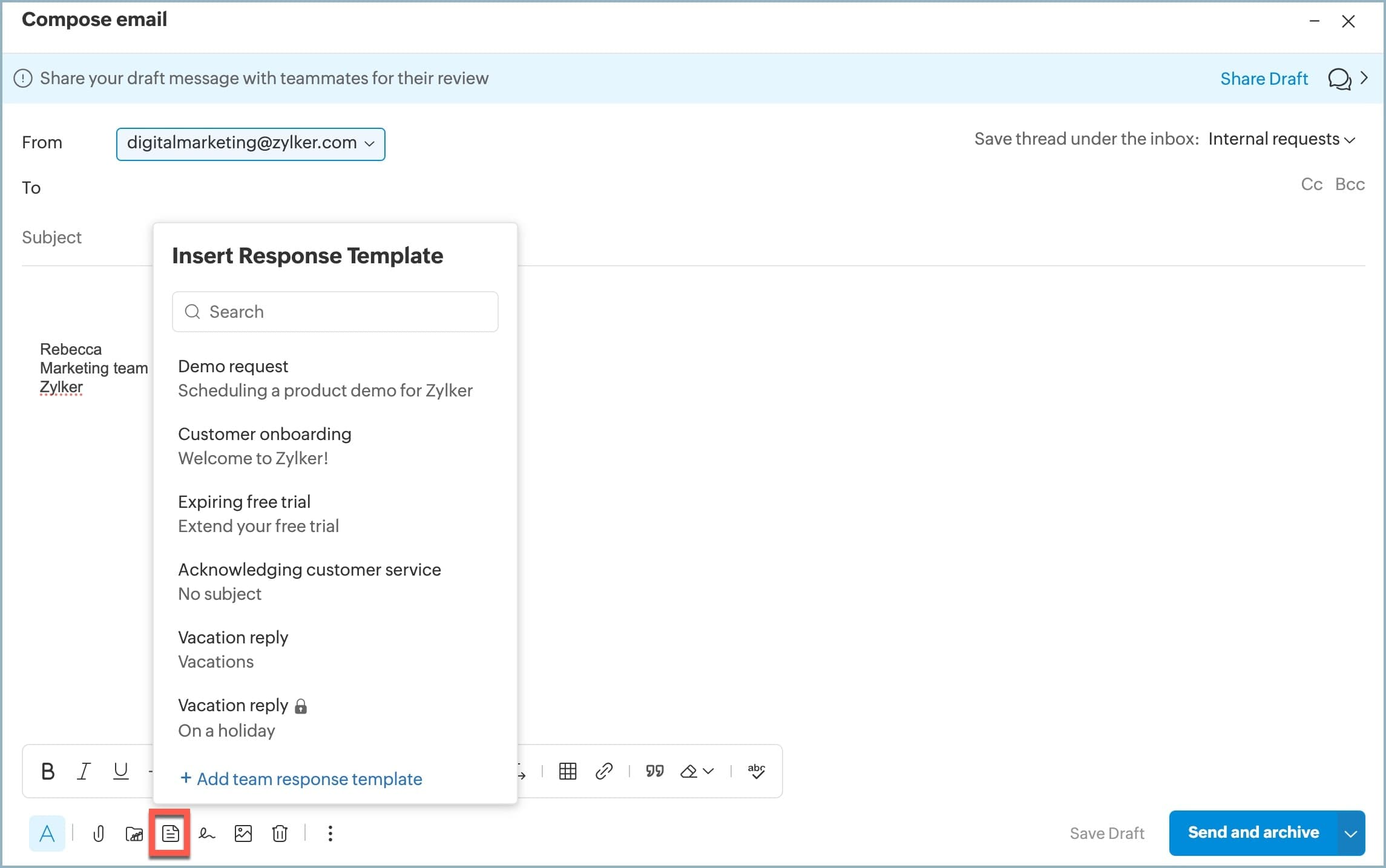If you want to use a template, you can easily pre-compose and save email templates that your entire team can use while responding to queries. You can use the template any number of times by clicking the insert template option while composing an ...