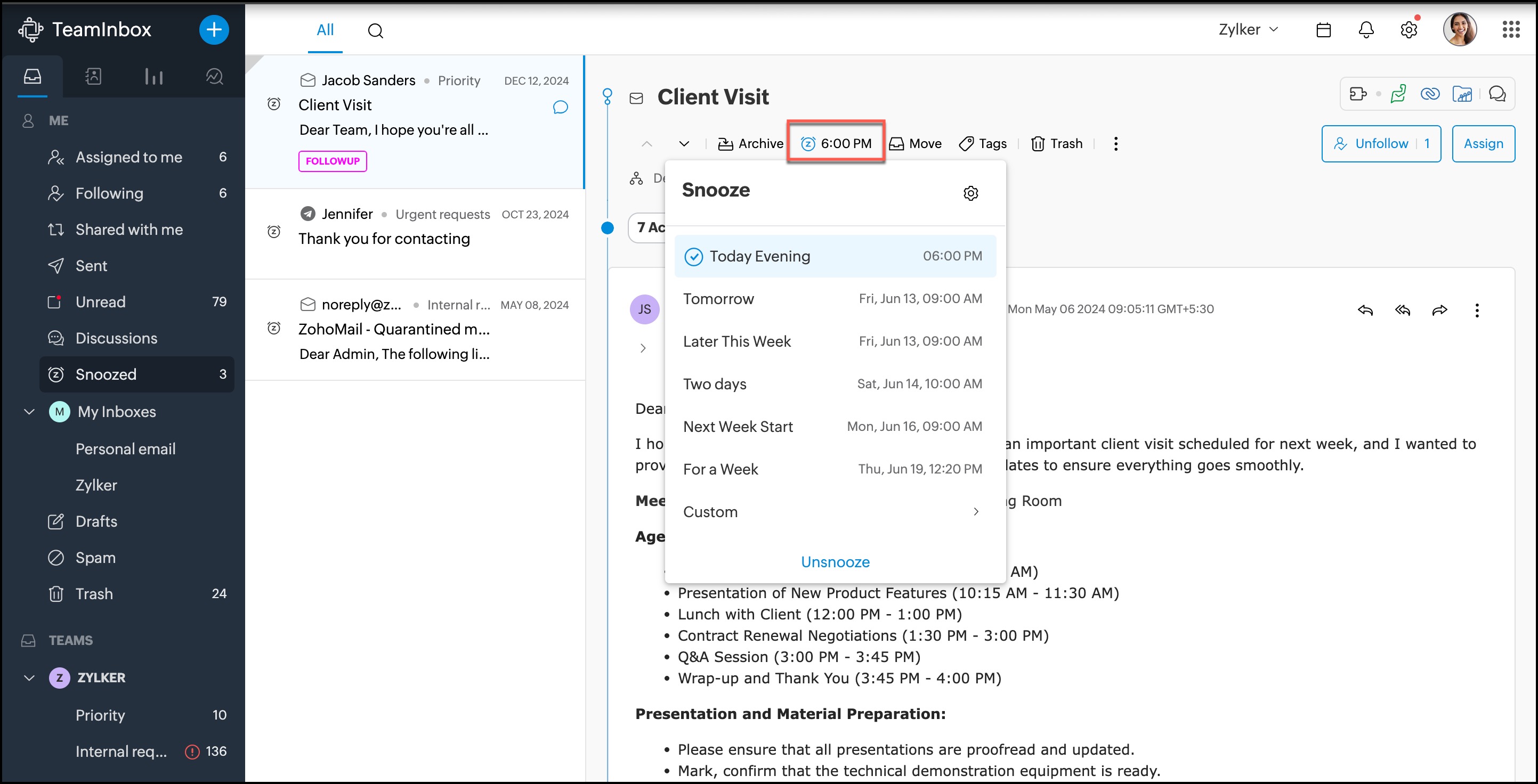 If you want to remove a thread from the open view of your inbox for a certain time period, you can snooze it and set a time for when you want it to reappear in your inbox. The thread will only be snoozed for you. 1. Login to Zoho TeamInbox and select ...