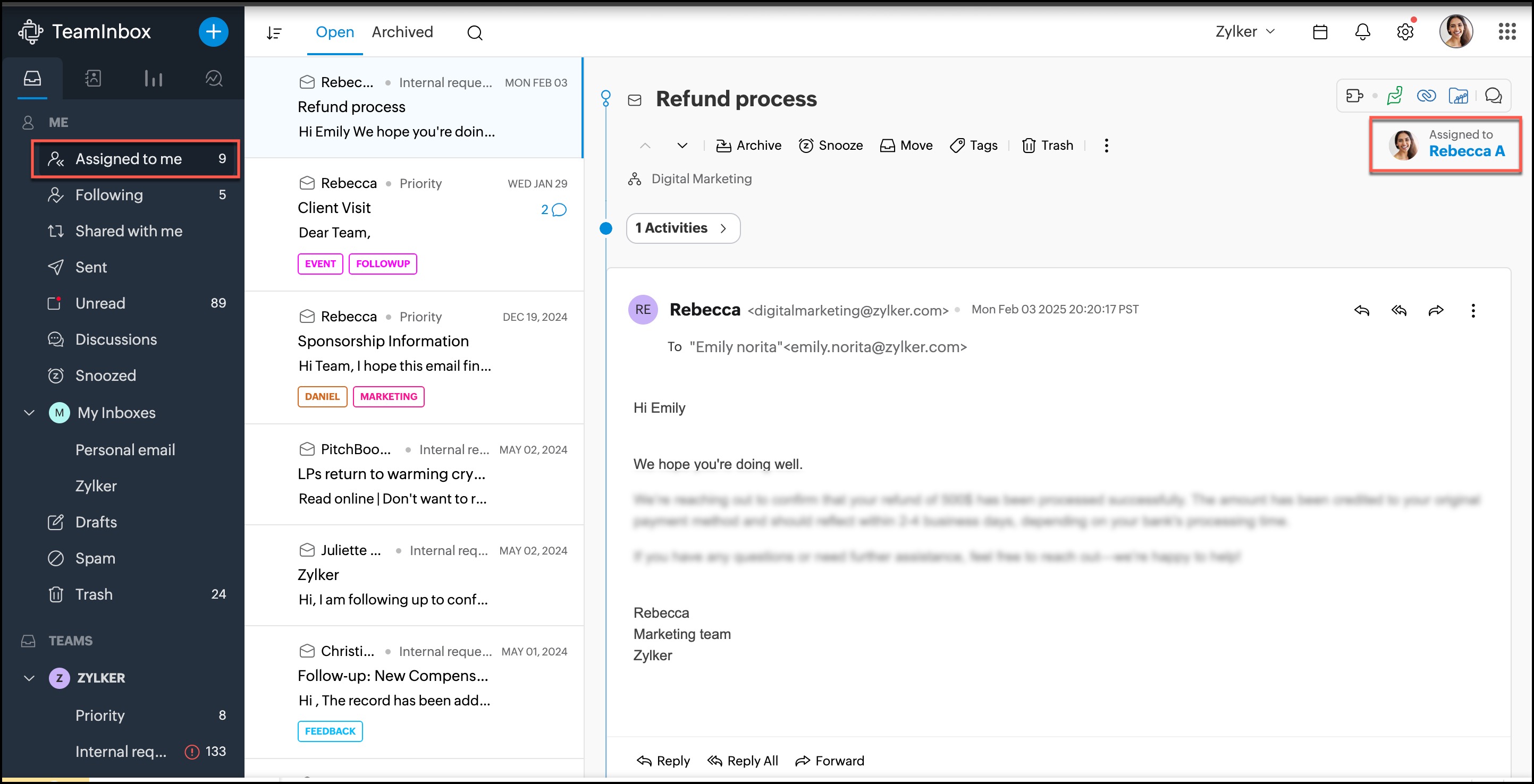 The “Assigned to me” view displays all the threads that are directly assigned to you. It helps you focus on conversations that require your attention. All threads in this view are grouped together in one place for easy monitoring.