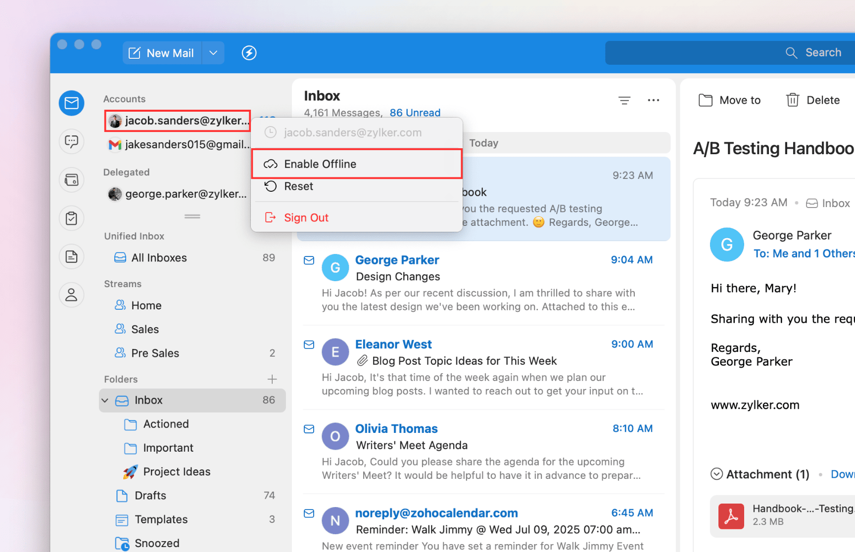 By default, the Offline Mode will be enabled in Trident for all your Zoho Mail accounts, and it must be turned on manually for your POP and IMAP accounts. This can sometimes increase disk space usage. To manage this storage impact, you can turn off offline mode.