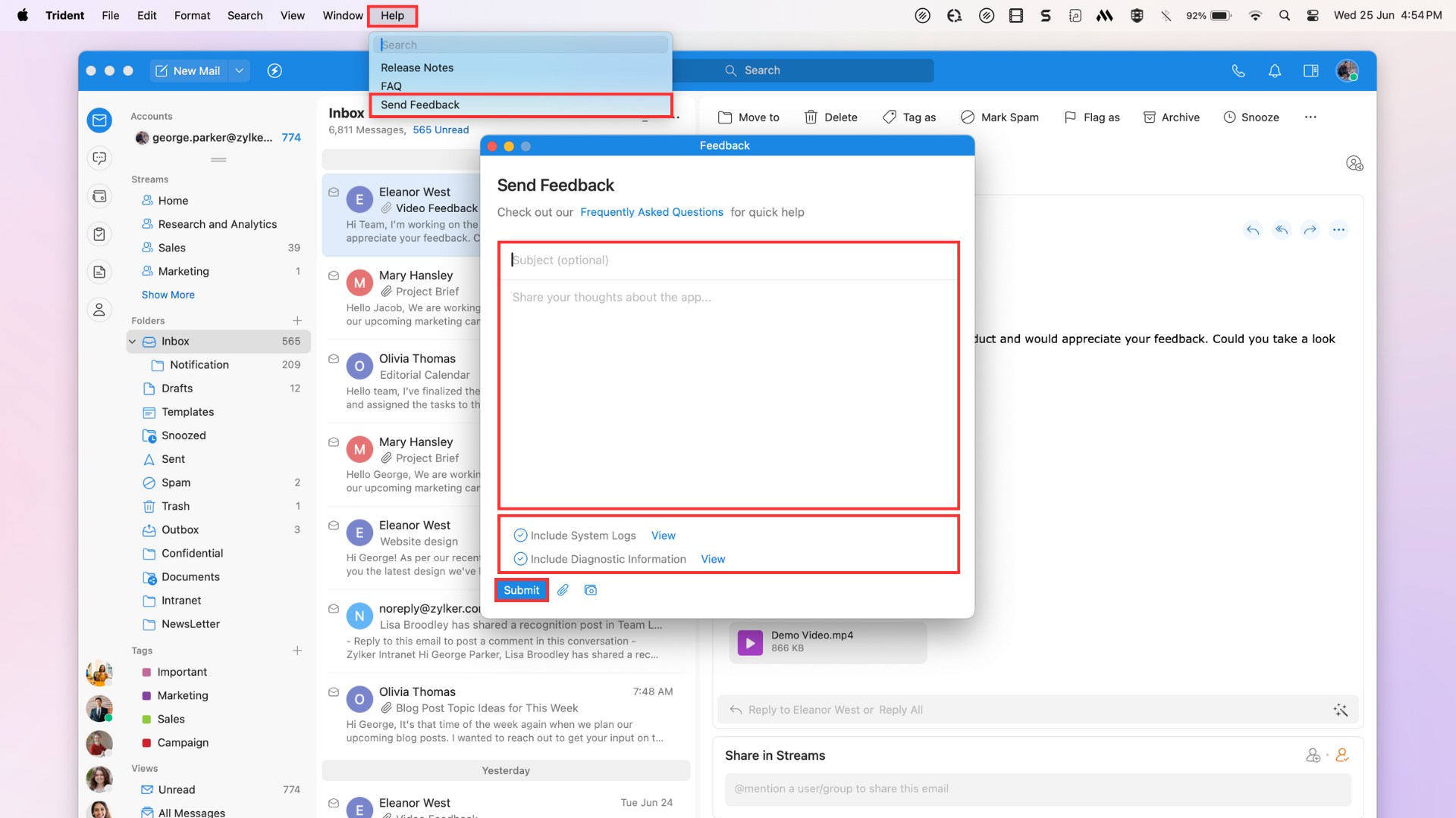 How do I send feedback with log files to report bugs in Trident (macOS)?