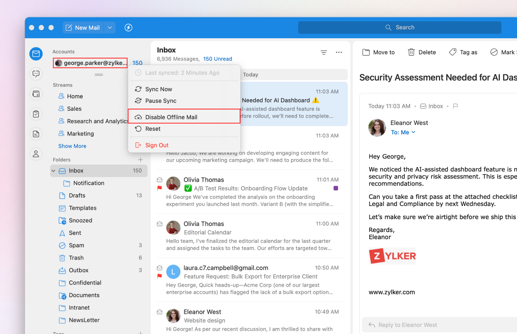 The app does not currently offer fine-grained options to manage offline storage for specific folders when email synchronization is enabled. However, the Disable Offline Mail option (Mail Account > right-click > Disable Offline Mail) will clear the downloaded emails from the database, free up space, and automatically pause sync.