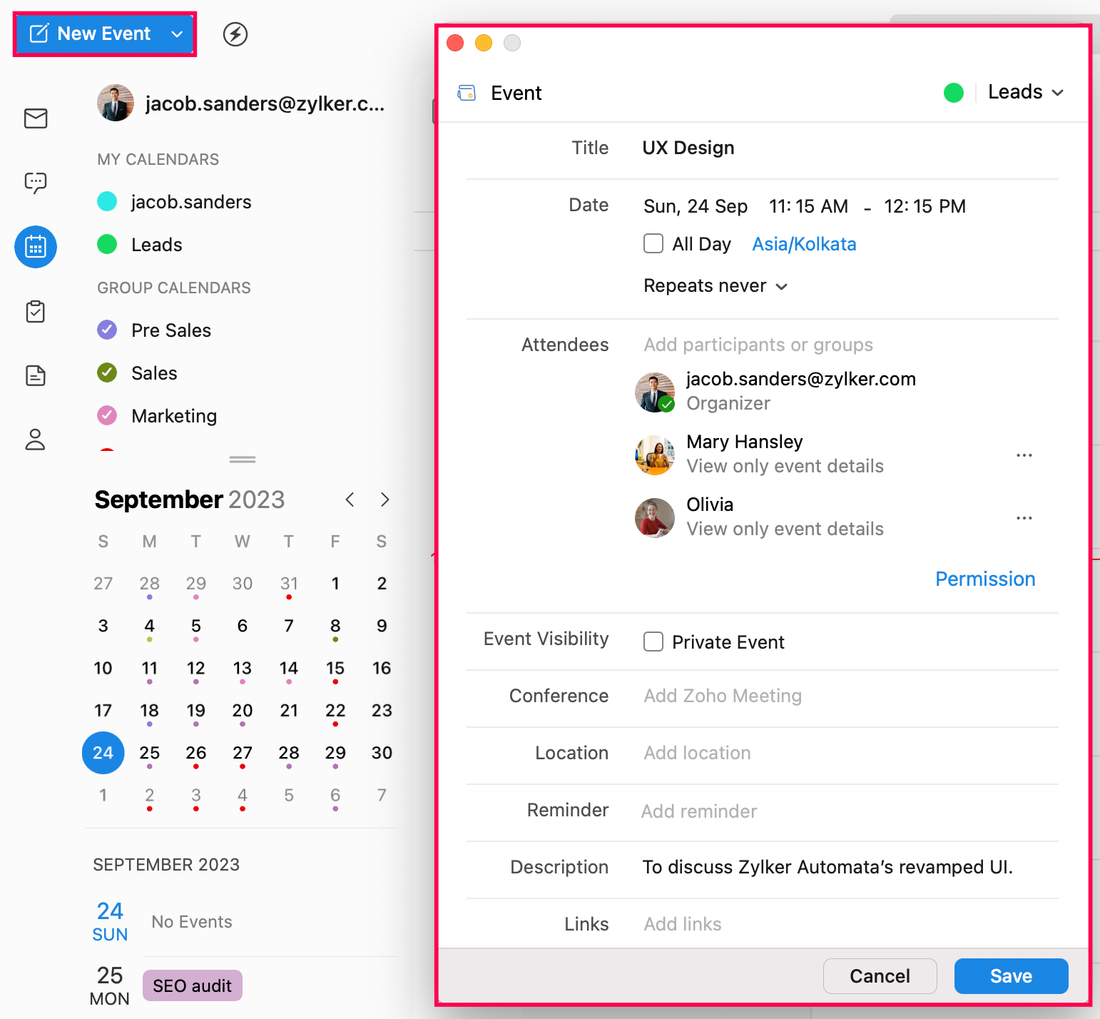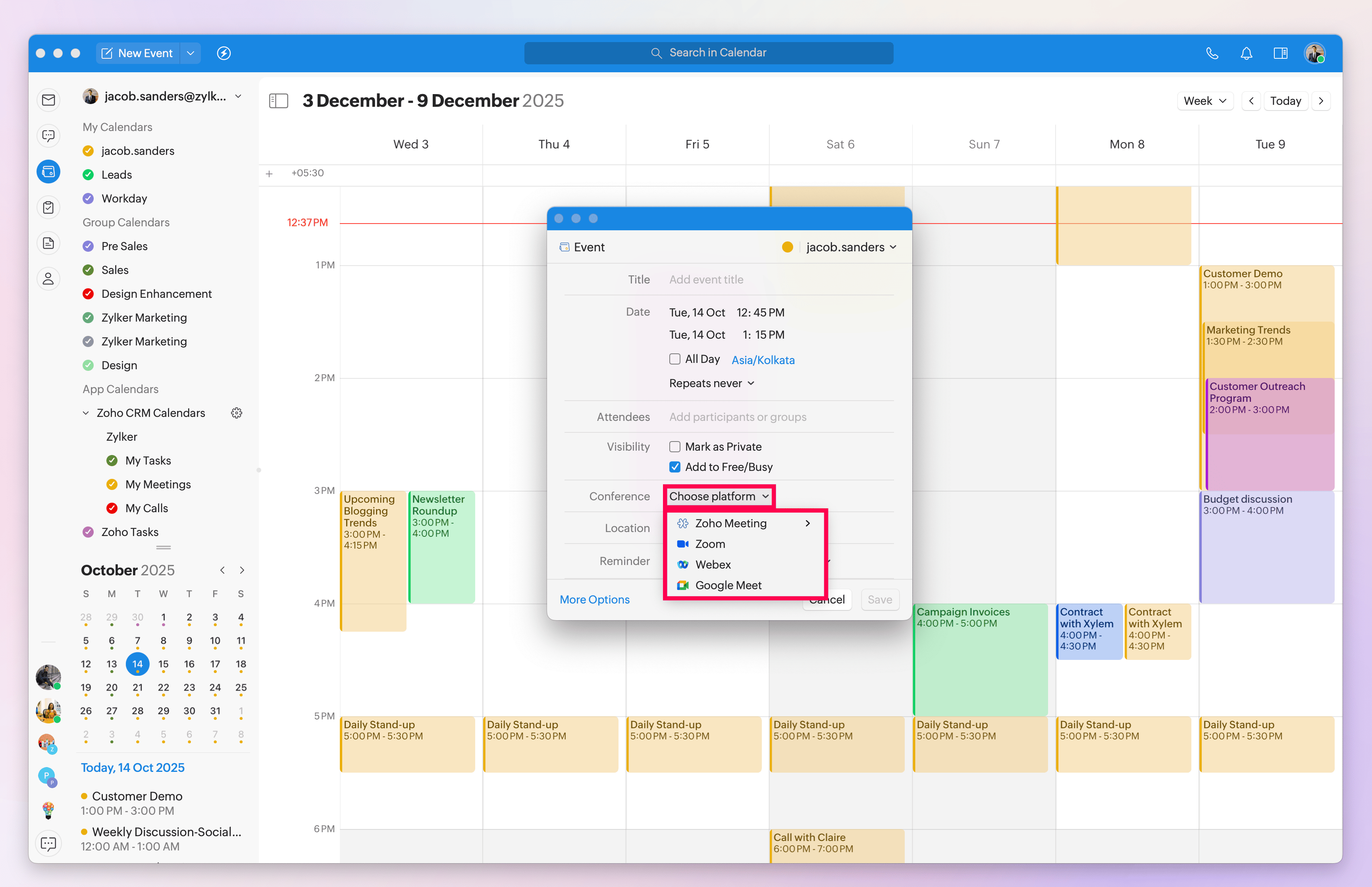 While creating a new calendar event, you can get the meeting link from Zoho Meeting right within Trident. To do so: