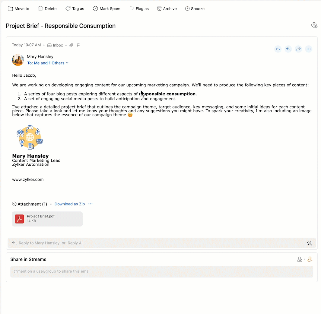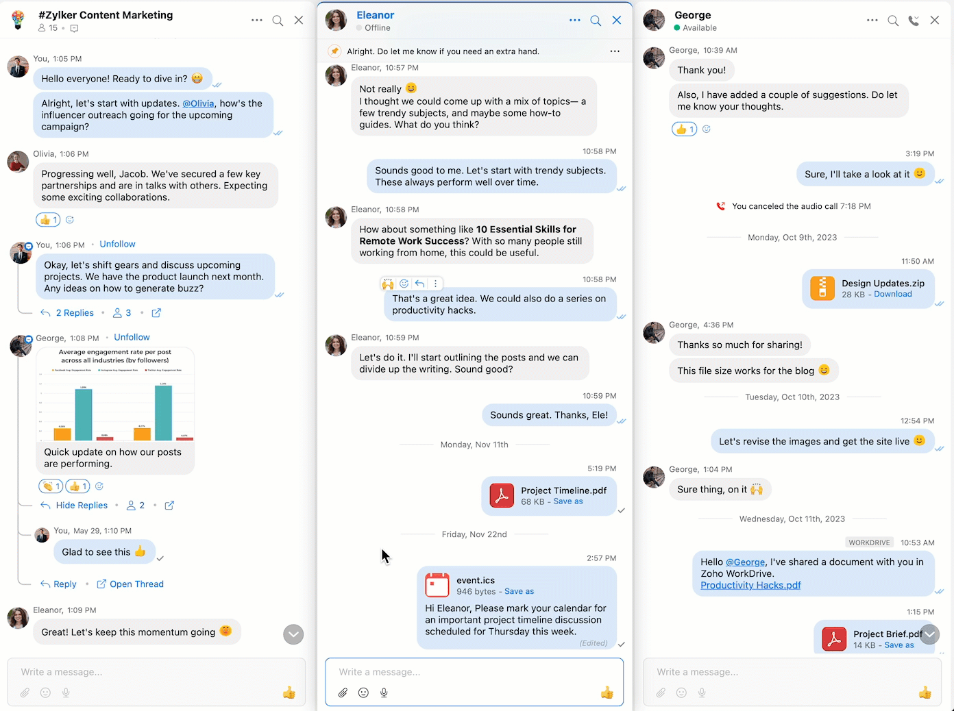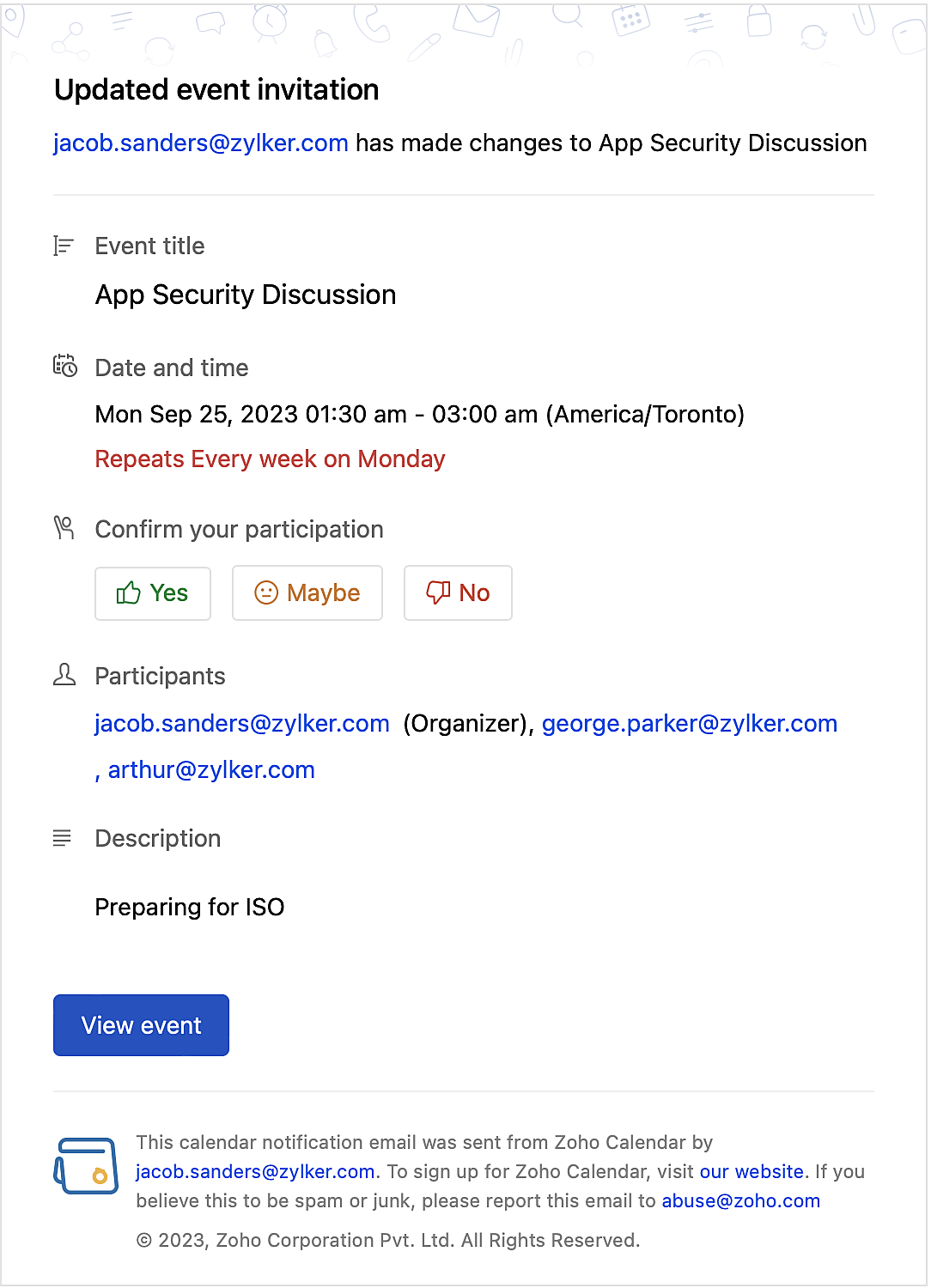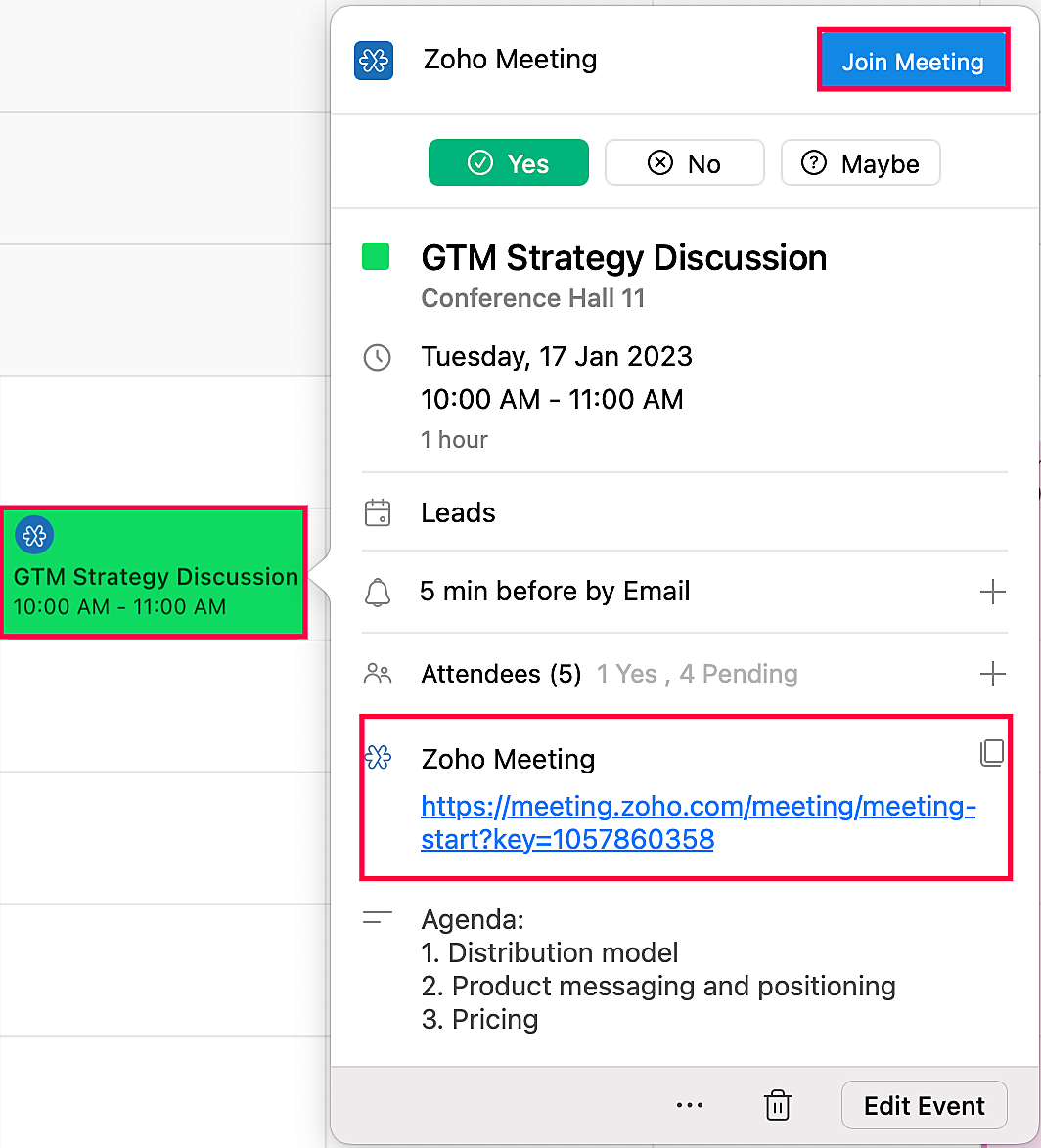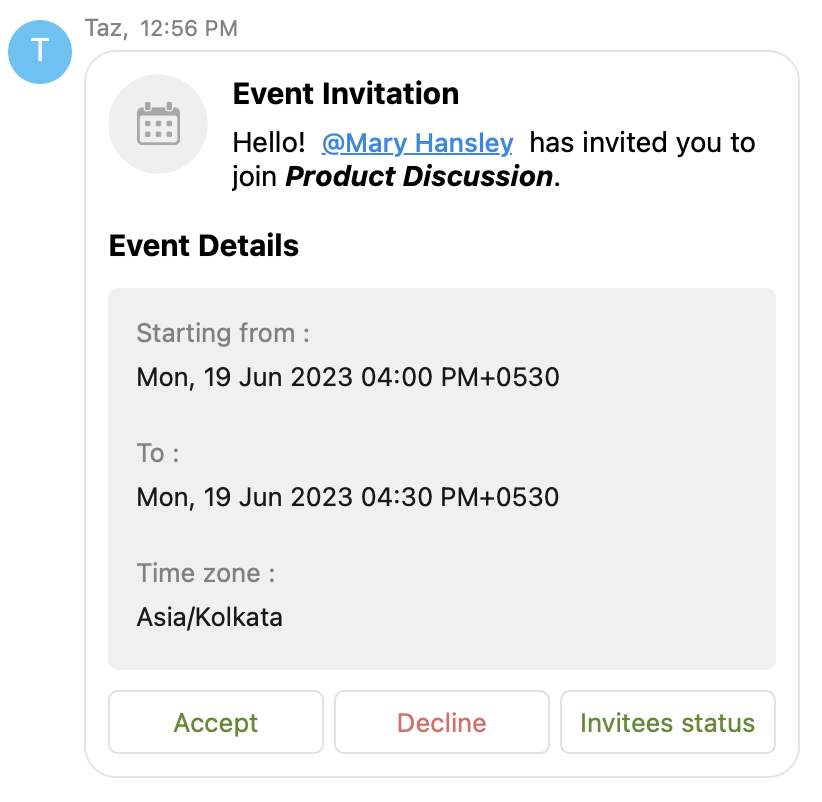 The auto-generated meeting link to join the event will be shared in the invitation via email and Cliq's Taz bot. You can join the meeting from the invitations, or from the Calendar view.