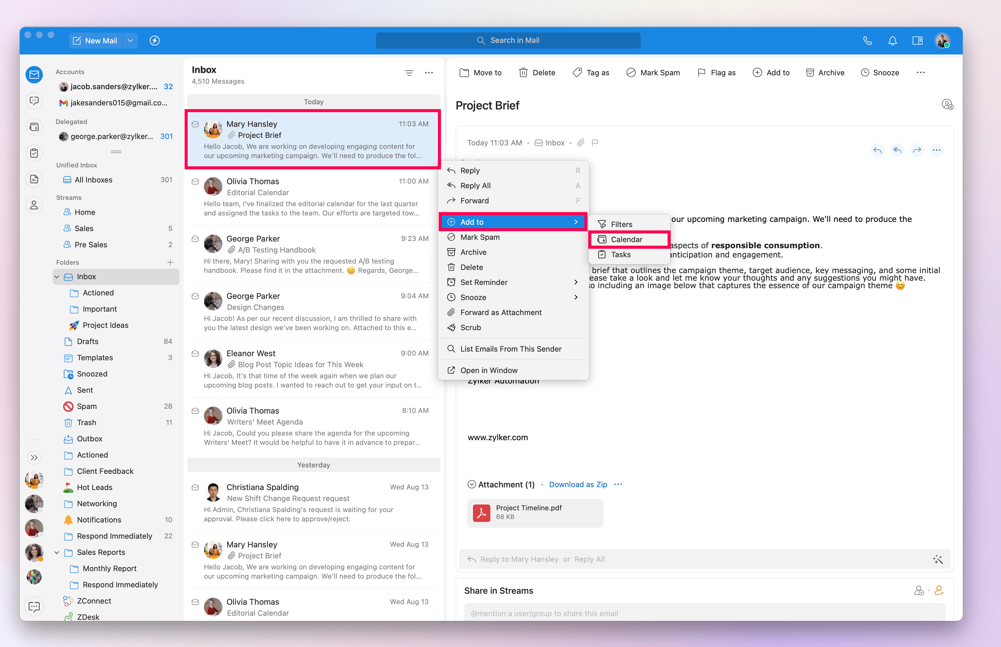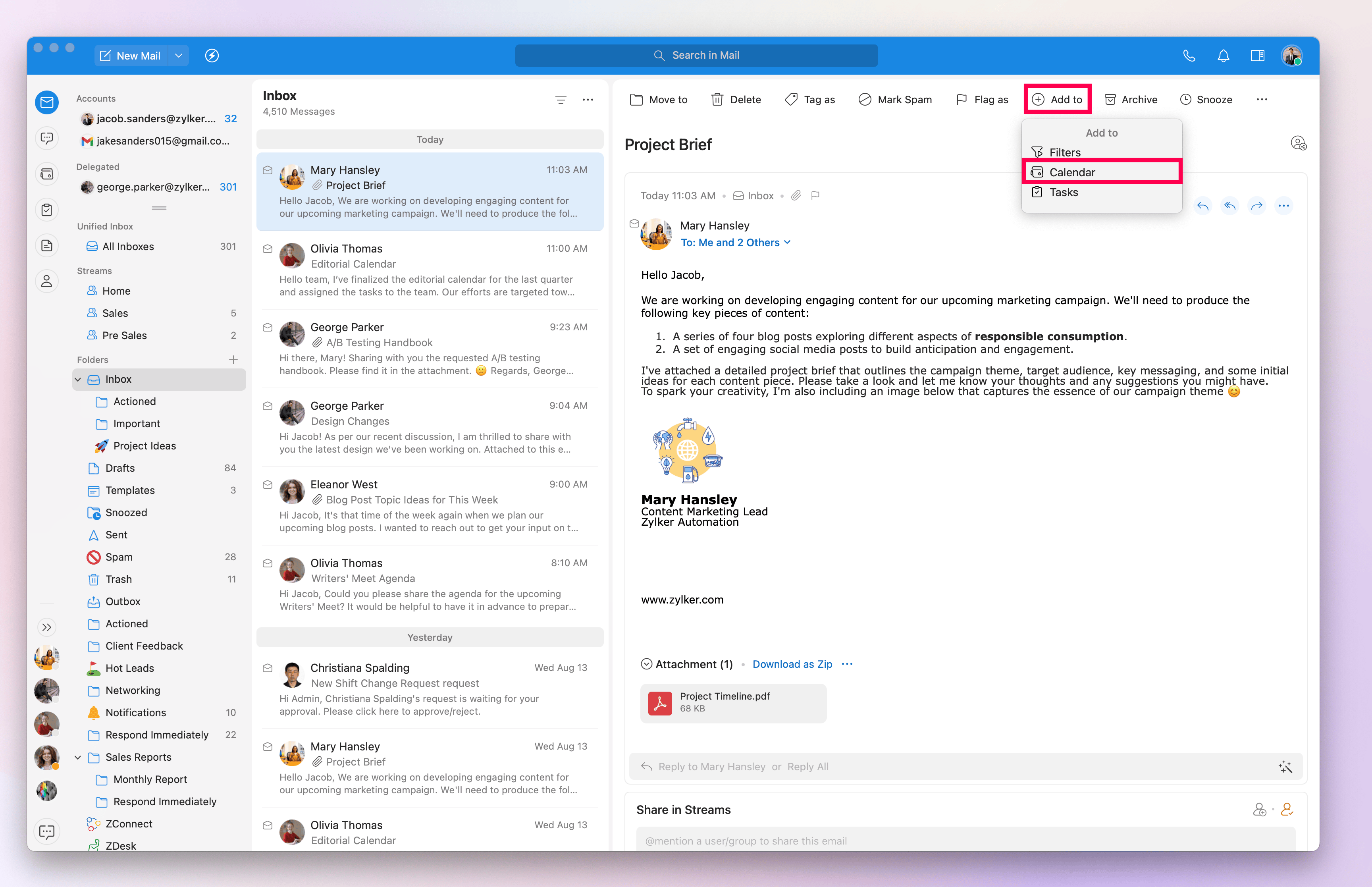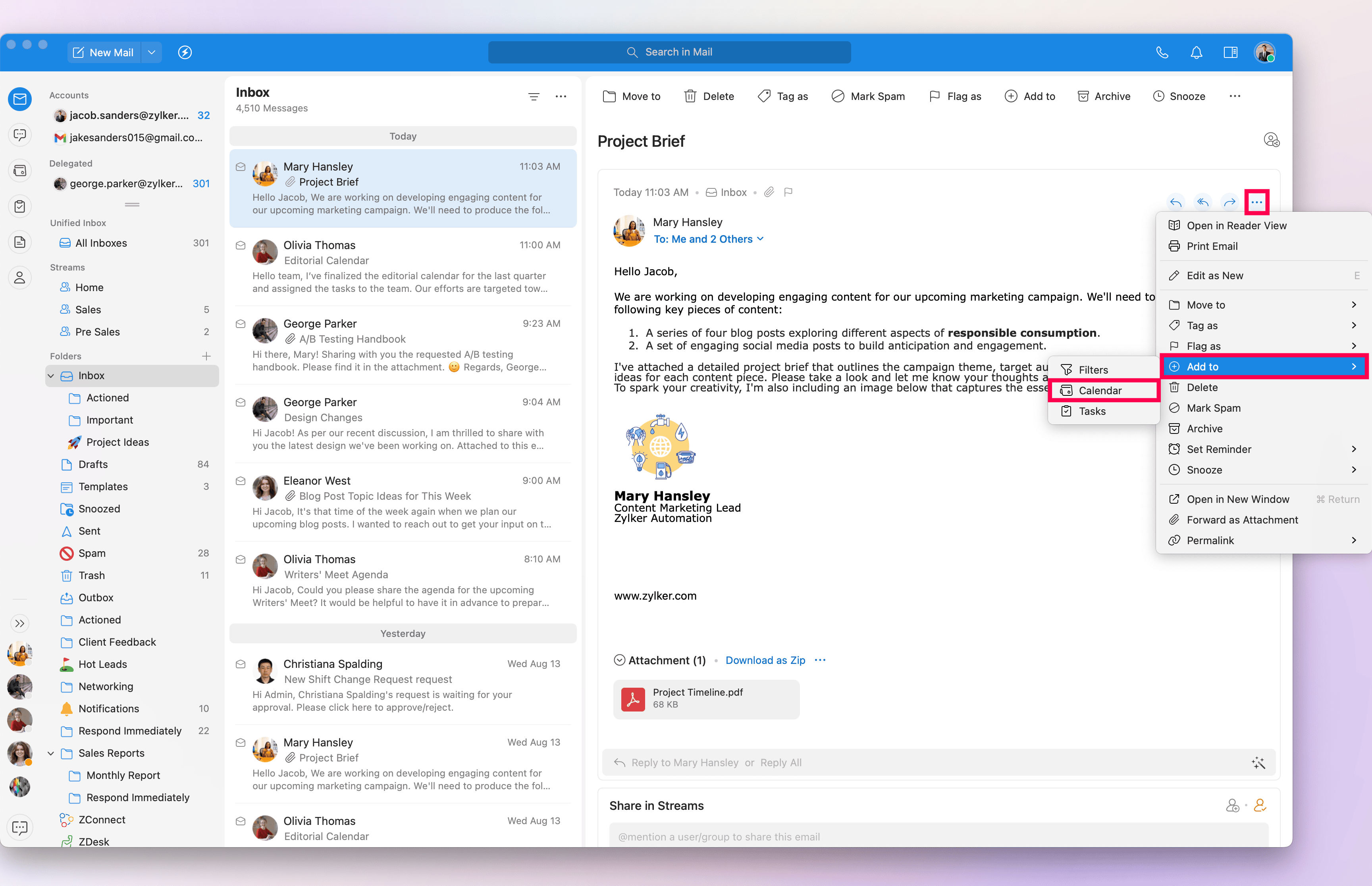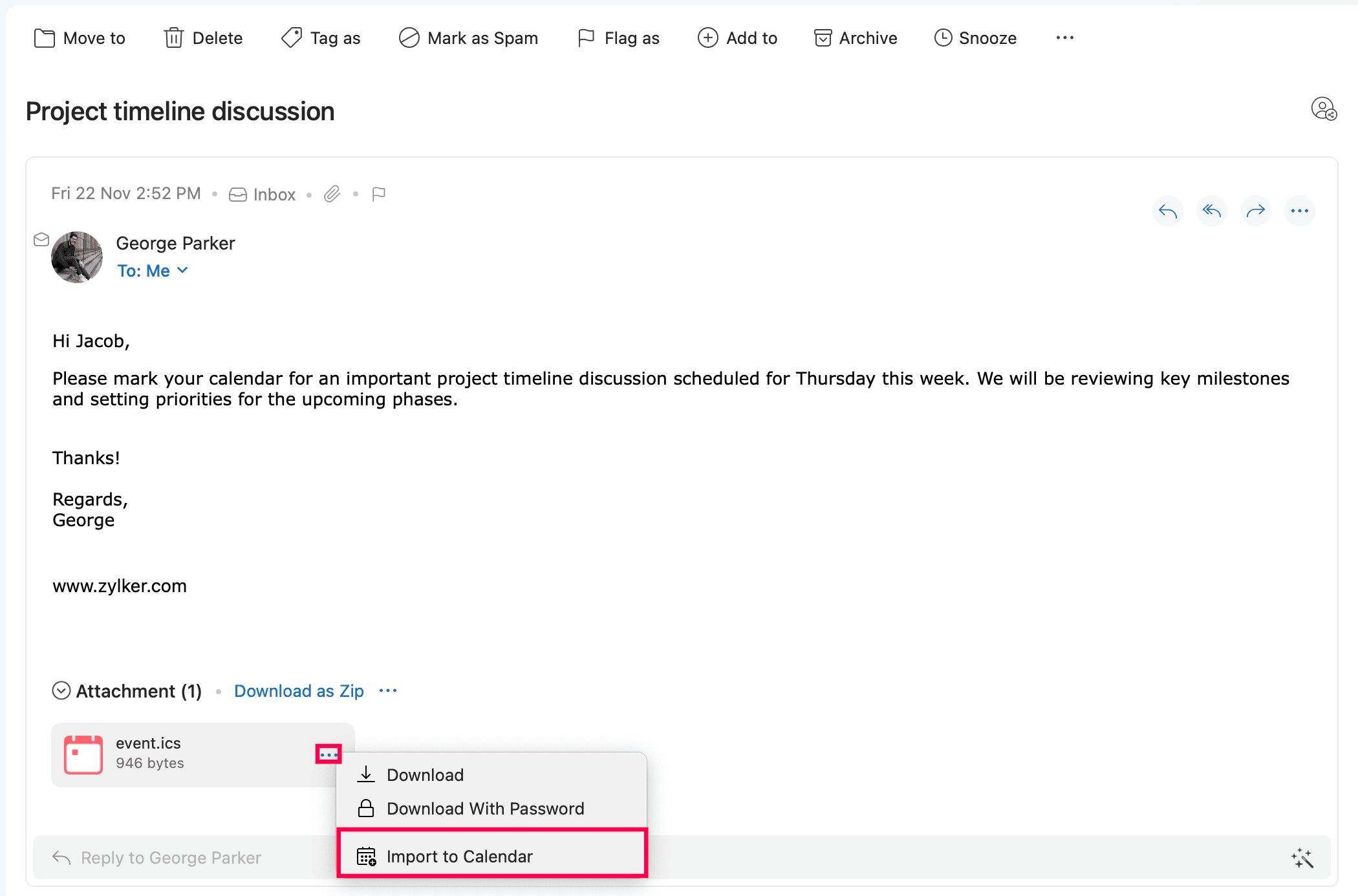 Alternatively, you can also hover over the .ics file, click the More icon in the attachment, and select Import to Calendar.