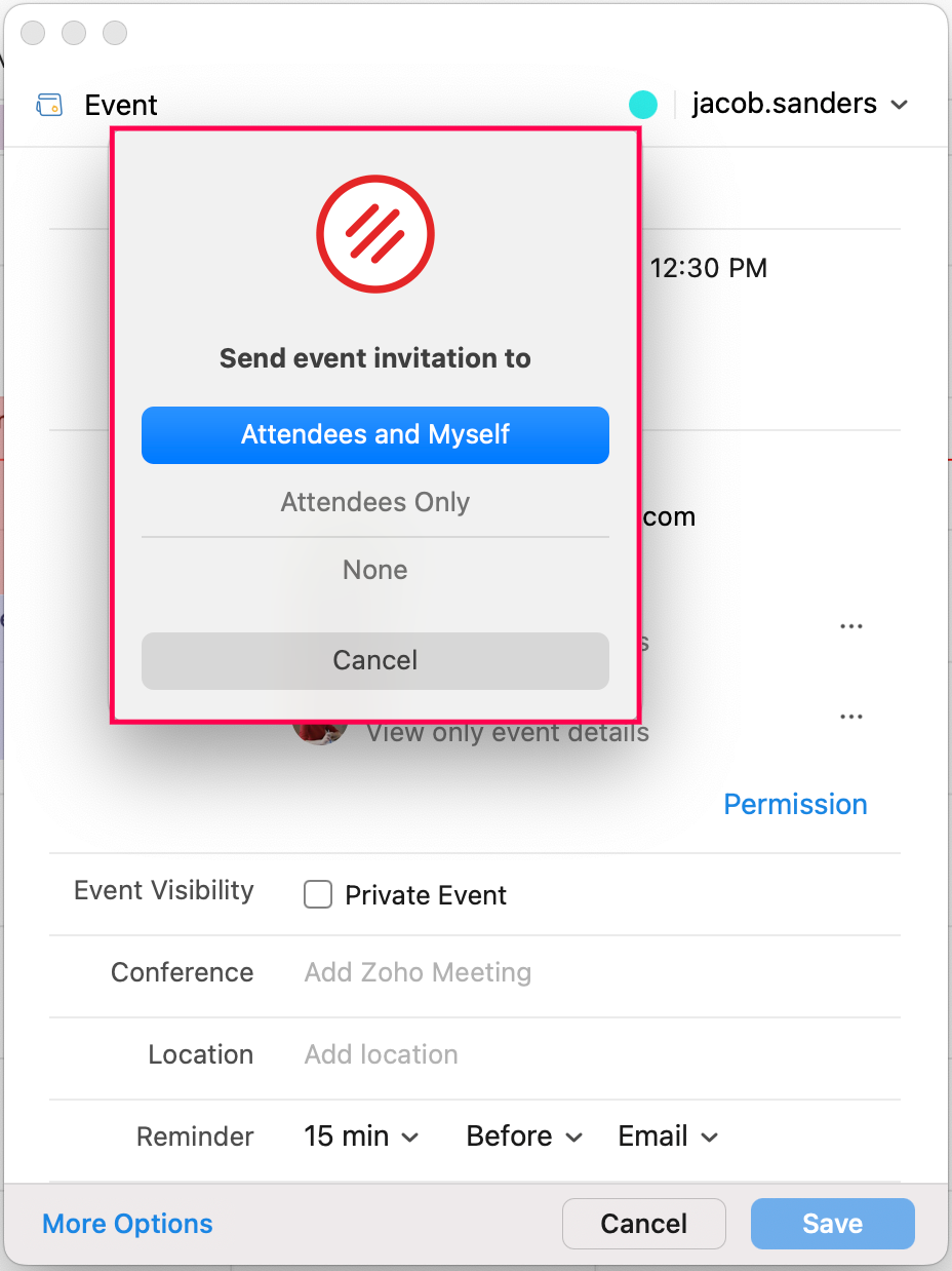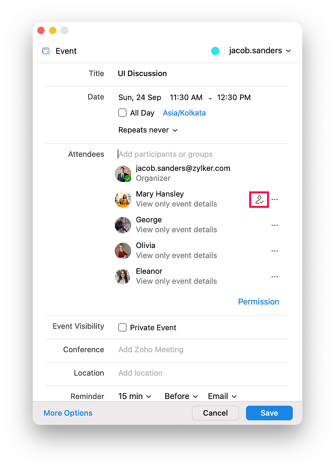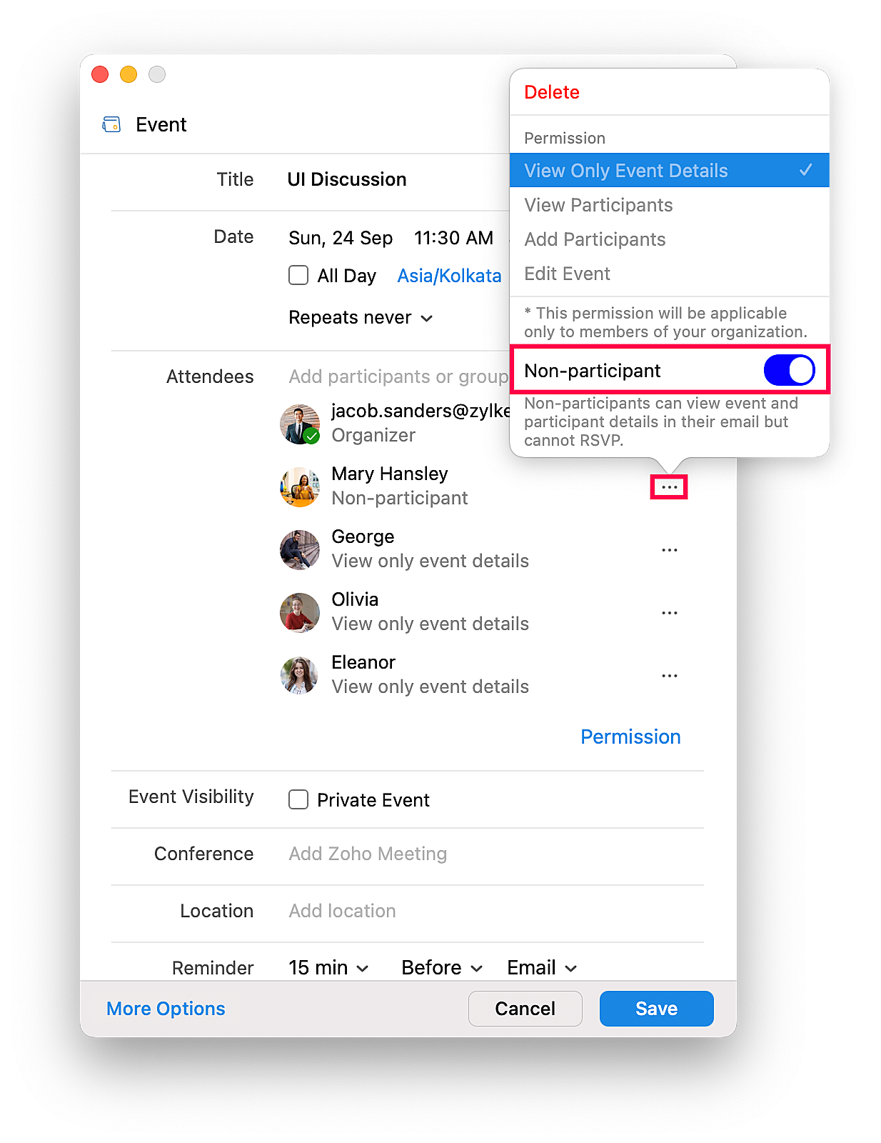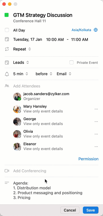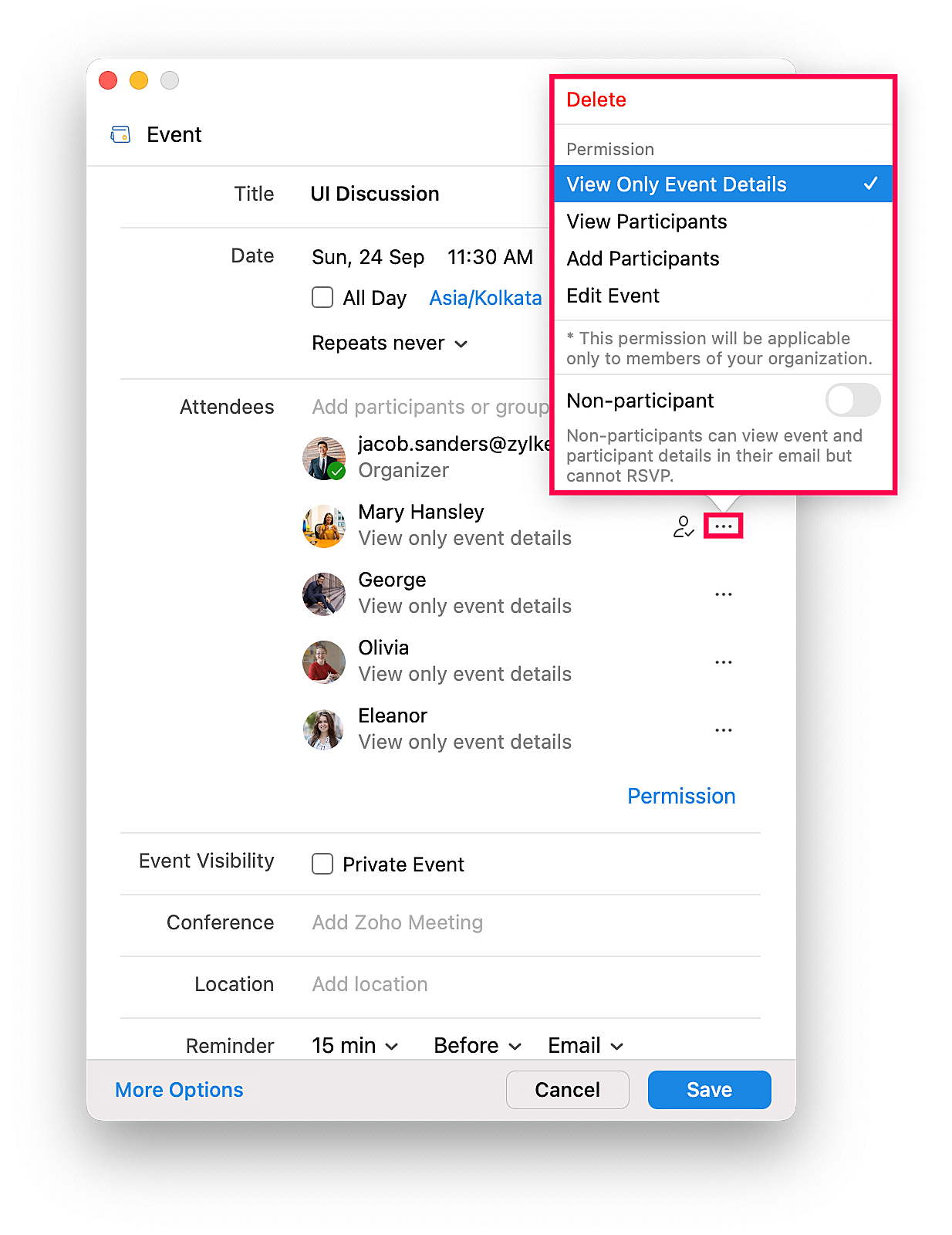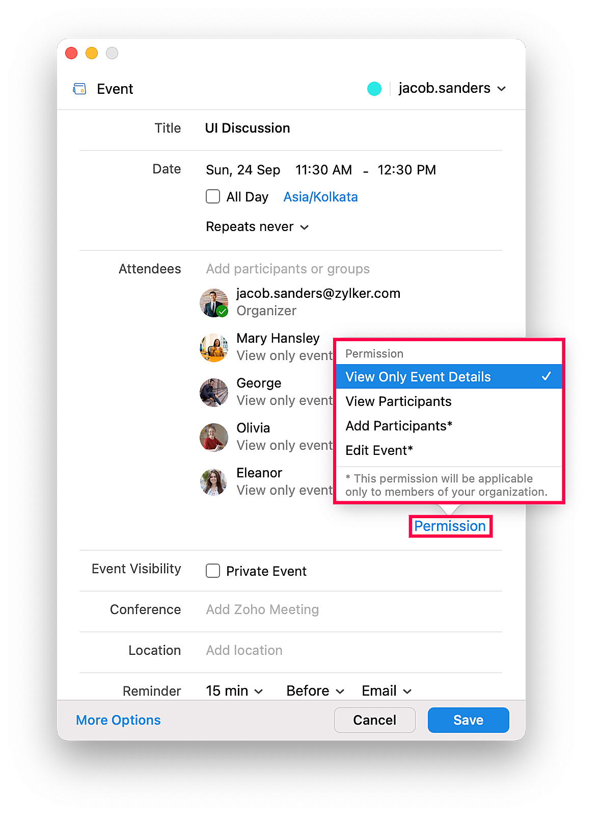 While sharing the event invitations, you can limit the attendee's event permission for viewing event and participant details, adding participants, and editing the event.