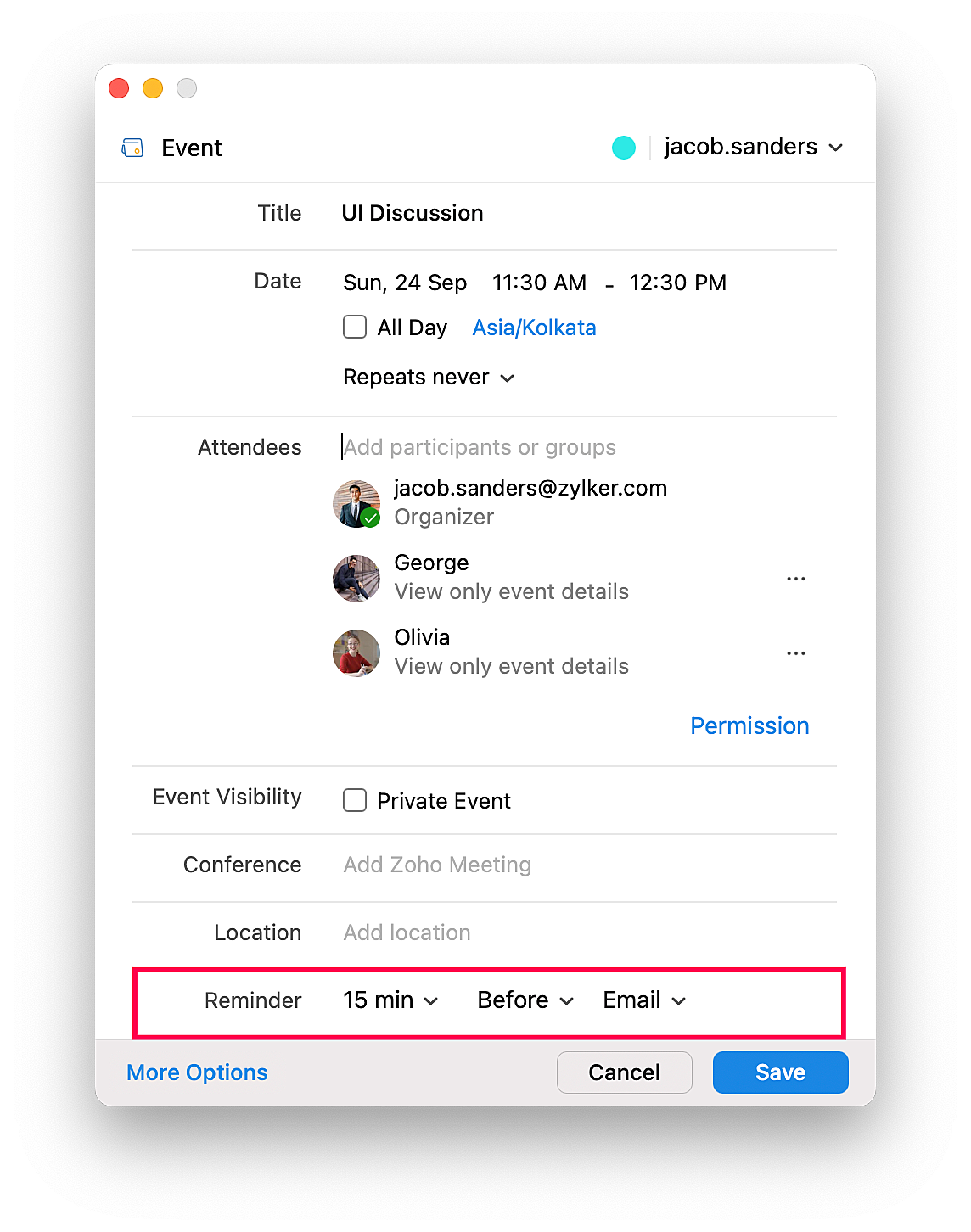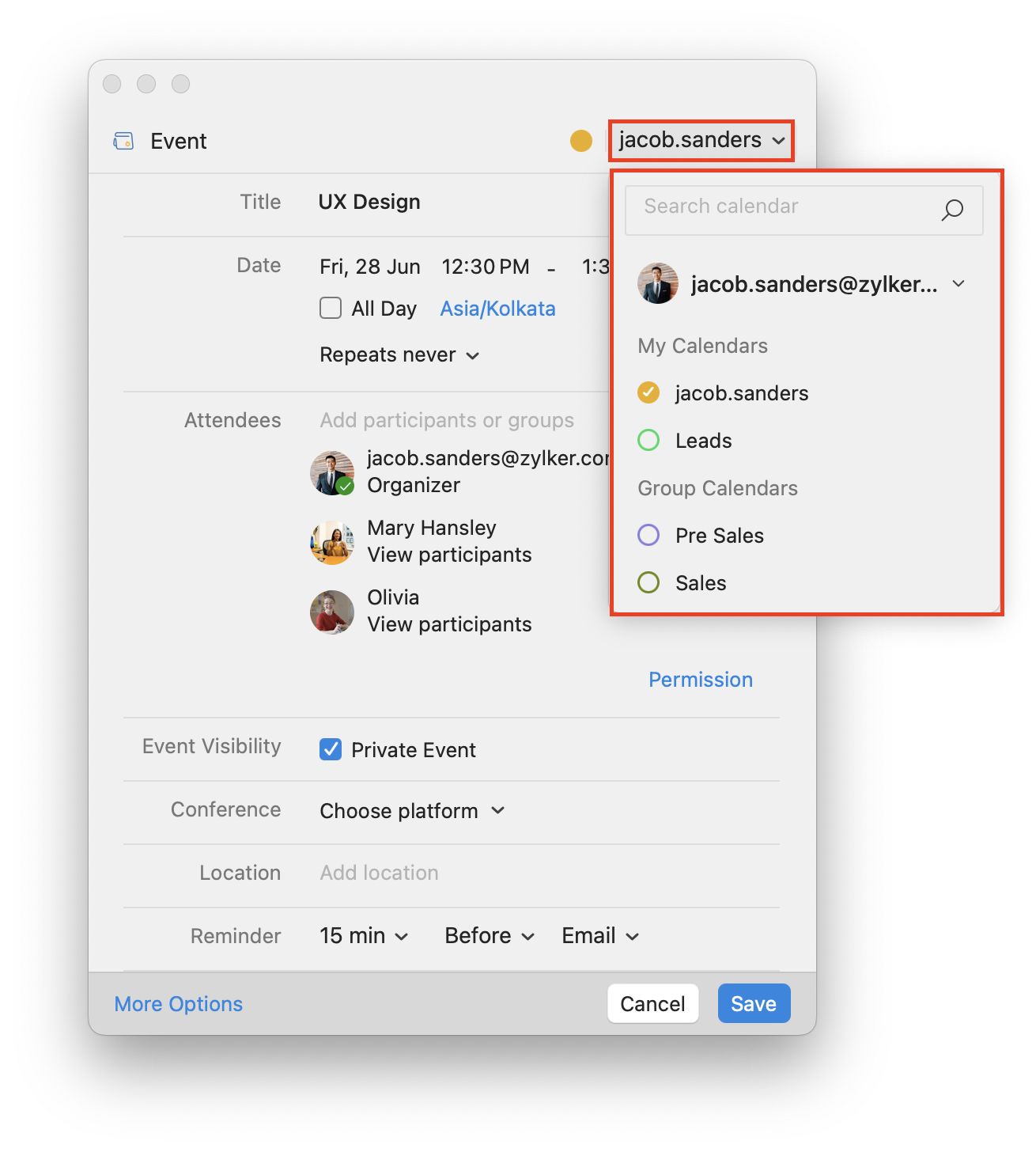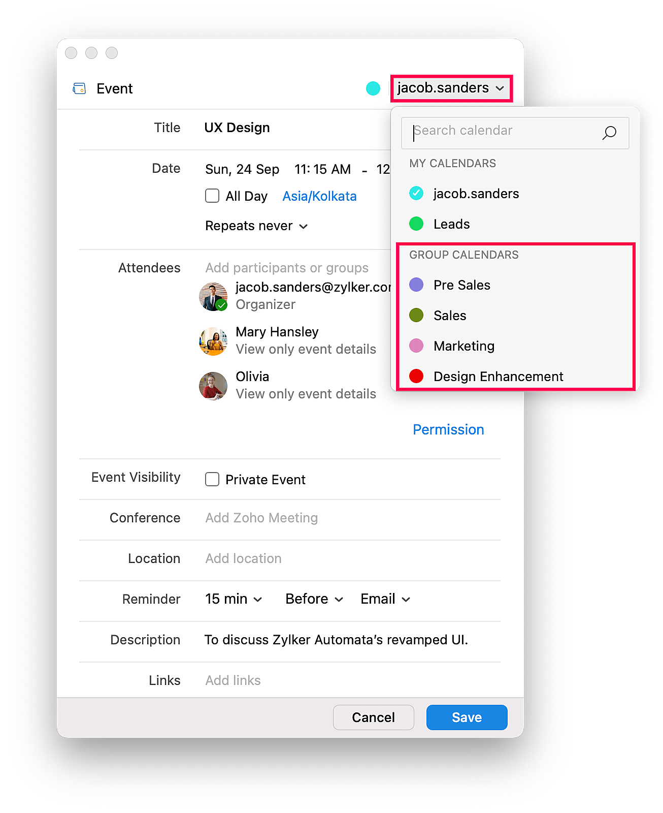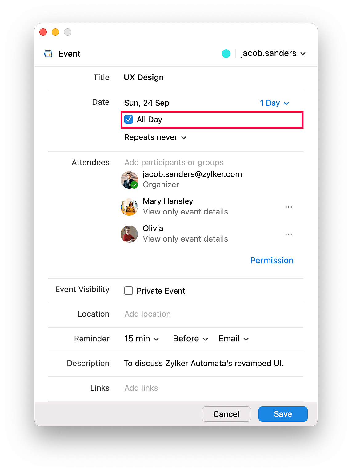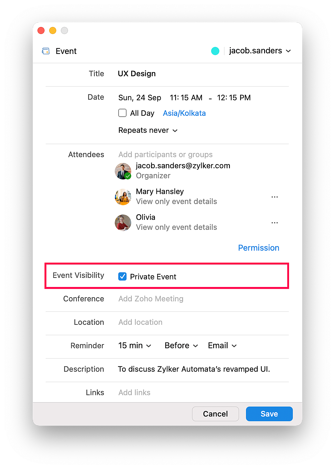 While sharing the event invitations, you can limit the attendee's event permission for viewing event and participant details, adding participants, and editing the event.