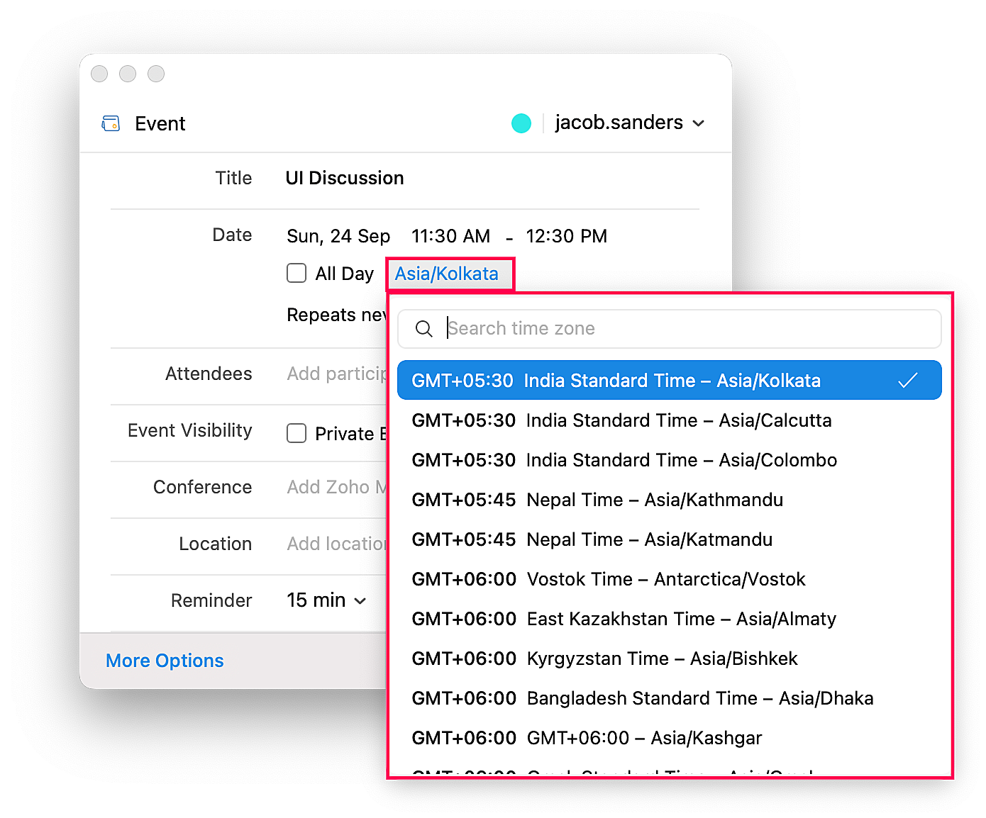 In Calendar, the created event will be listed according to the organizer and attendee's local time zone. To view the original time zone in which the event was created: