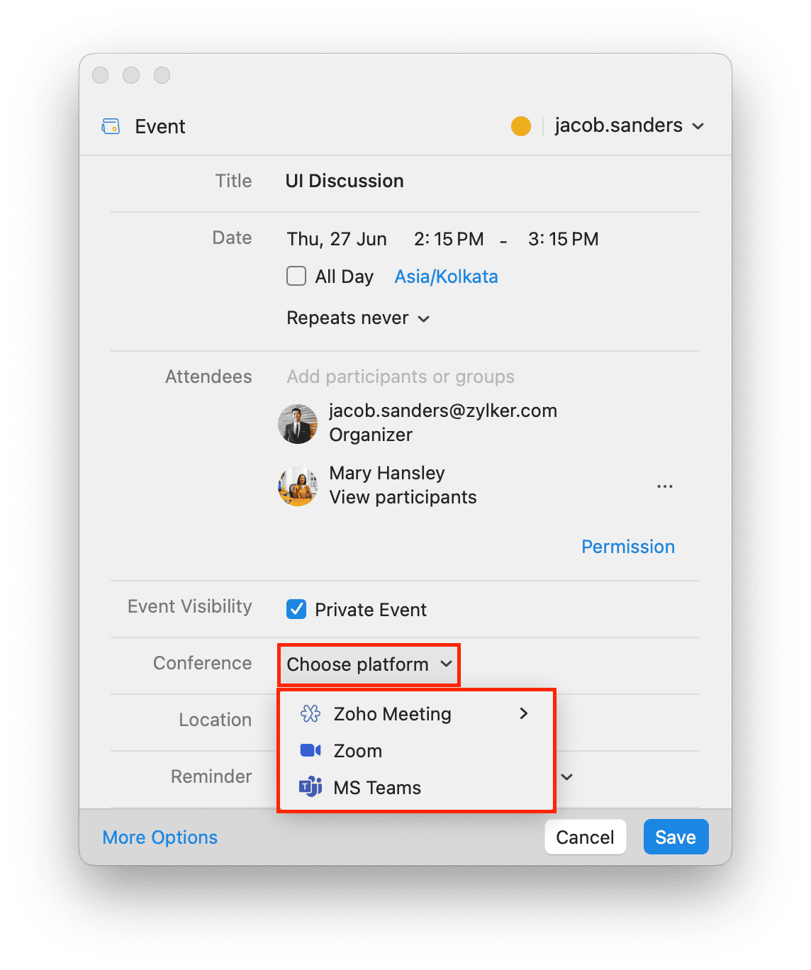 In the pop-up that appears, from Conference > Choose platform, choose between Zoho Meeting, Zoom, MS Teams, or Webex.