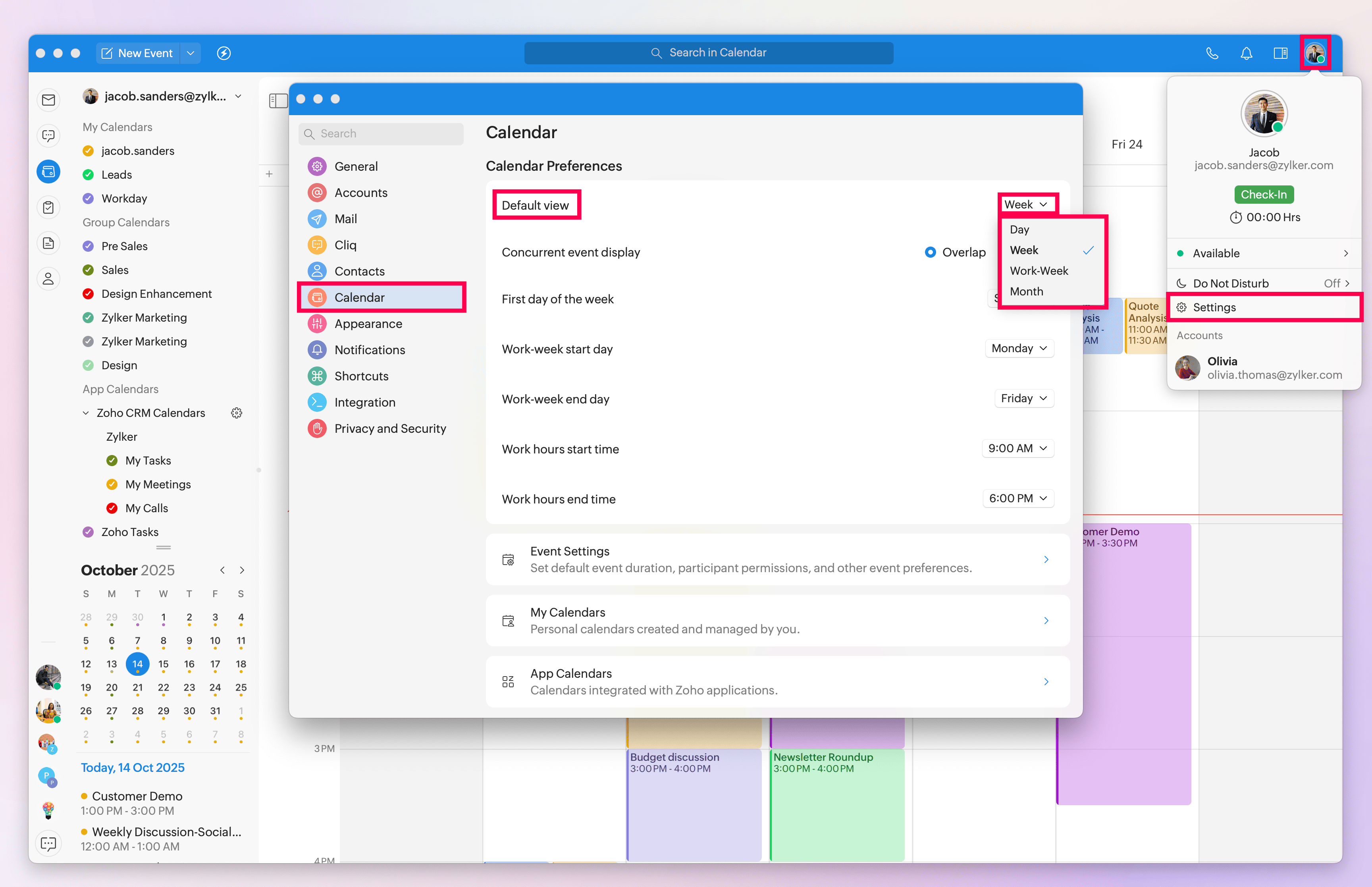 In the Settings page, you can also easily switch the user account to view or hide calendars specific to that account.