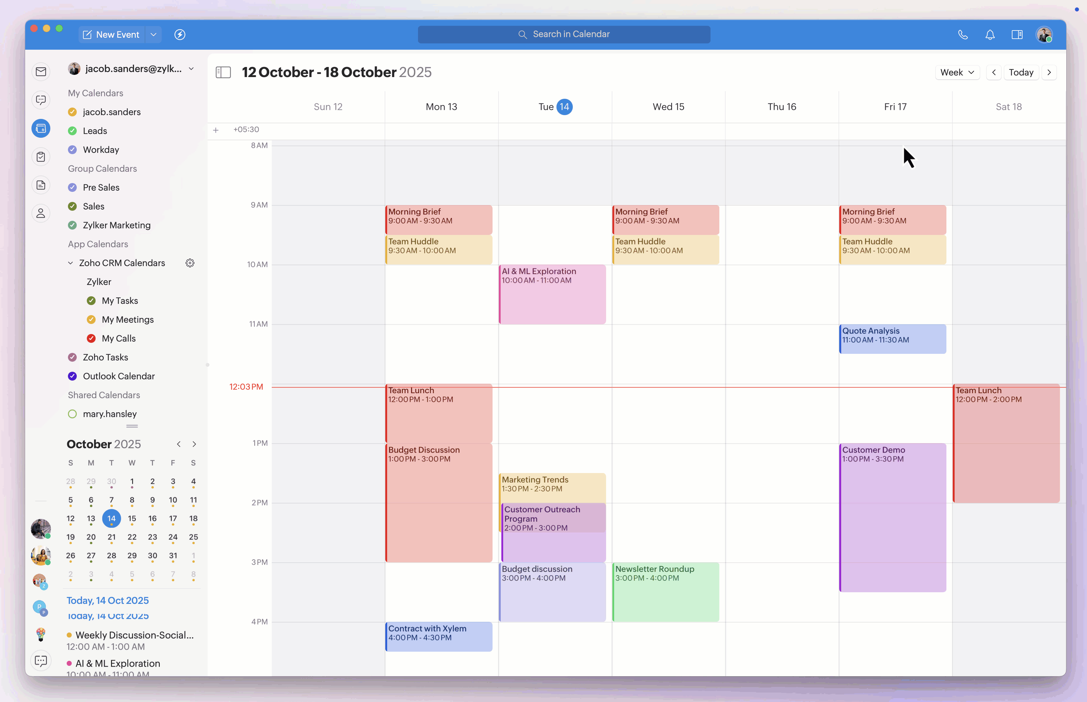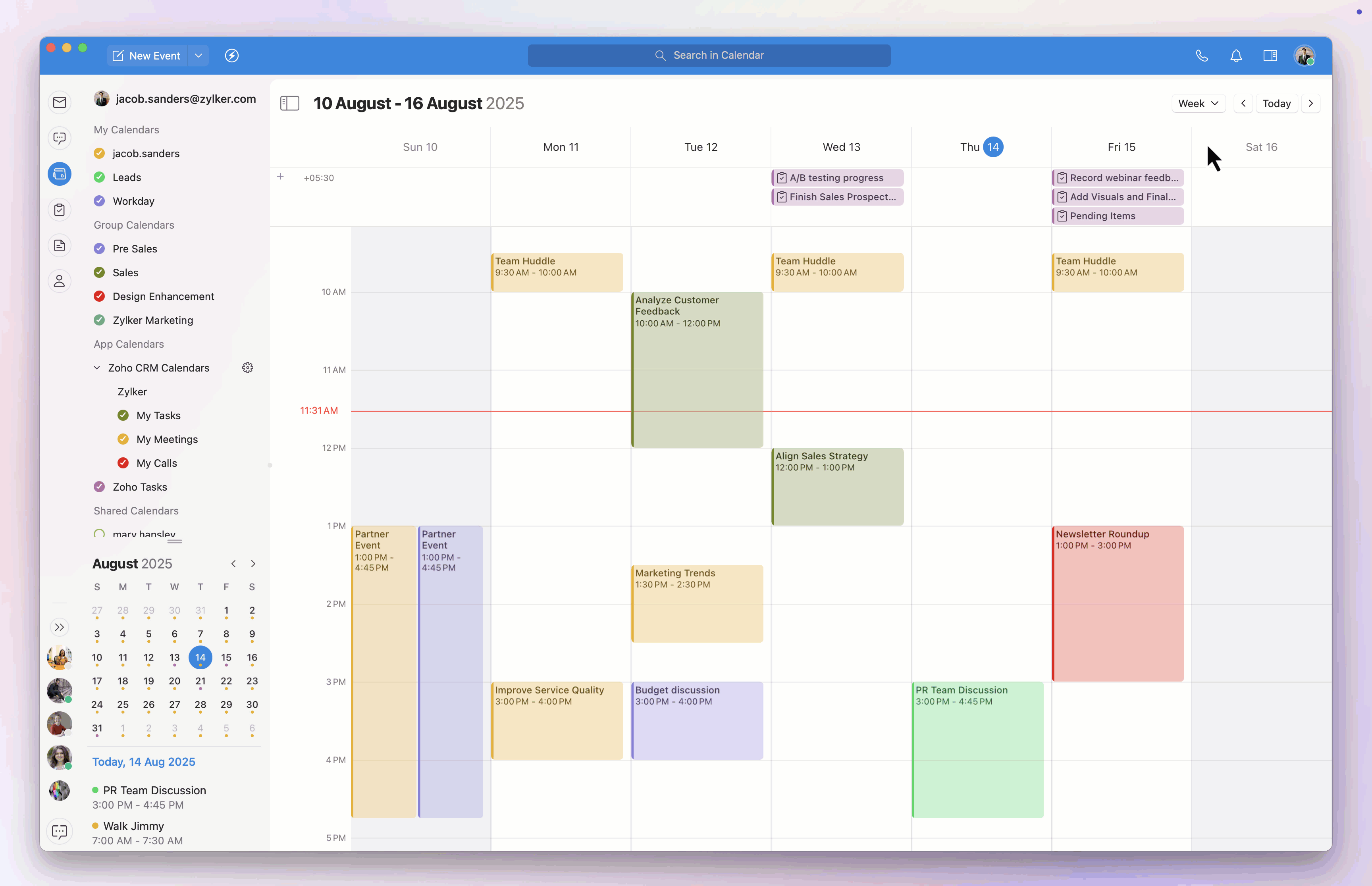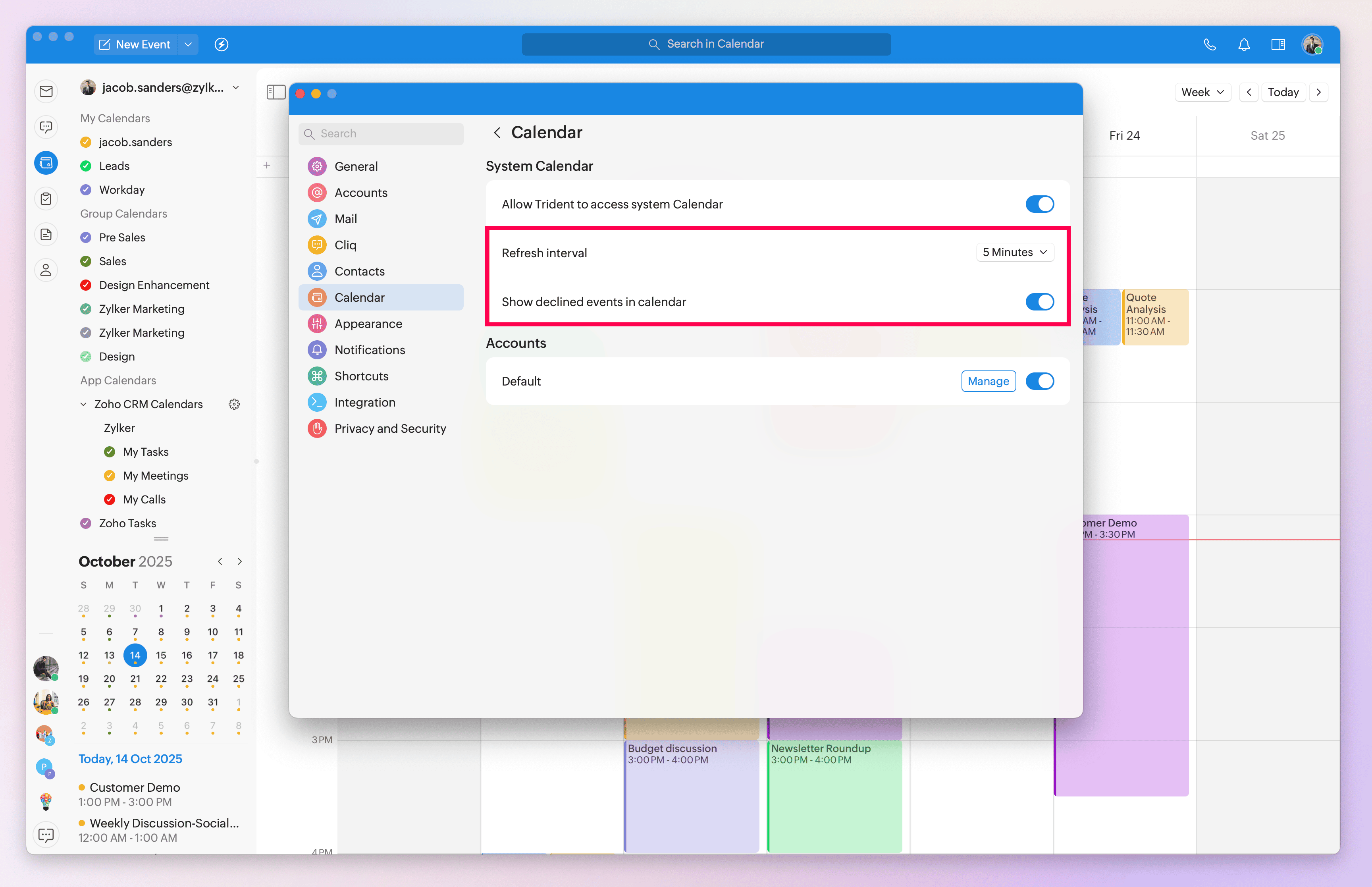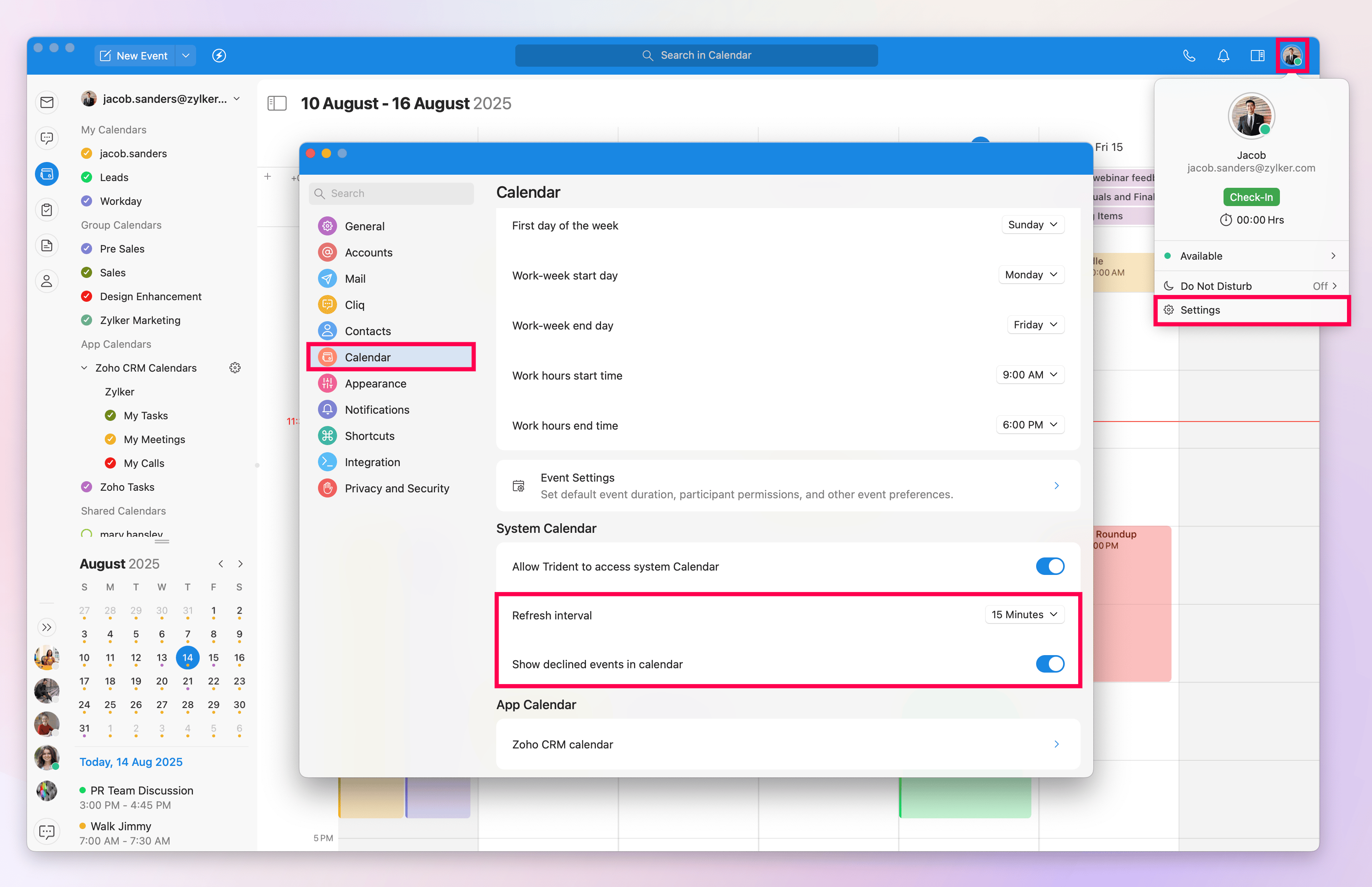 The Zoho CRM Calendar integration in Trident directly imports all your calls, tasks, and meetings from the Zoho CRM web app and is independent of the Zoho CRM Calendar in the Zoho Mail web app.