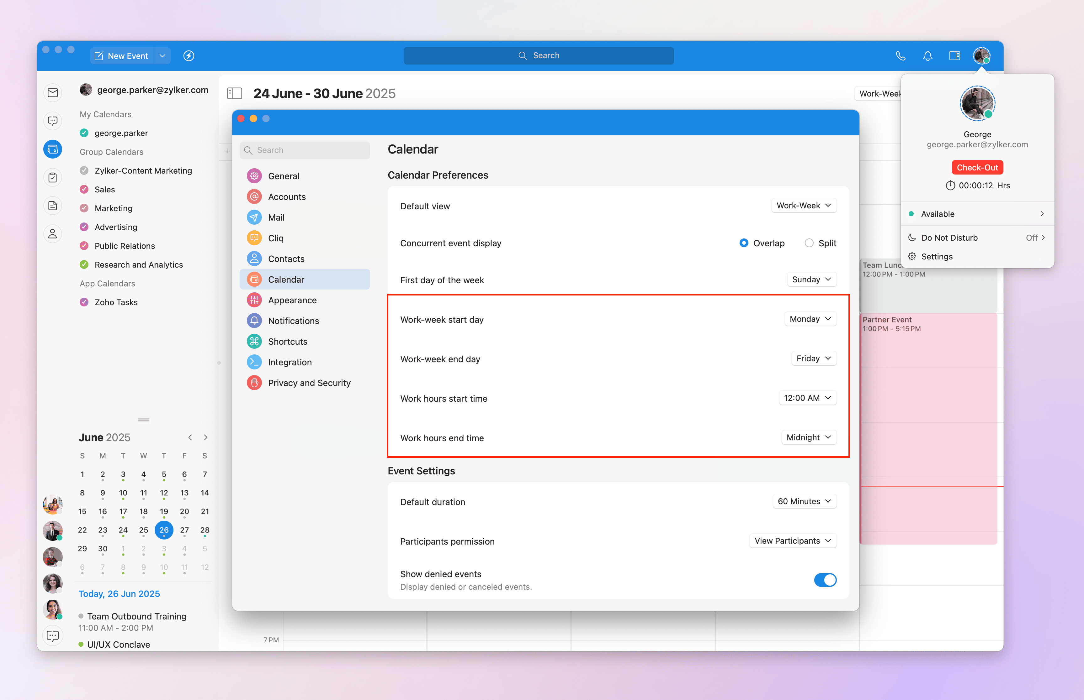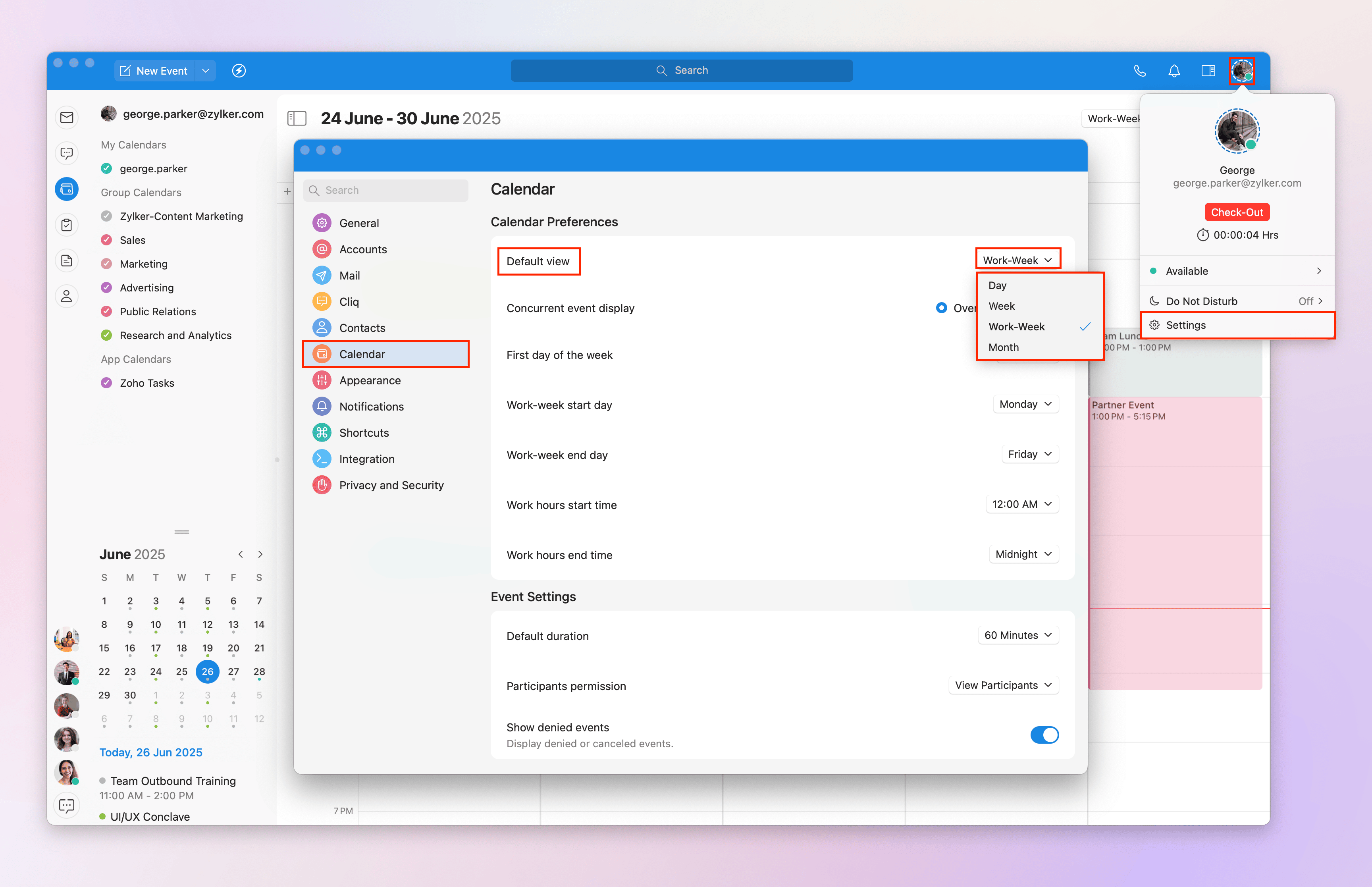 You can choose to set a default event duration and participant permission, so you need not specify them every time you create an event. To do so: