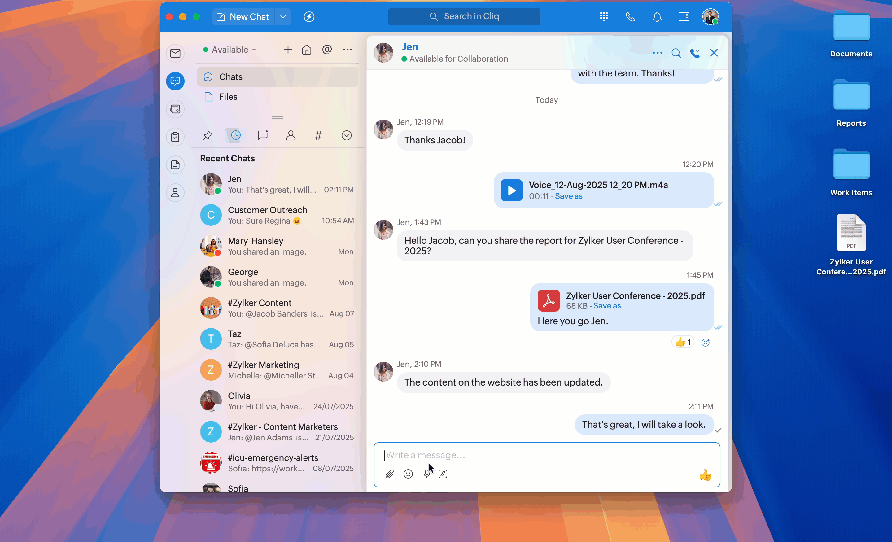 Continuity Camera is a native feature that helps you use your iPhone or iPad to scan documents or take pictures and have them appear instantly on your Mac. In Trident, this feature enables you to share captured pictures or scanned files from your iOS devices as Cliq chat messages. To share files in this method: