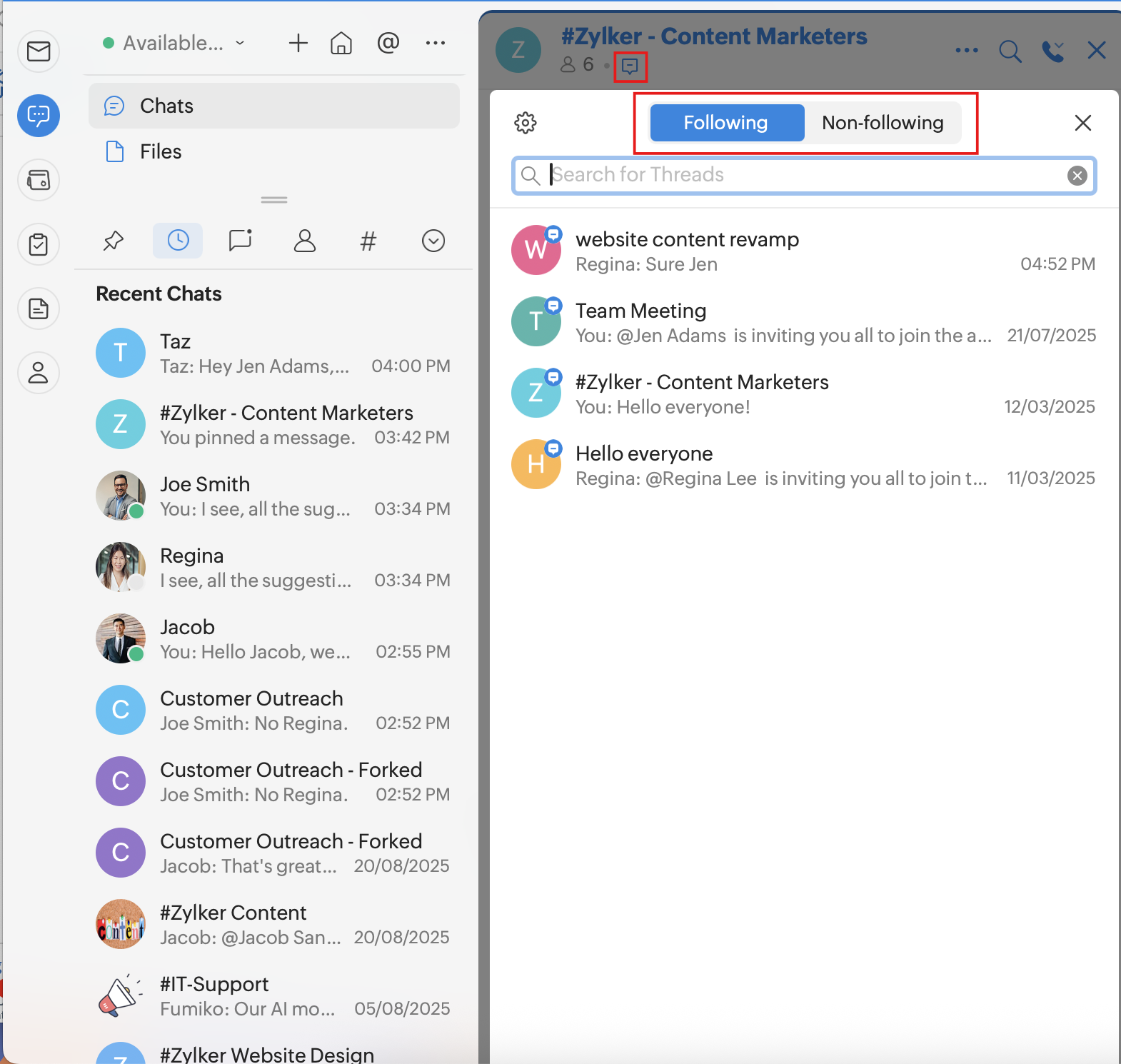 You can view all of the threads in a channel by clicking the Thread icon on the chatbox header. This will open a dialog in which the threads you're following and those you are not will be listed separately under two tabs.
