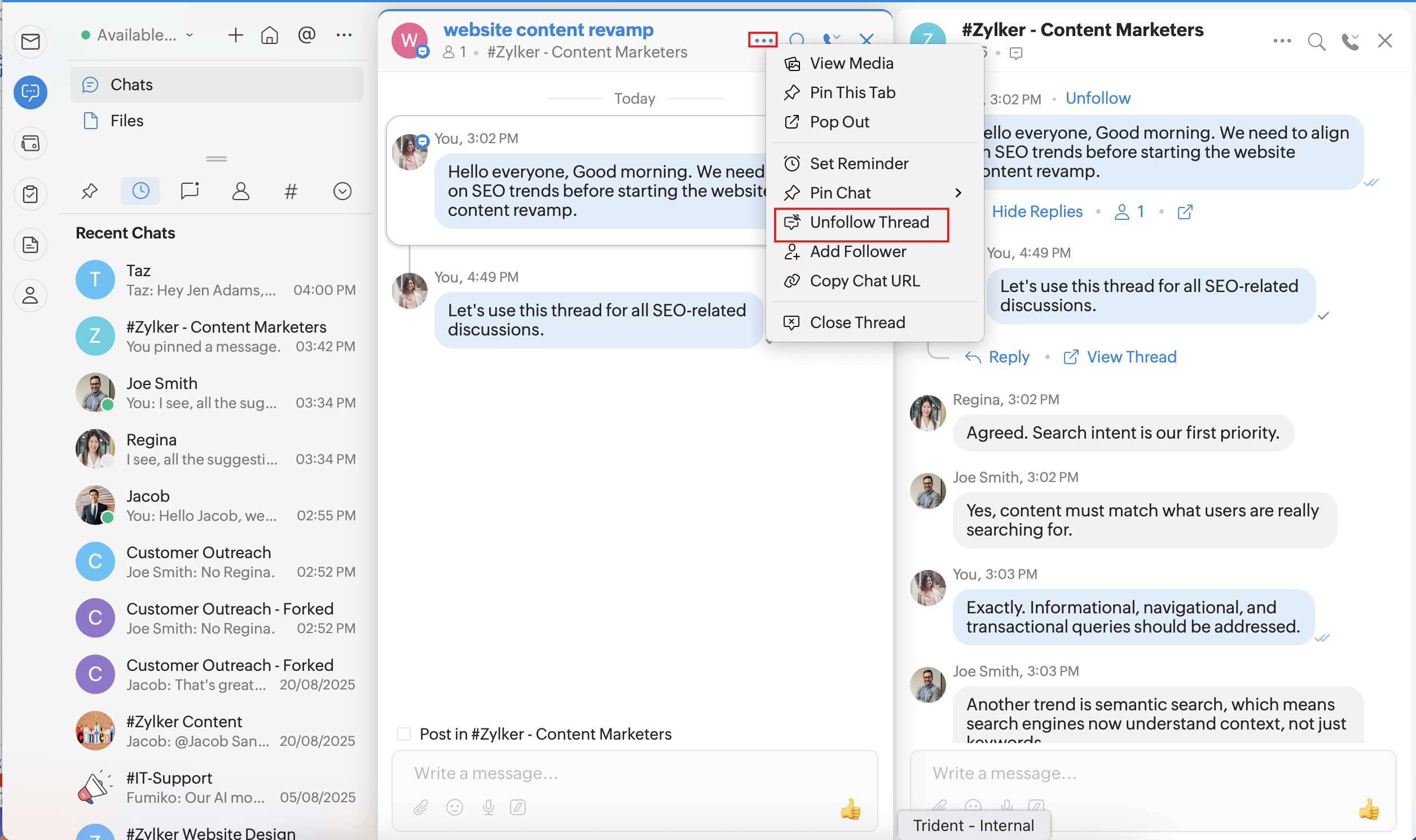 Alternatively, to unfollow a threaded conversation that you've popped out and opened in a separate chatbox: