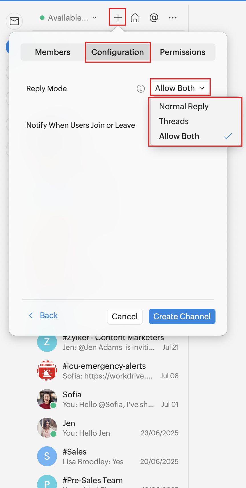 In channels, the admin can decide how users reply to chats. They can either use the normal reply, threads, or both. If the reply mode is set to Threads, the threaded conversations will be listed according to what is configured in the Cliq preferences. To do so:
