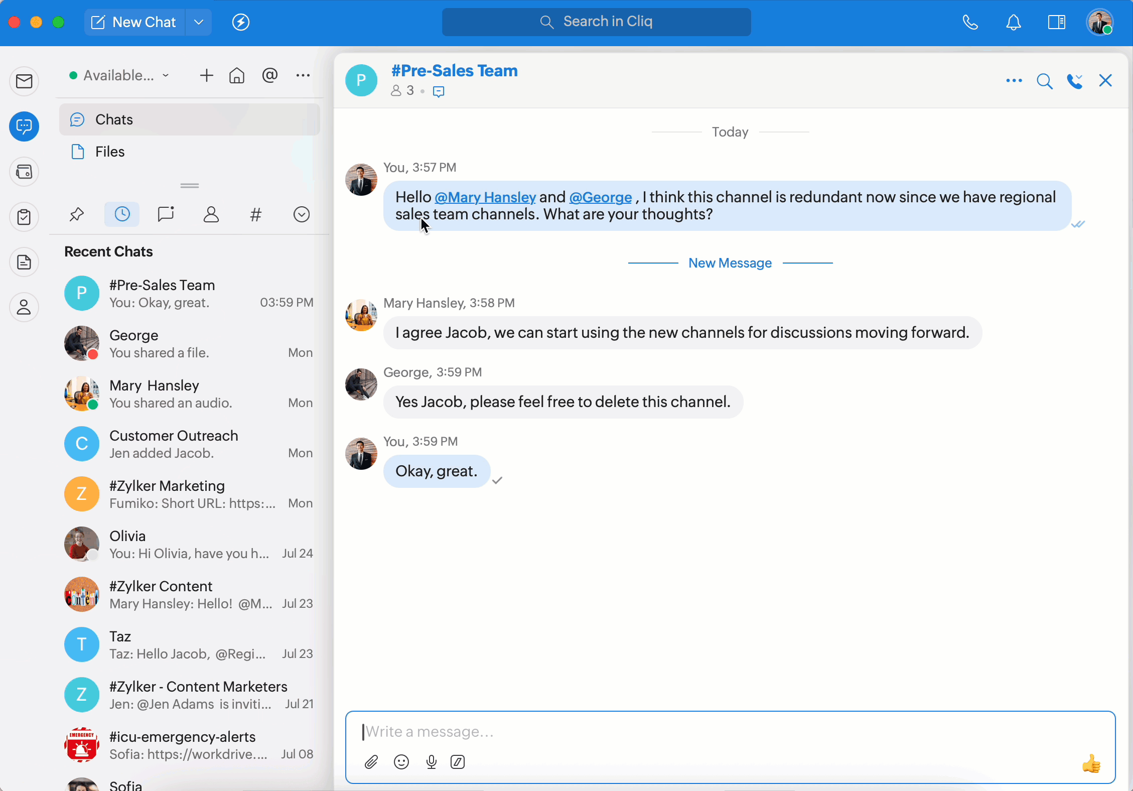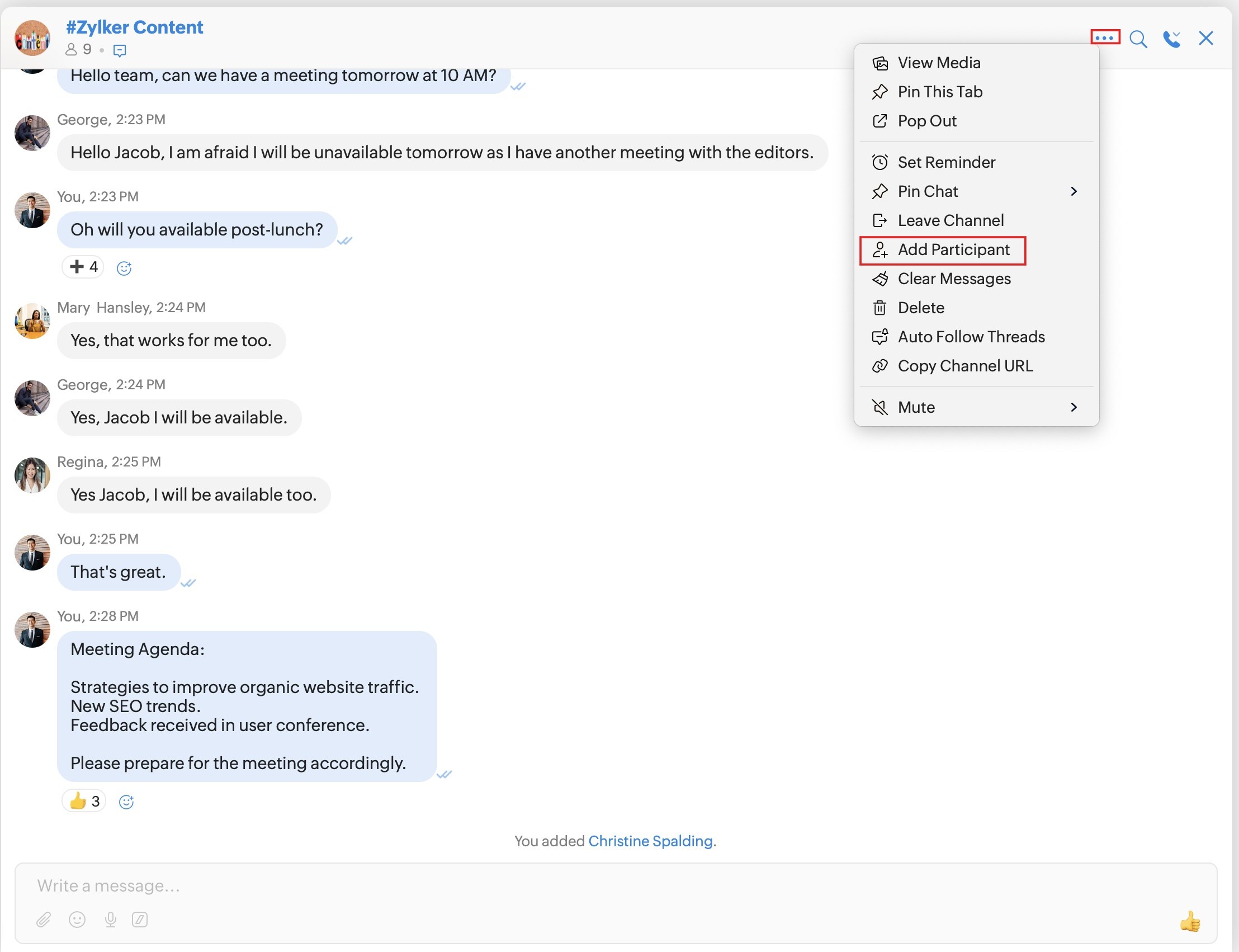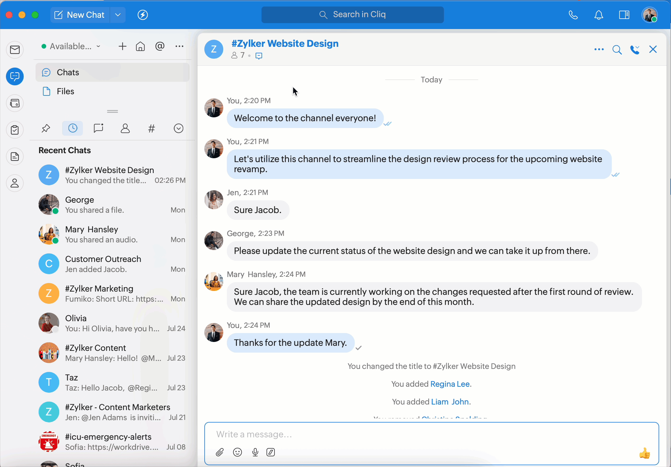 You can add bots to your channel to automate certain tasks, send notifications, and set reminders. Learn more about the available bots to add to your Cliq channel.