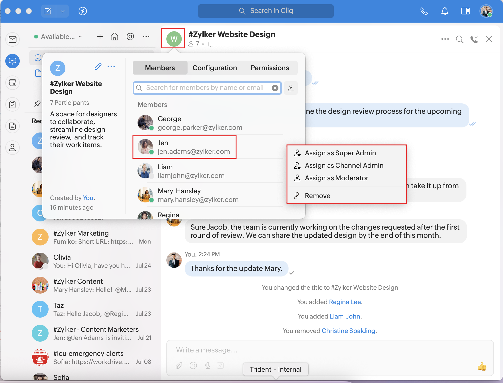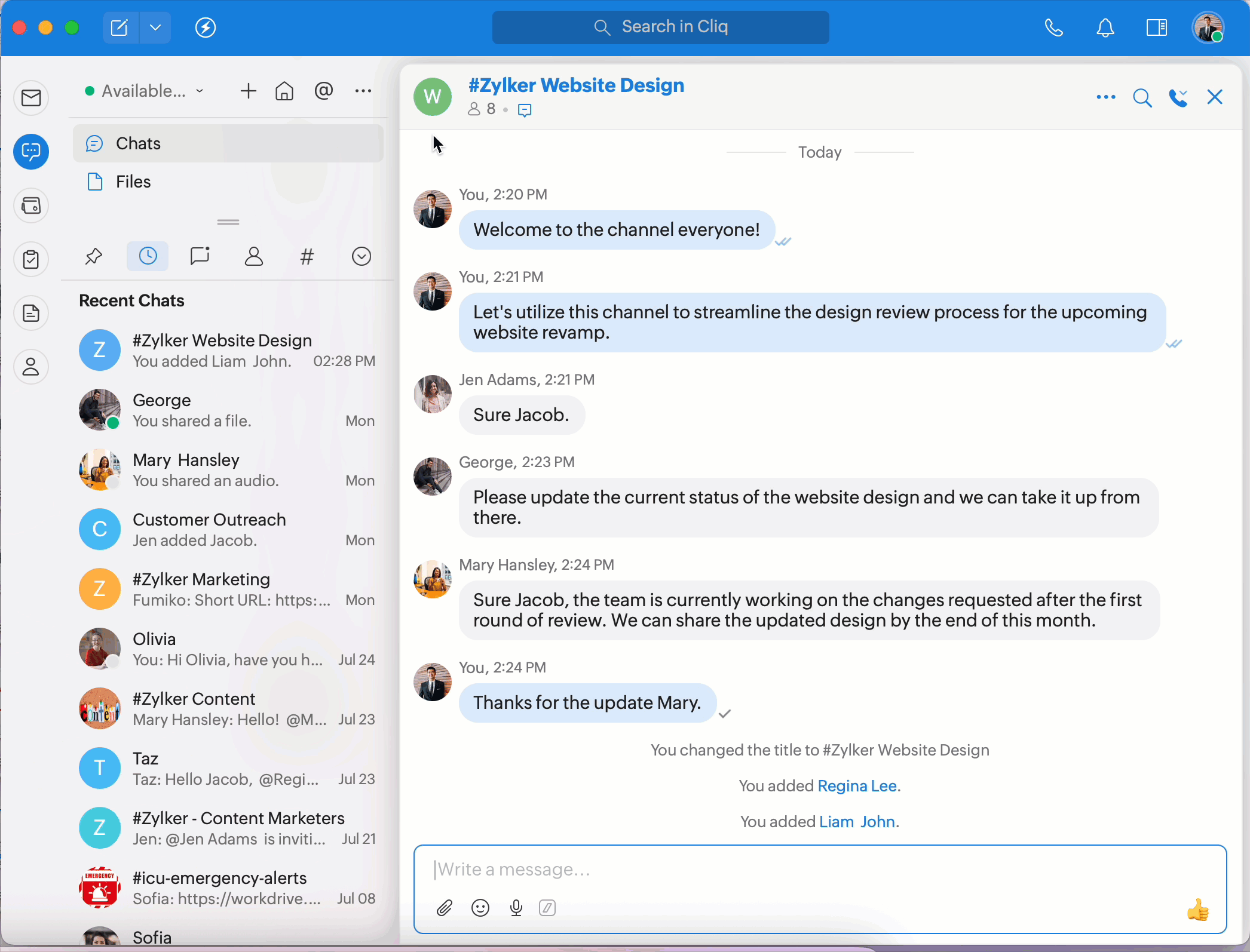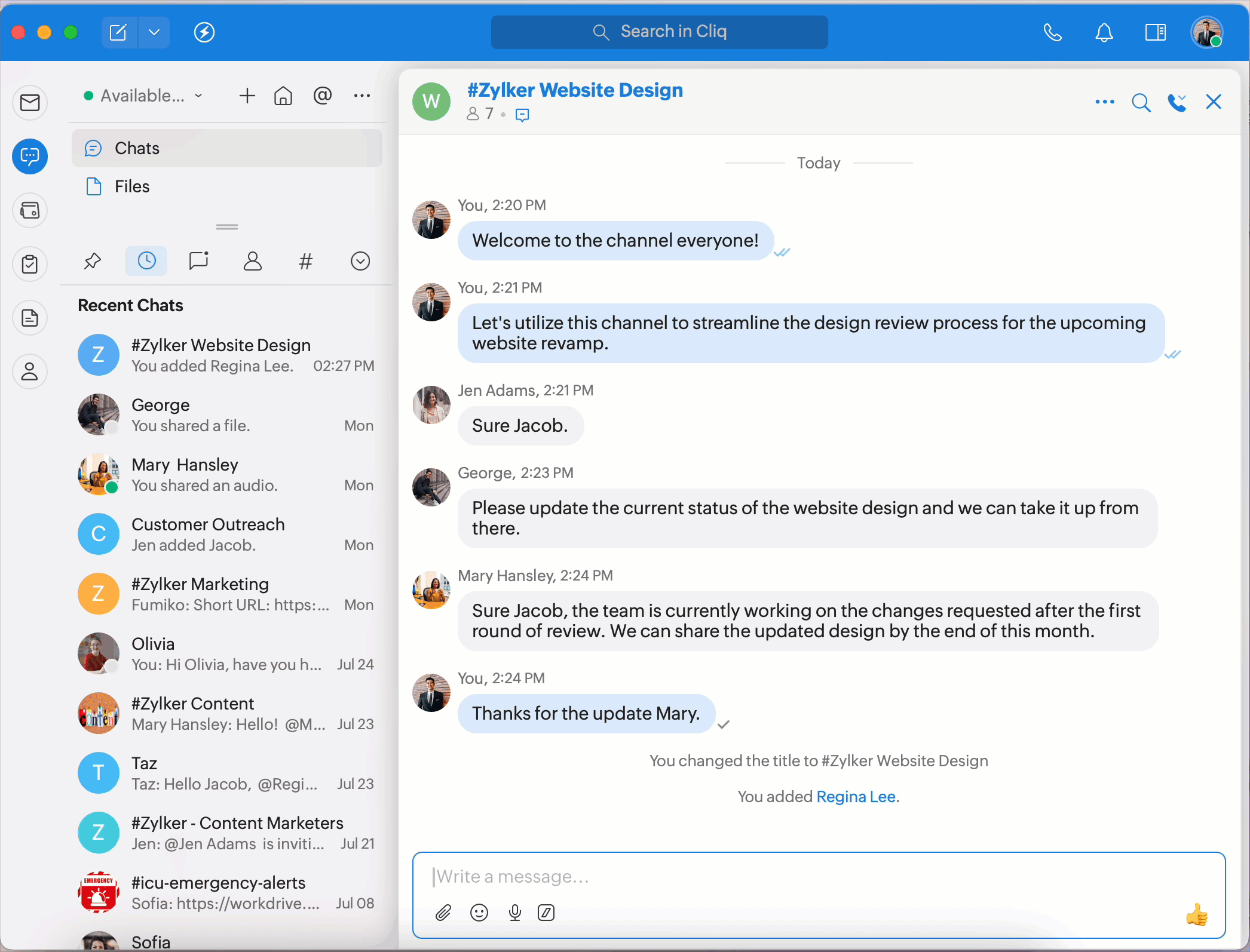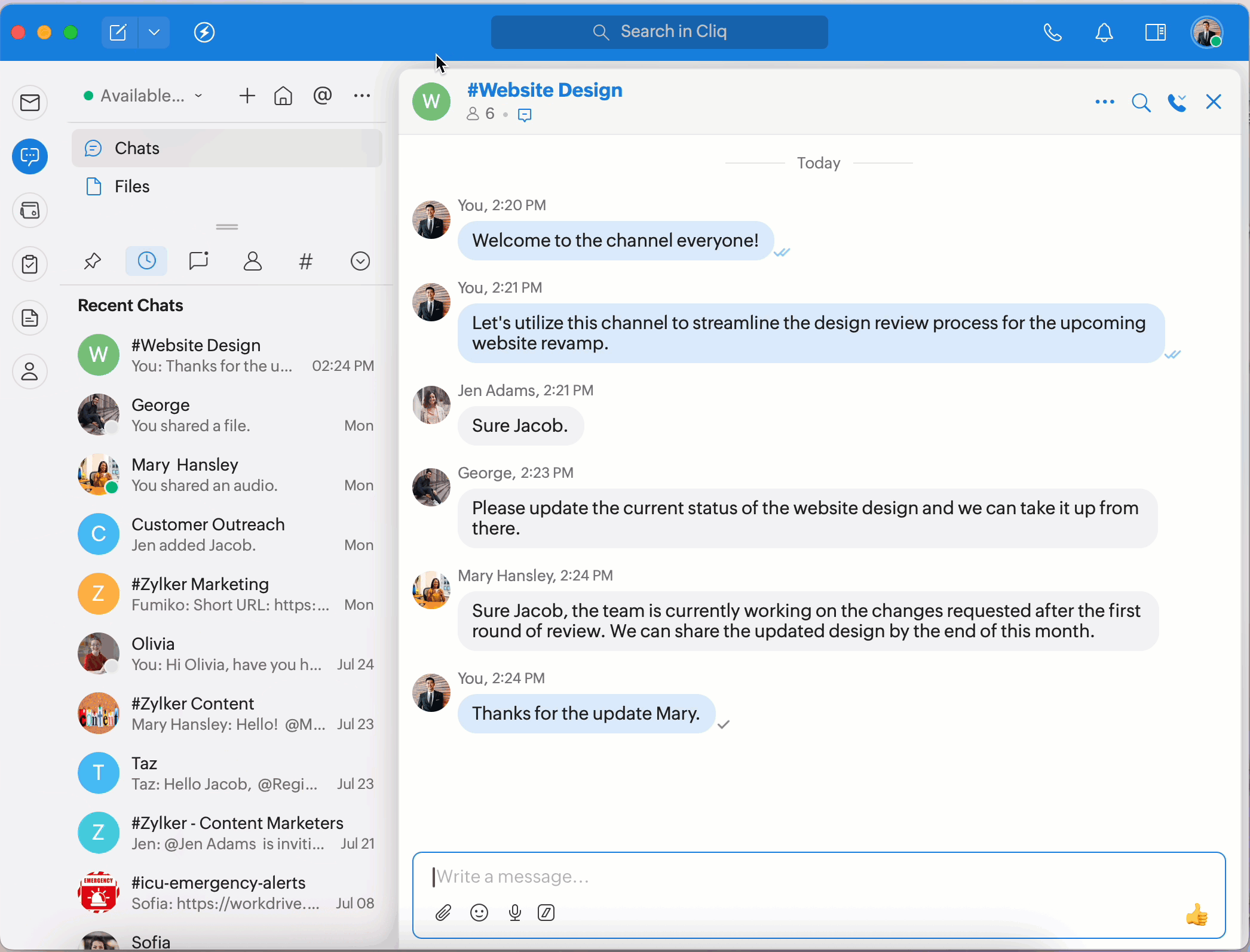 You can add bots to your channel to automate certain tasks, send notifications, and set reminders. Learn more about the available bots to add to your Cliq channel.