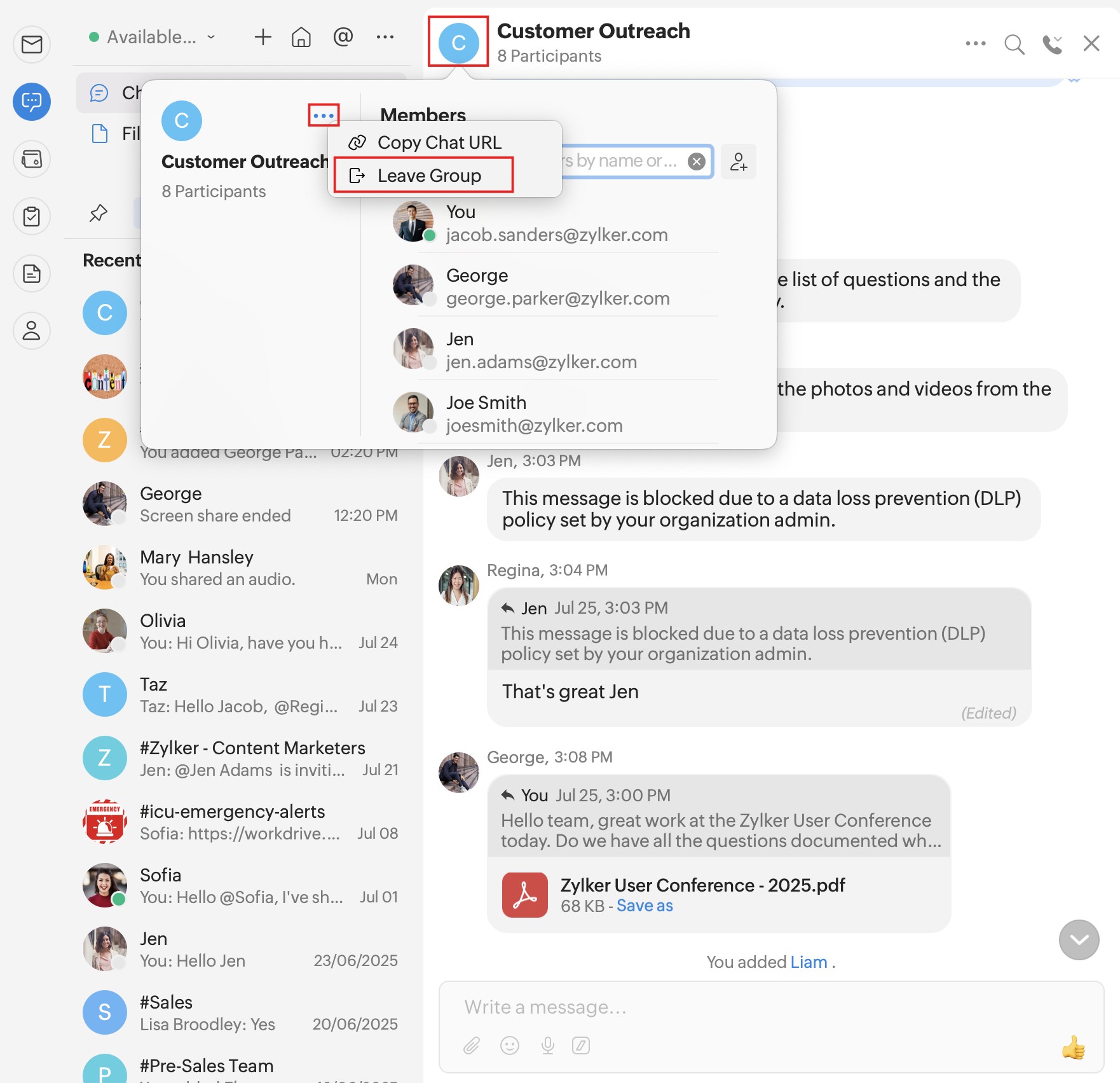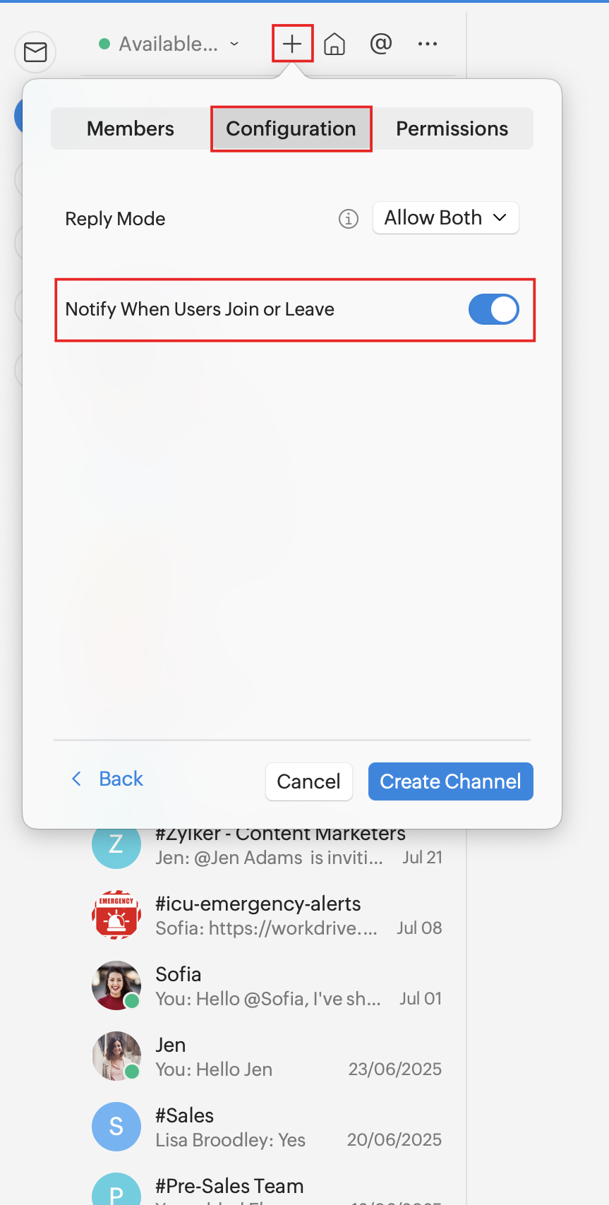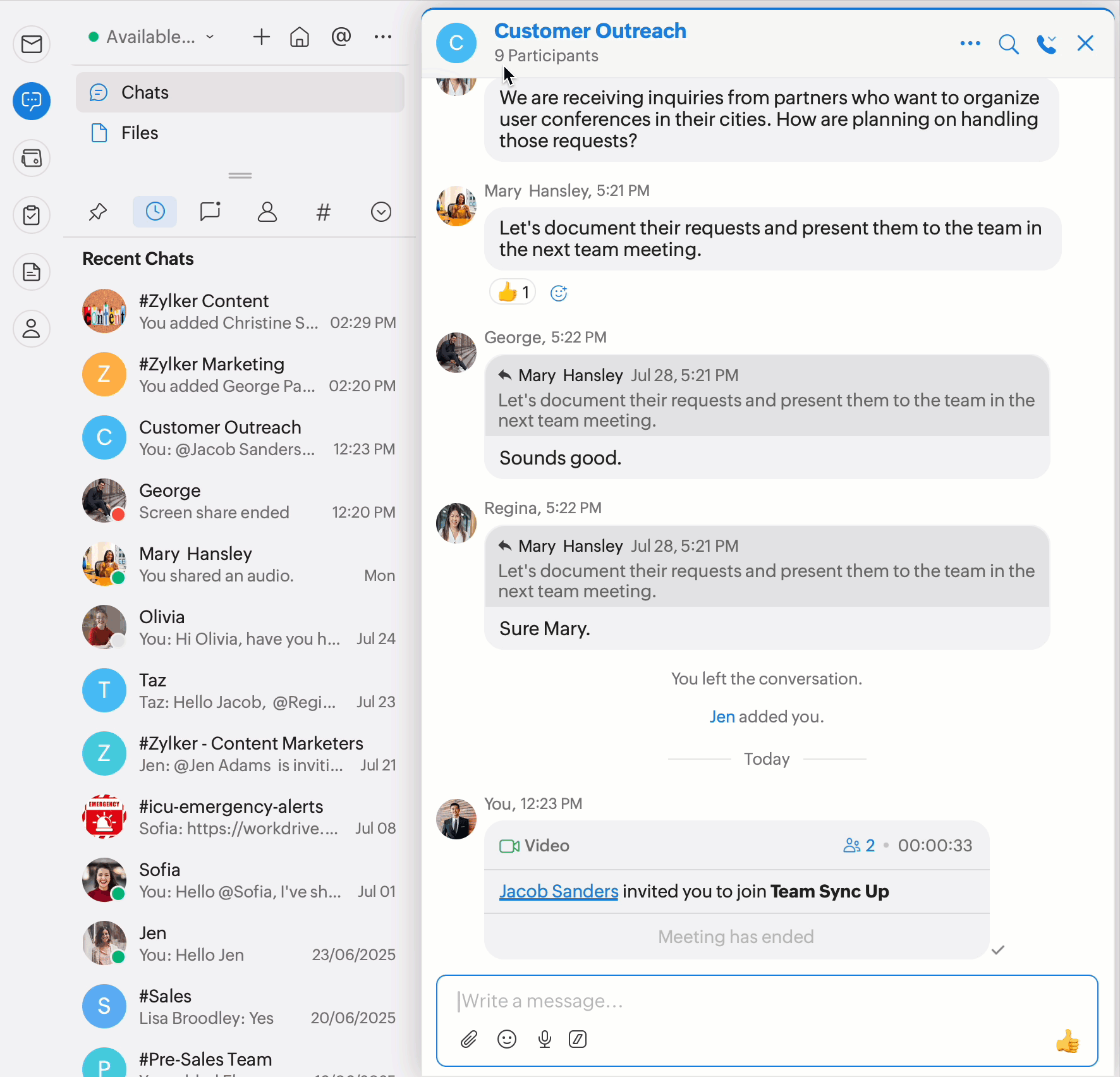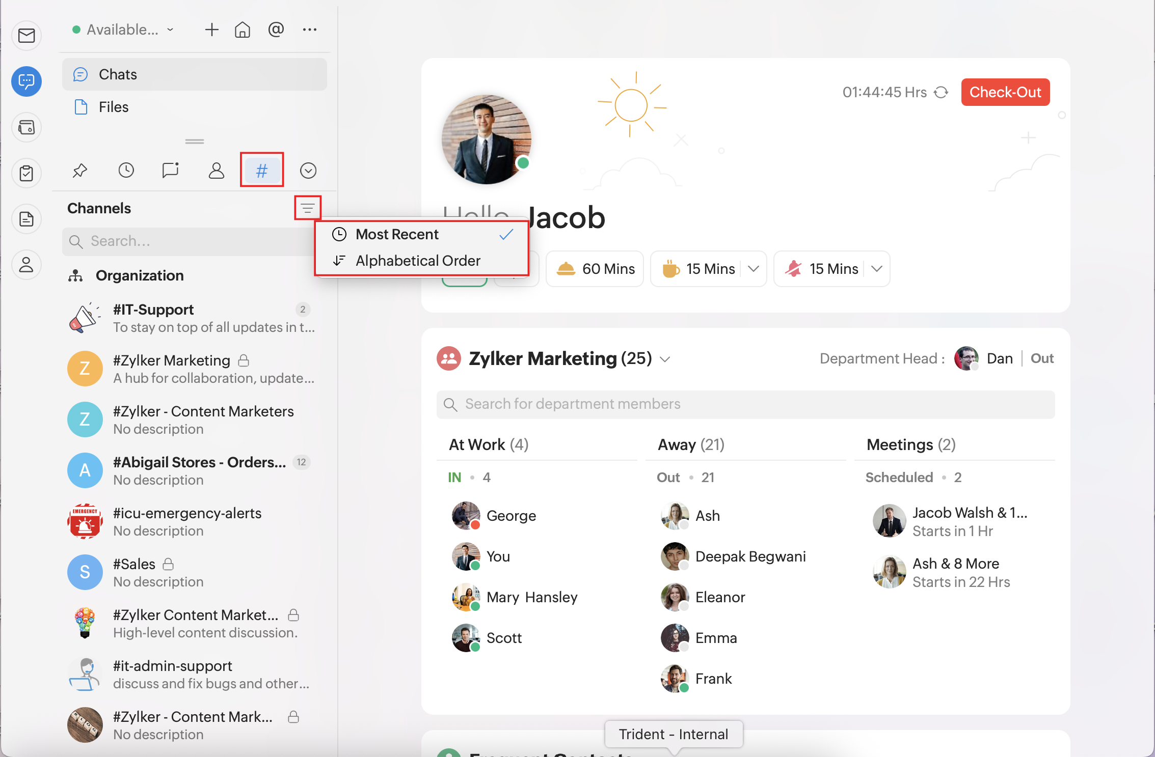 In the chat launcher tab, you can view the list of all channels you've created and are a part of. Here, you can sort channels based on channel types, recent messages, and unread chats.