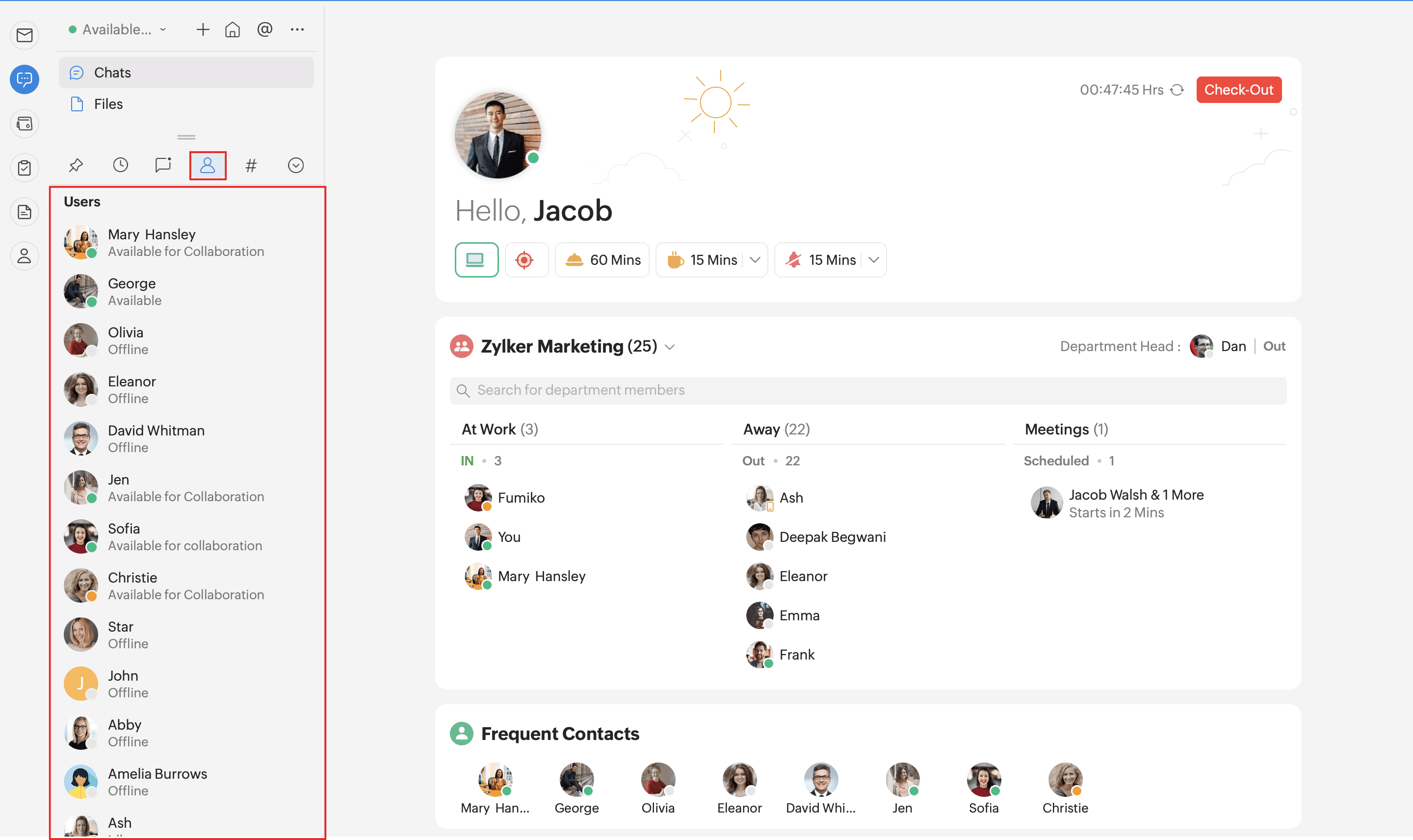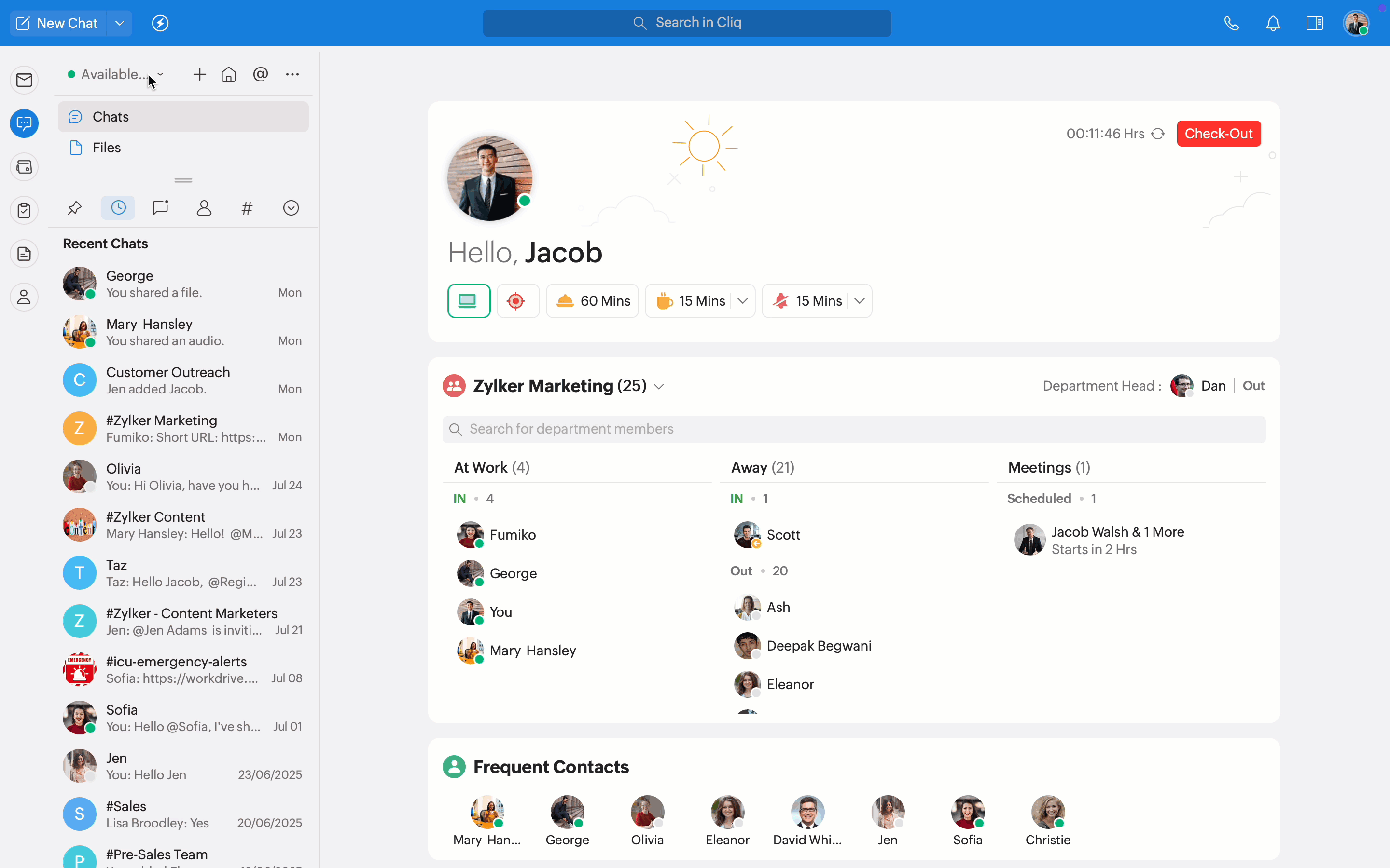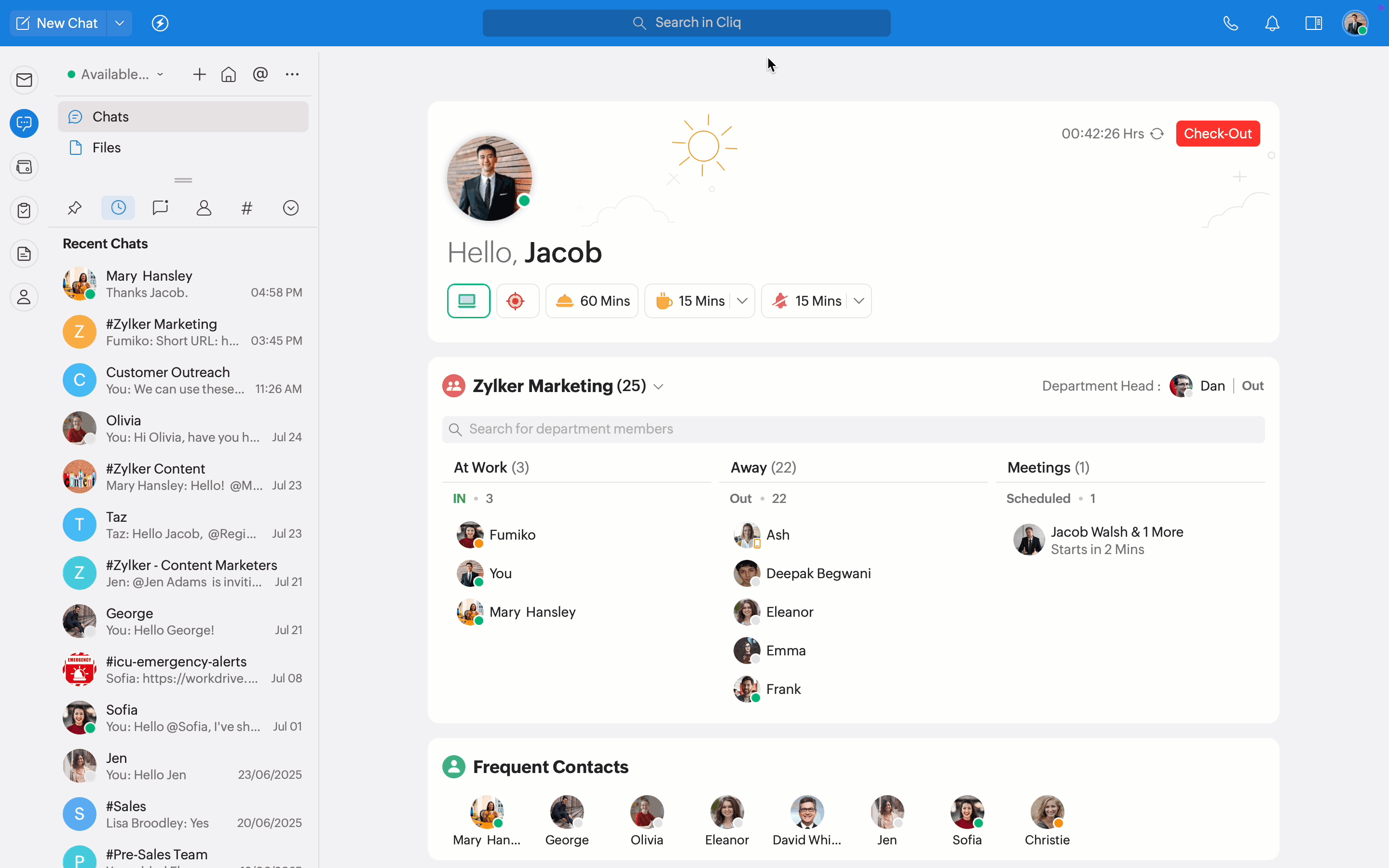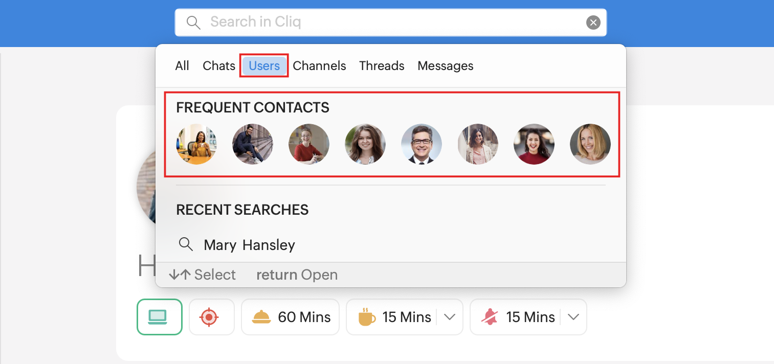 To initiate one-on-one chat with contacts or organization members using Cliq search: