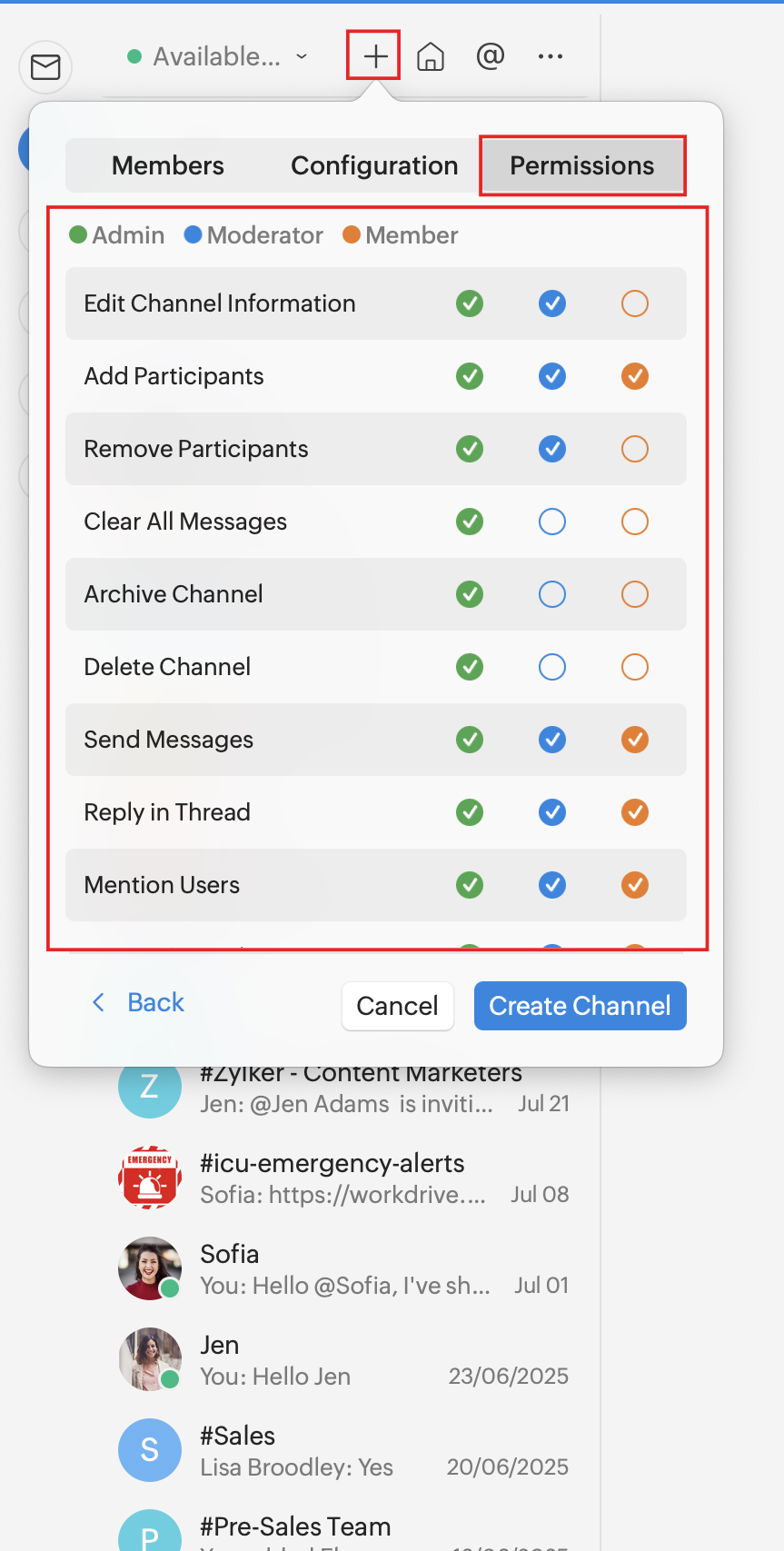 What a member can do in a channel is determined by a set of parameters known as channel permissions. These permission can be customized for each channel type. The following permissions are available when creating a channel. Check all that applies for the designated user role.