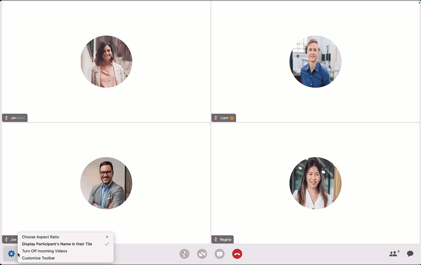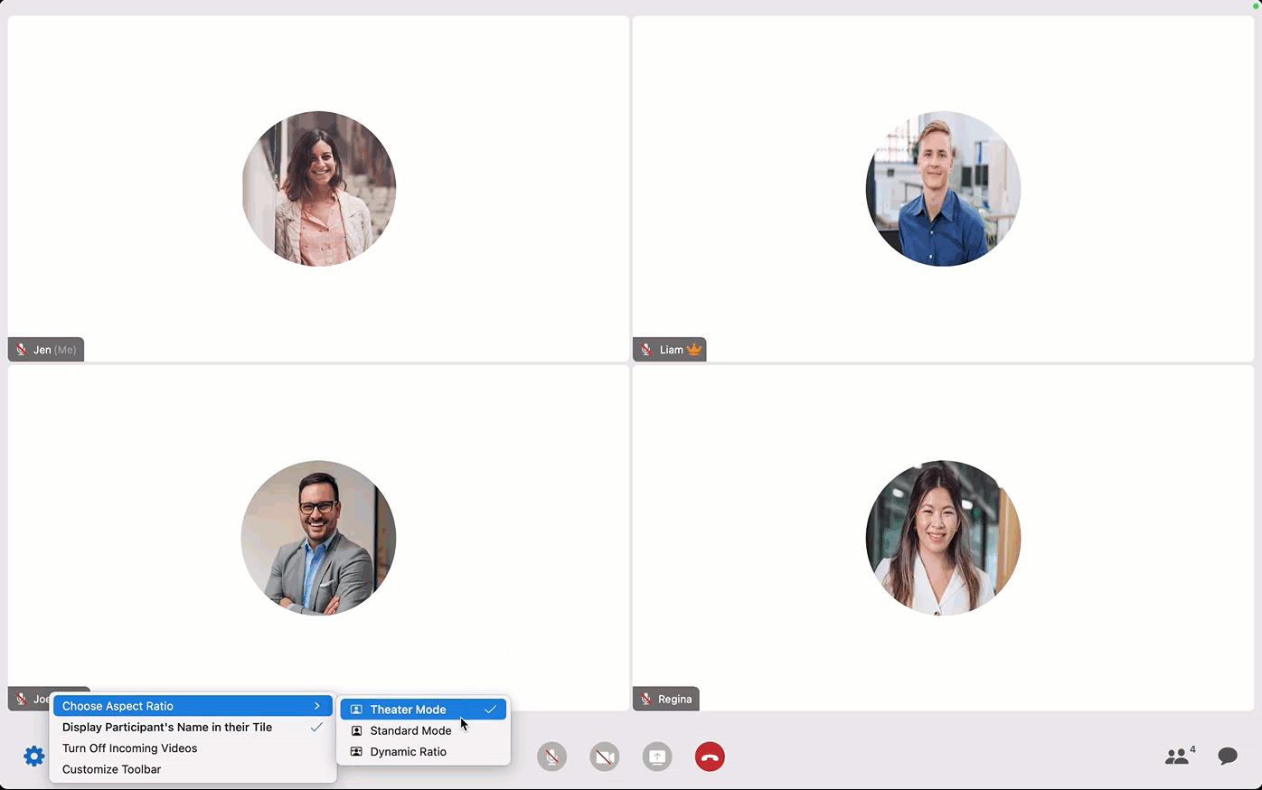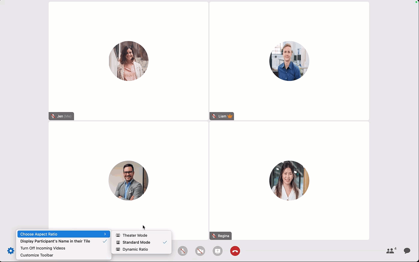 Customize the toolbar, choose to hide the participant names, turn off incoming videos, and choose aspect ratio.