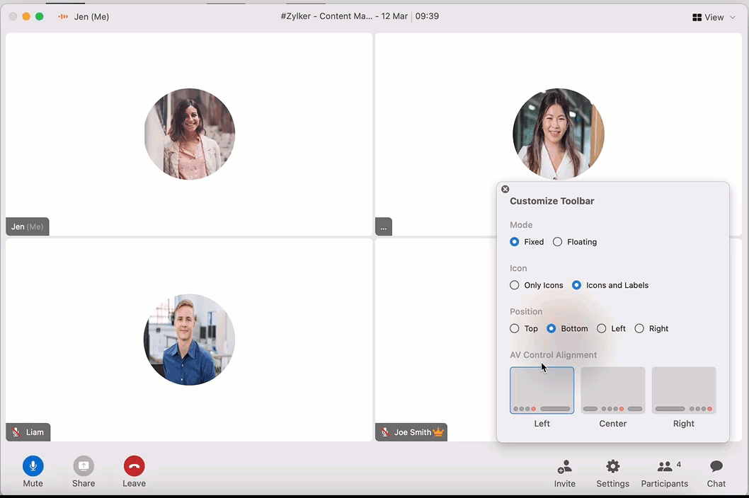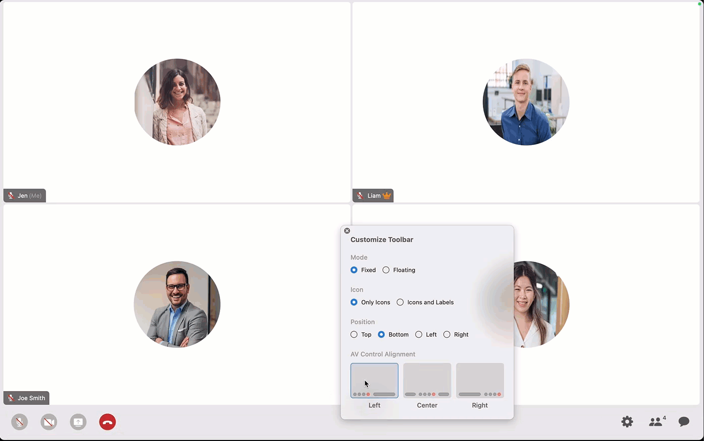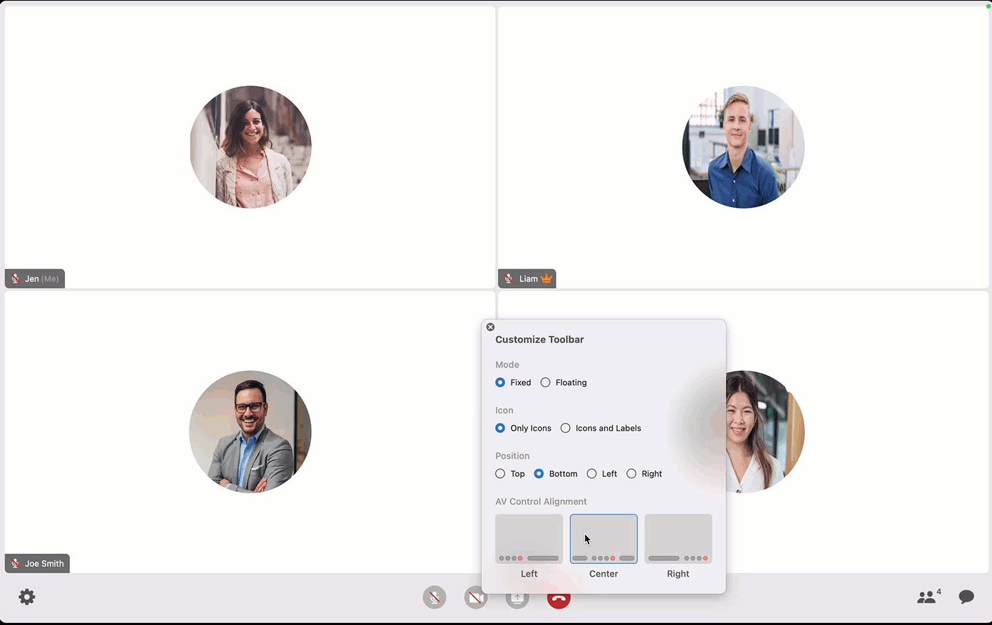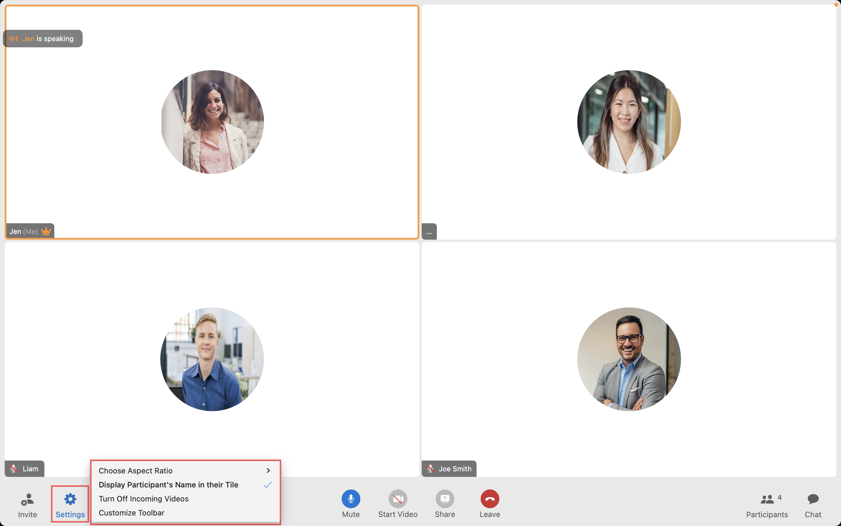 Customize the toolbar, choose to hide the participant names, turn off incoming videos, and choose aspect ratio.