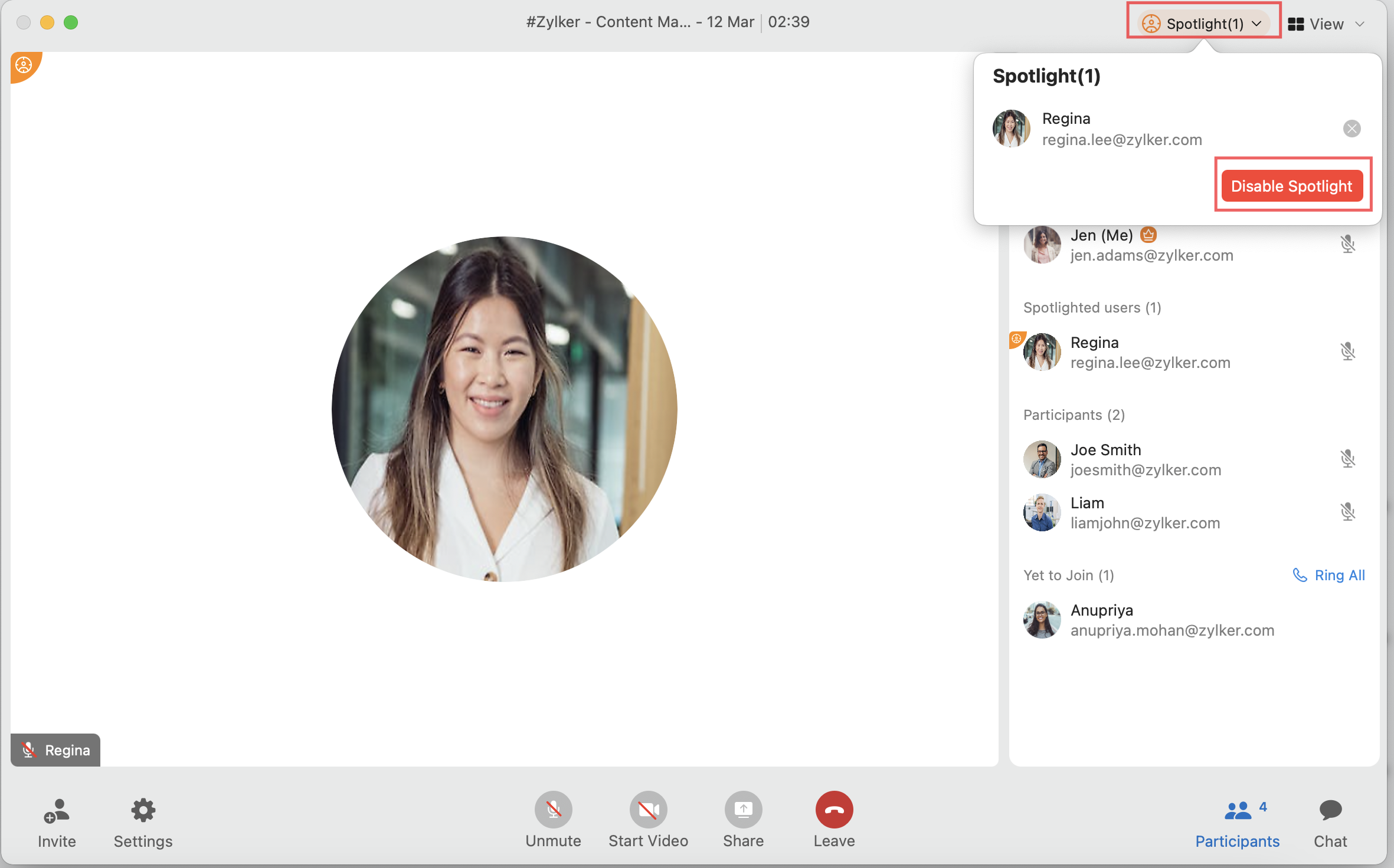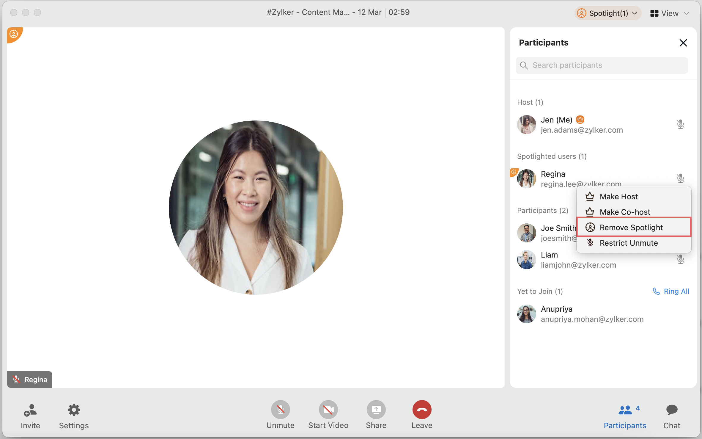 Set Spotlight | Spotlights the participant and hides all the other participant thumbnails. |
