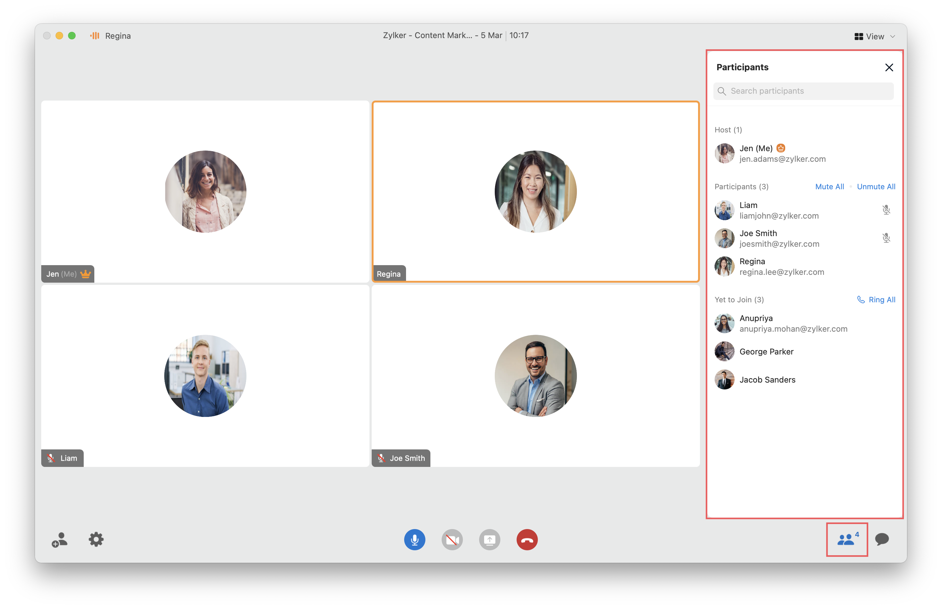 To view those who are participating in the meeting, click Participants in the toolbar. It will list the hosts, co-hosts, and participants, as well as those who are yet to join the meeting. You can use the Search Bar to look up participants.