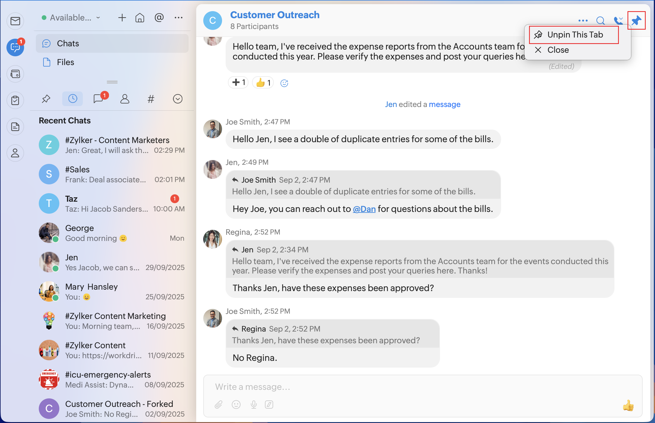 To pin a one-on-one chat, group, channel, or threaded conversation: